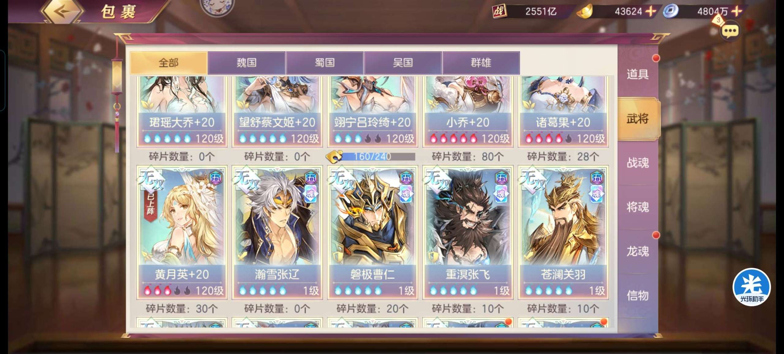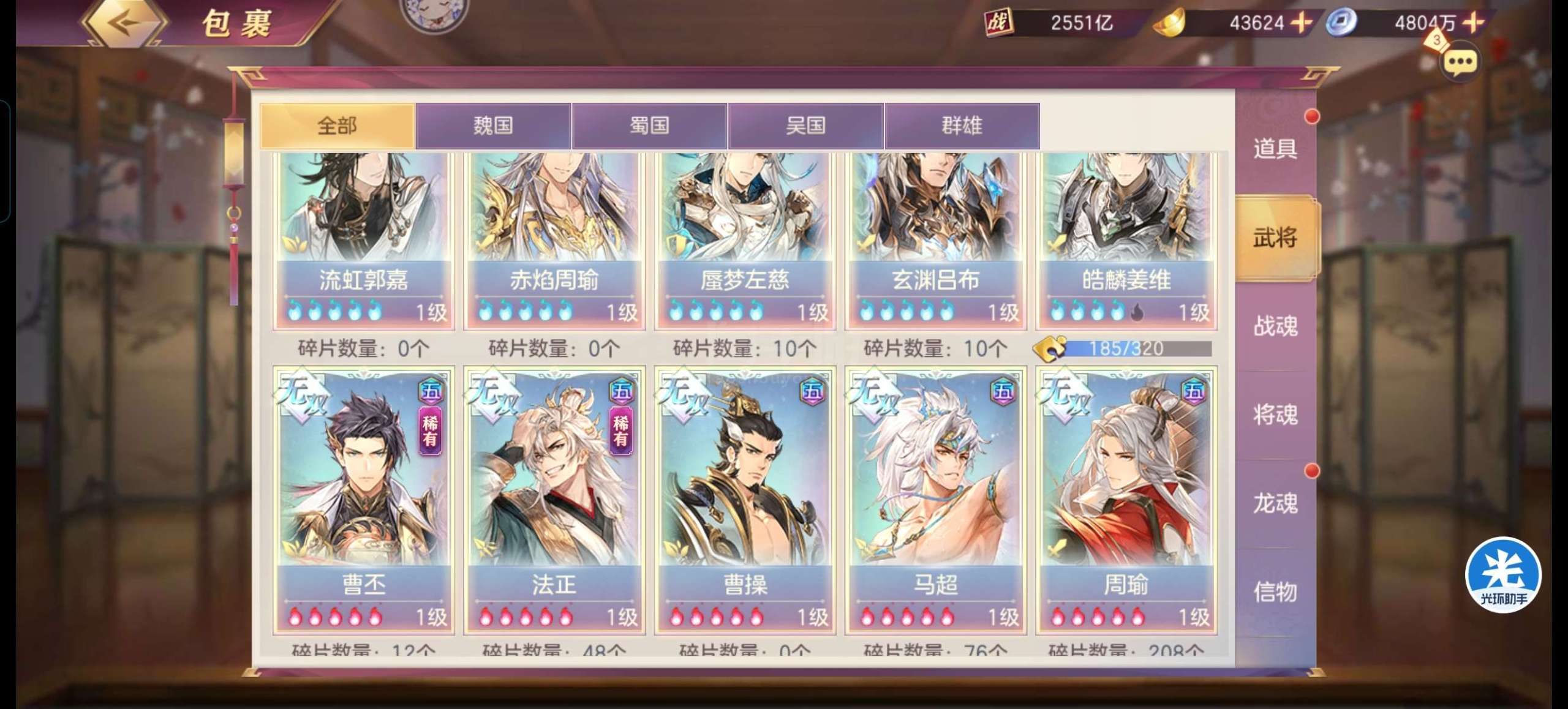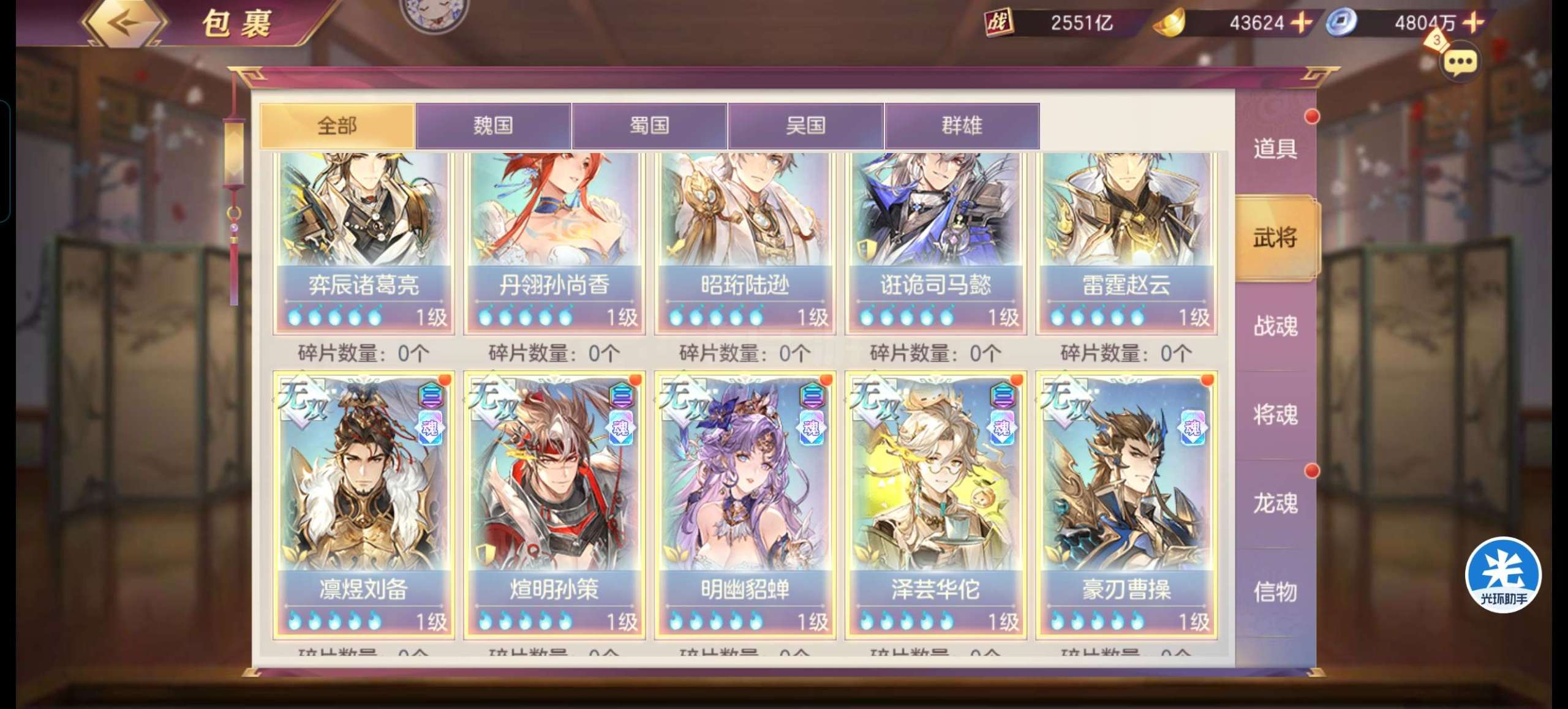 三国志幻想大陆【安卓官方】2551亿半新区氪金8.4万,九套主角时装包,可以做春节返利号,58个氪金皮肤包括,战力排名4,