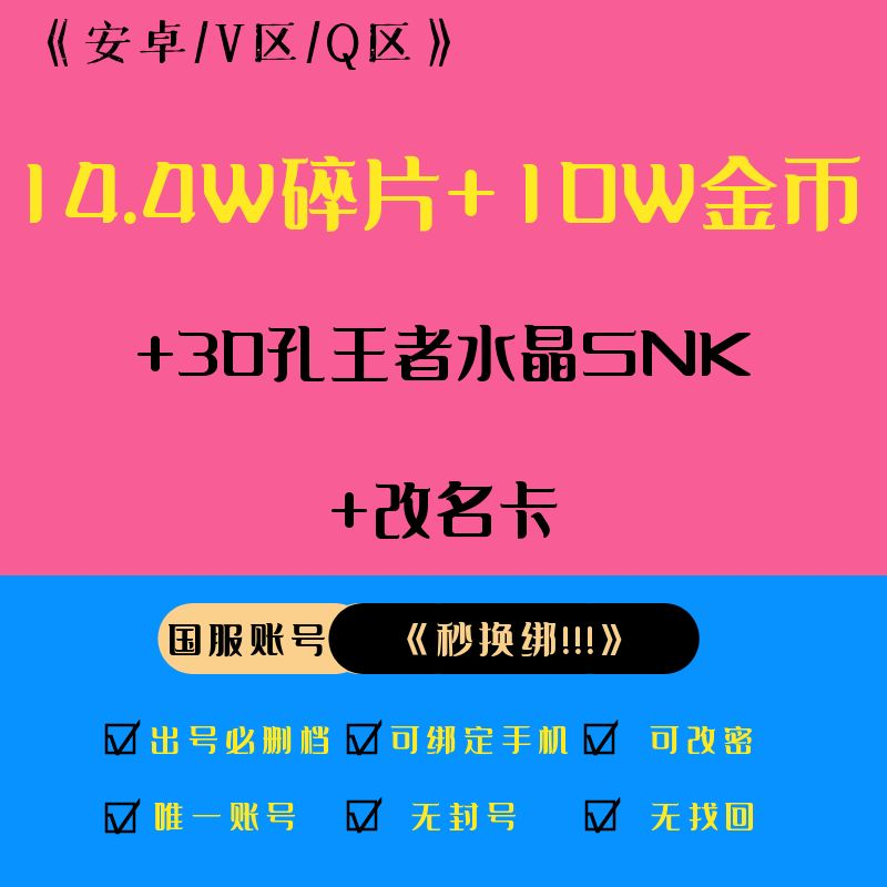王者荣耀【安卓QQ】安卓30孔王者水晶SNK+14.4万碎片10万金币改名卡
