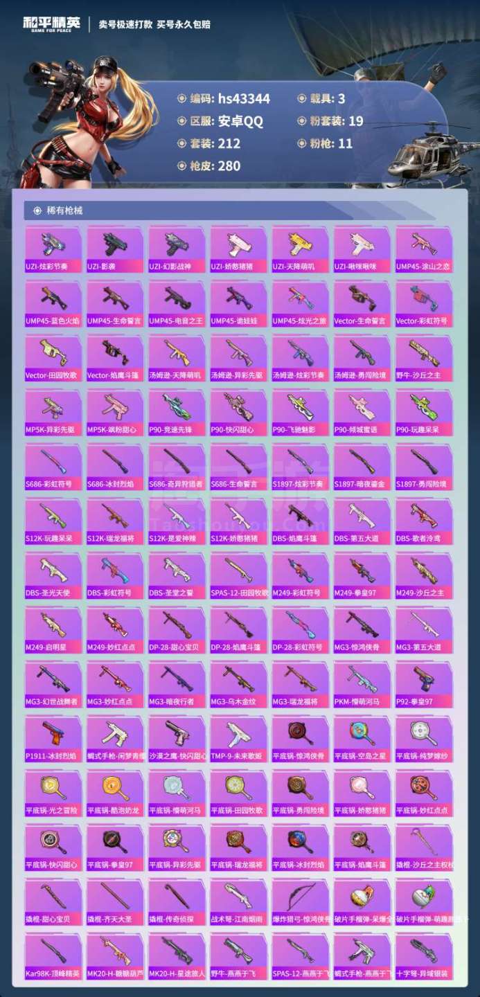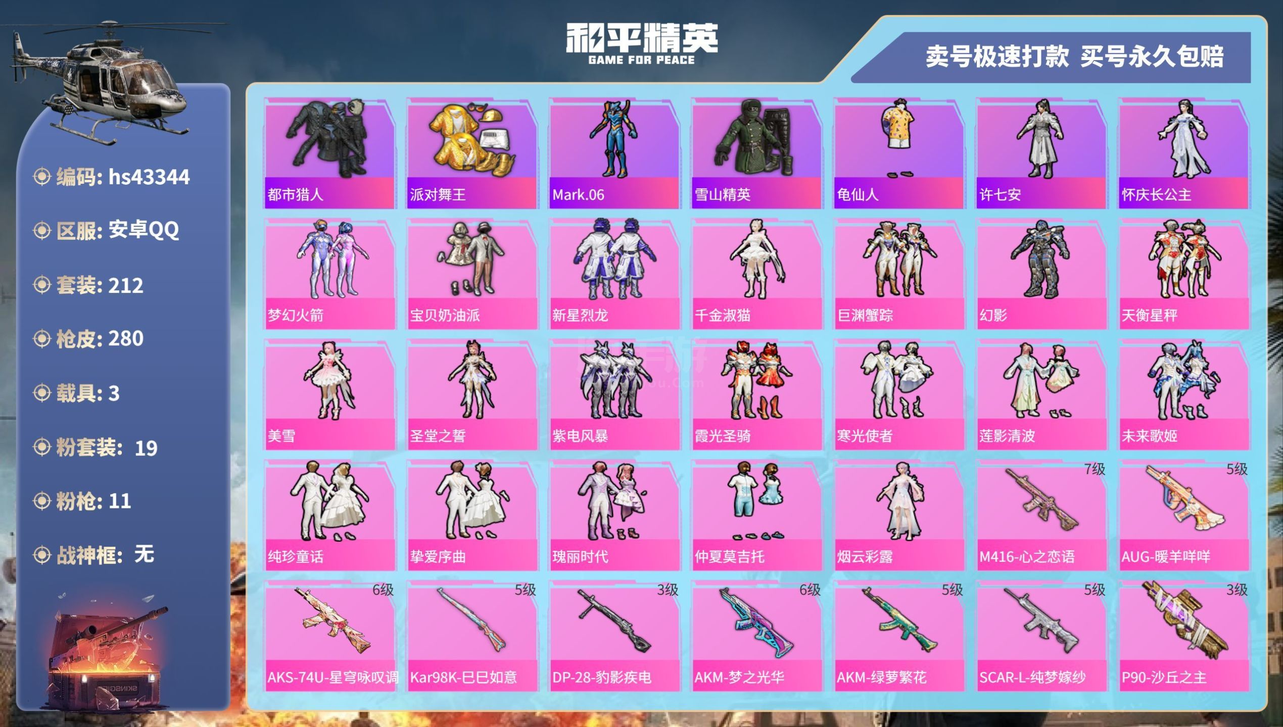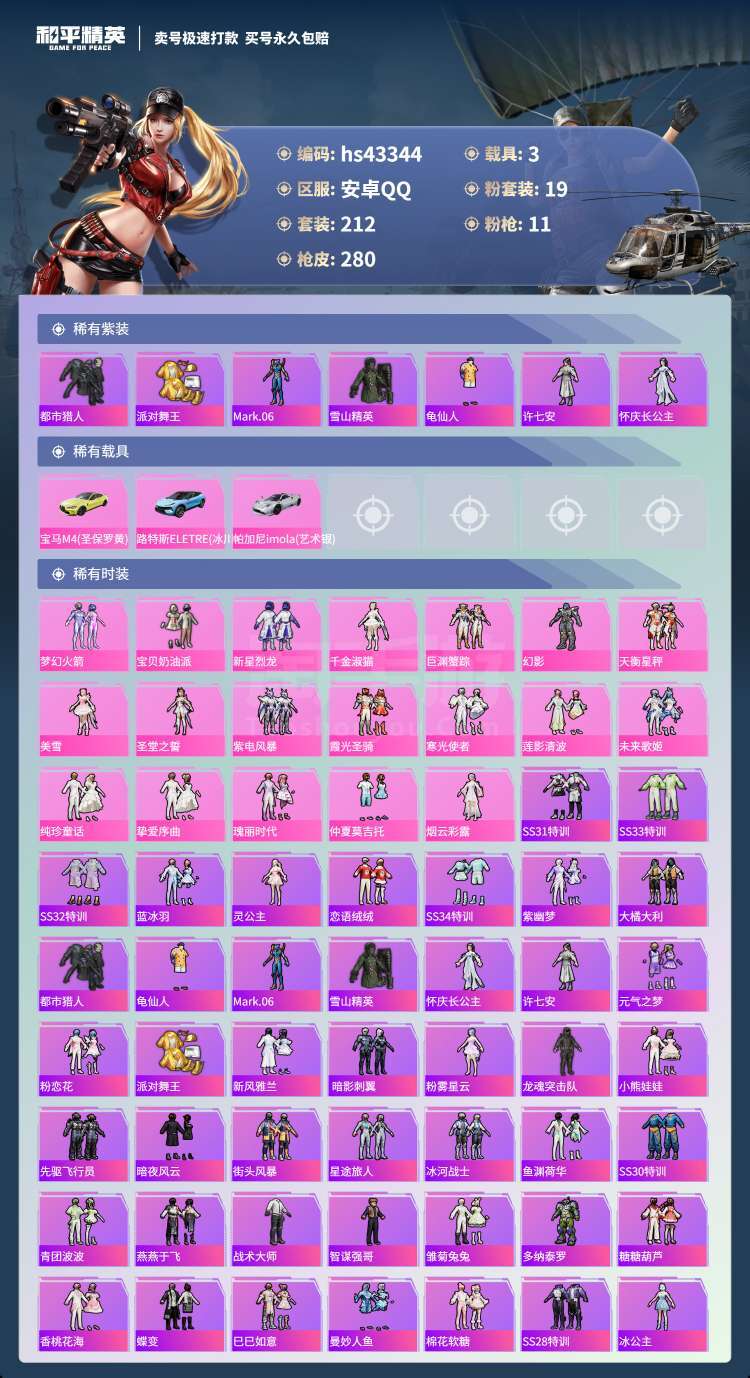 和平精英【安卓QQ】hs43344 安卓手Q-10王牌印记-19粉装-11特效枪-3载具-111065热力值-212套装