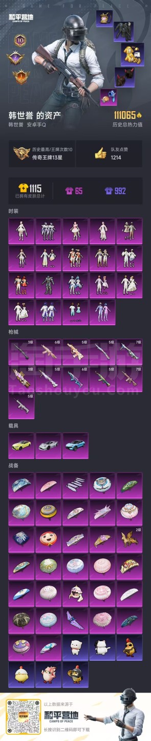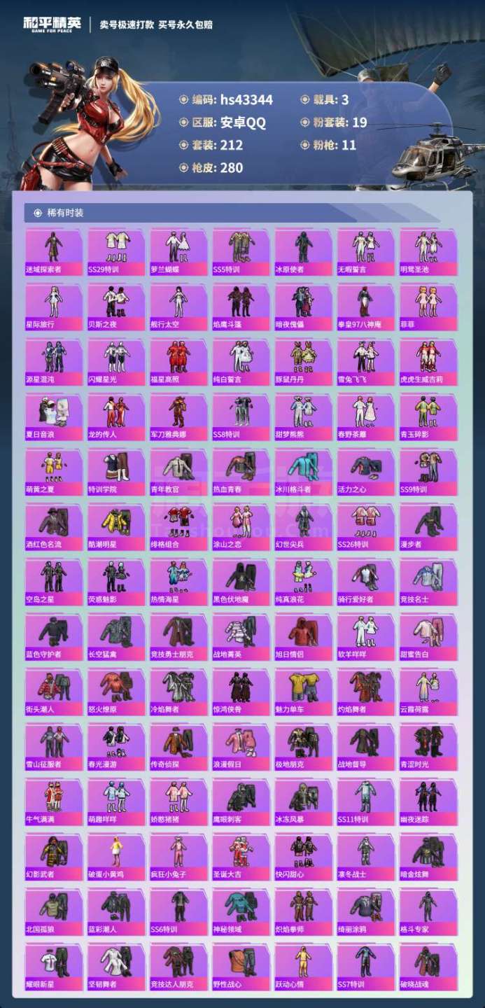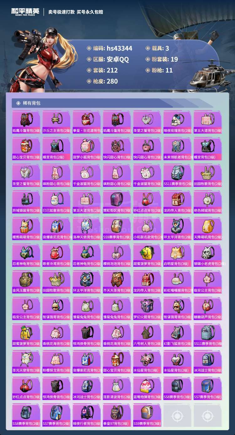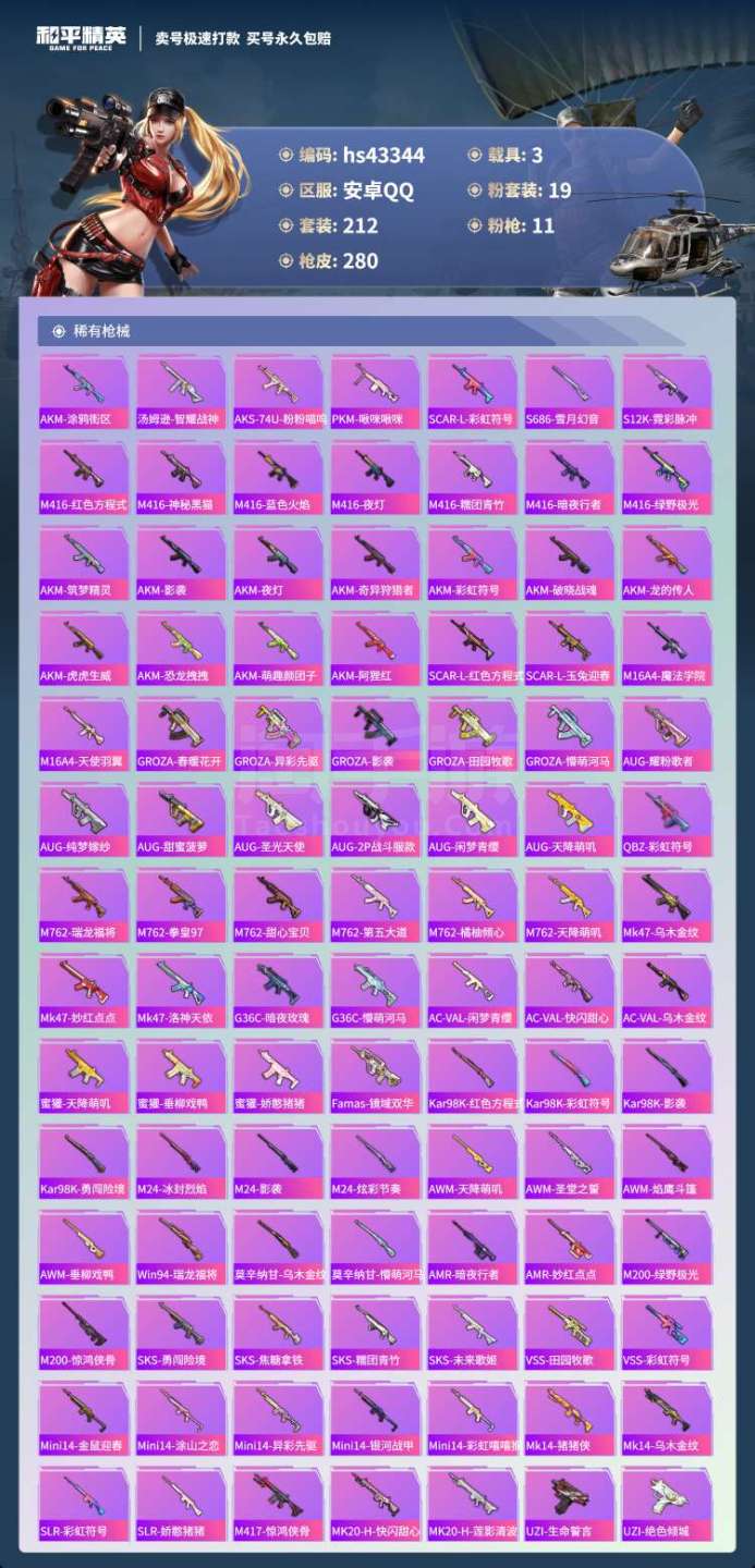 和平精英【安卓QQ】hs43344 安卓手Q-10王牌印记-19粉装-11特效枪-3载具-111065热力值-212套装