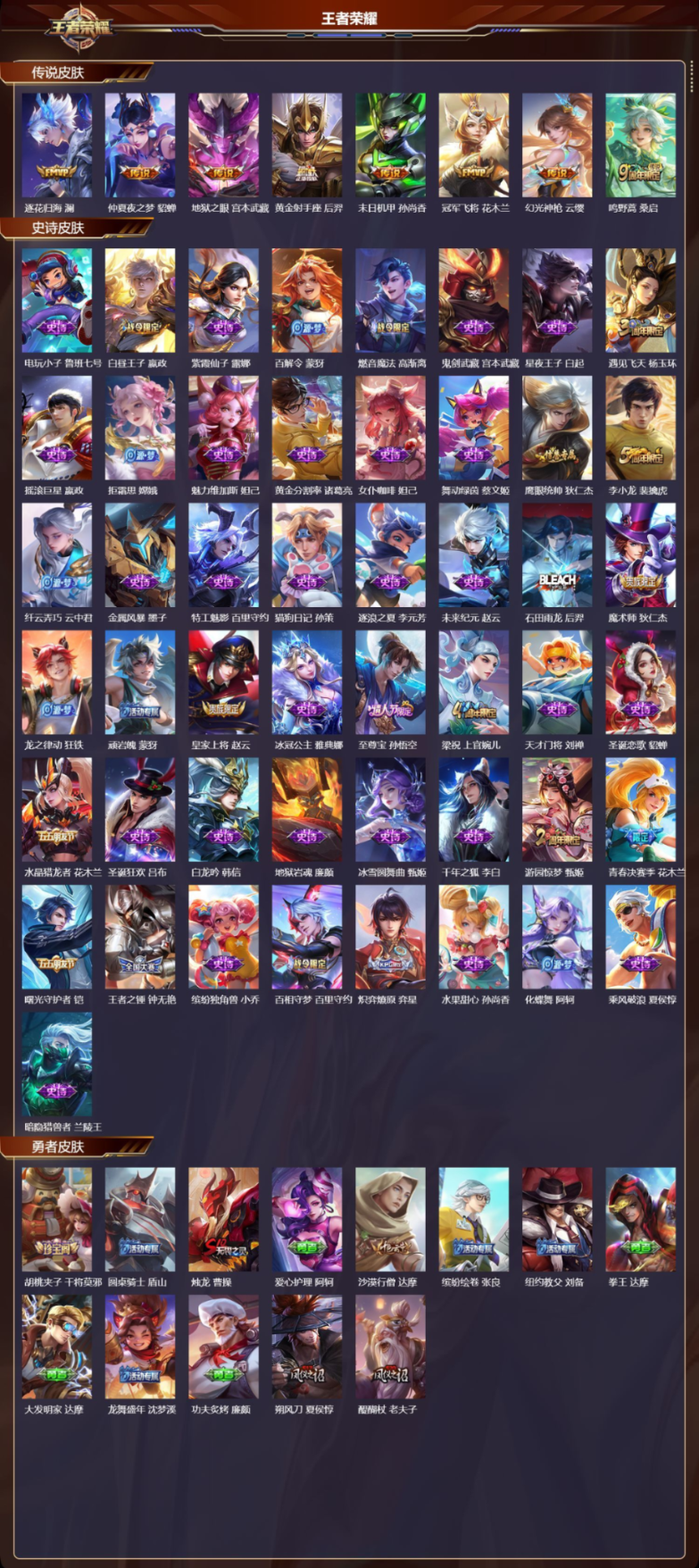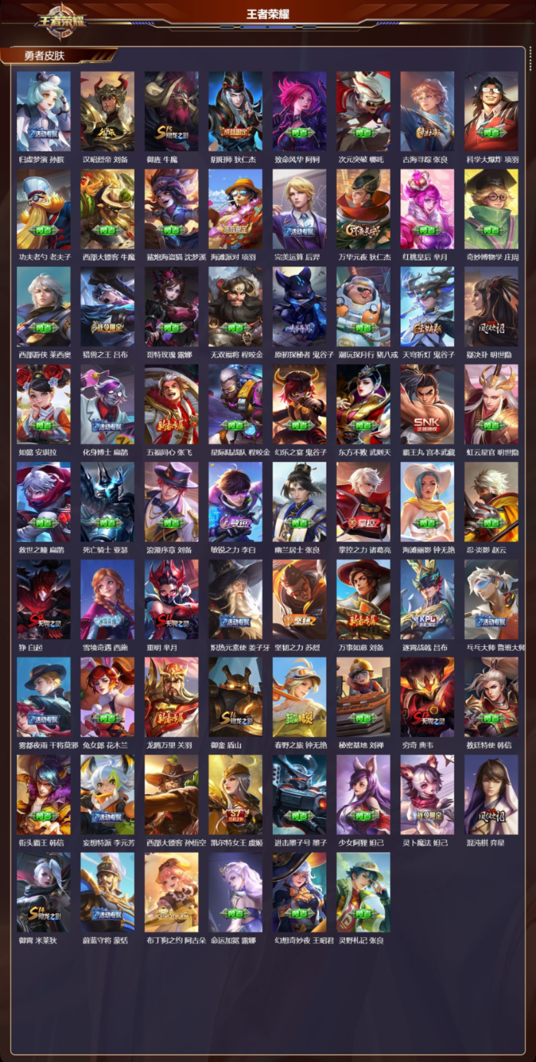 肤-安卓QQ-可二次/至尊星耀/218皮肤/124英雄/逐花归海 澜,仲夏夜之梦 貂蝉,地狱之眼 宫本武藏,黄金射手座 后羿,末日机甲 孙尚香,冠军飞将 花木兰,幻光神枪 云/8传说/49史诗/9稀有英雄