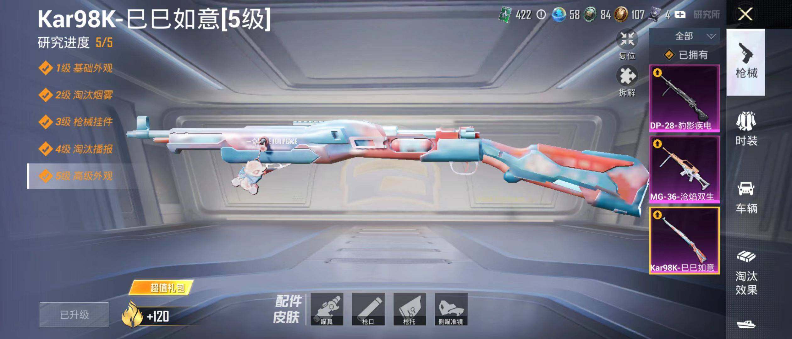 【粉色枪皮等级】:Kar98K-巳巳如意(五级),DP-28-豹影疾电(五级),MG-36-沧焰双生(四级)