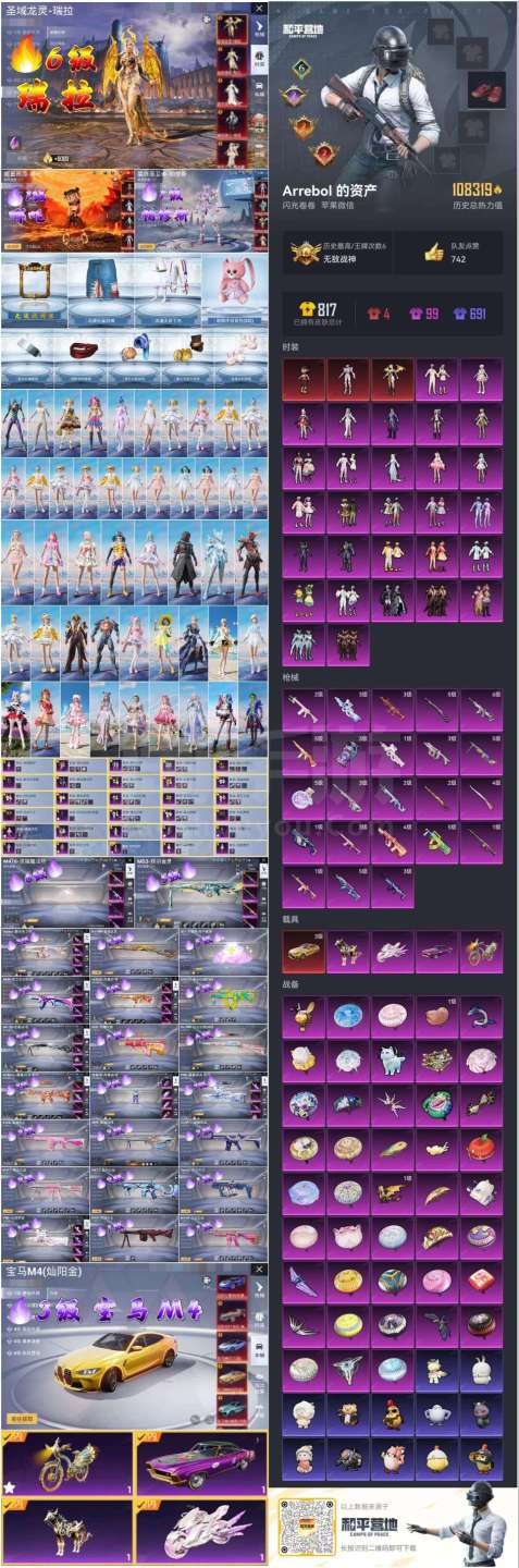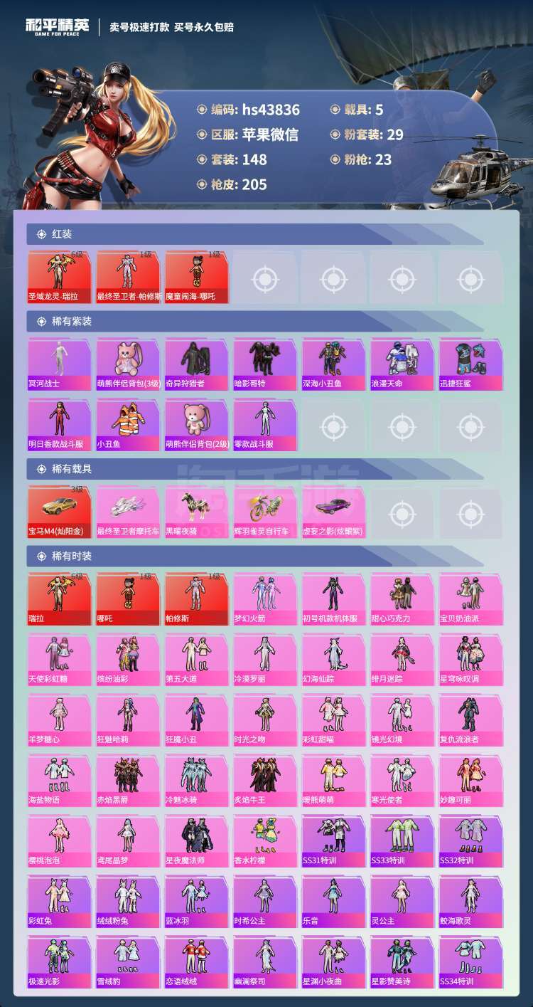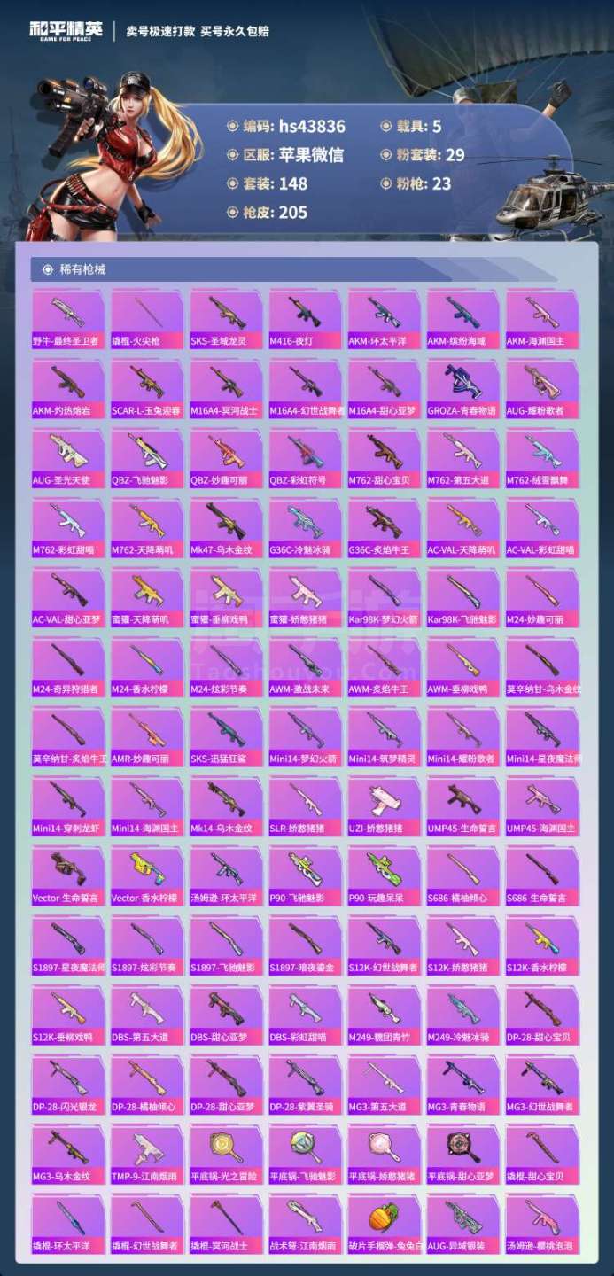 hs43836 苹果微-6王牌印记-有战神框-29粉装-23特效枪-5载具-108319热力值-1