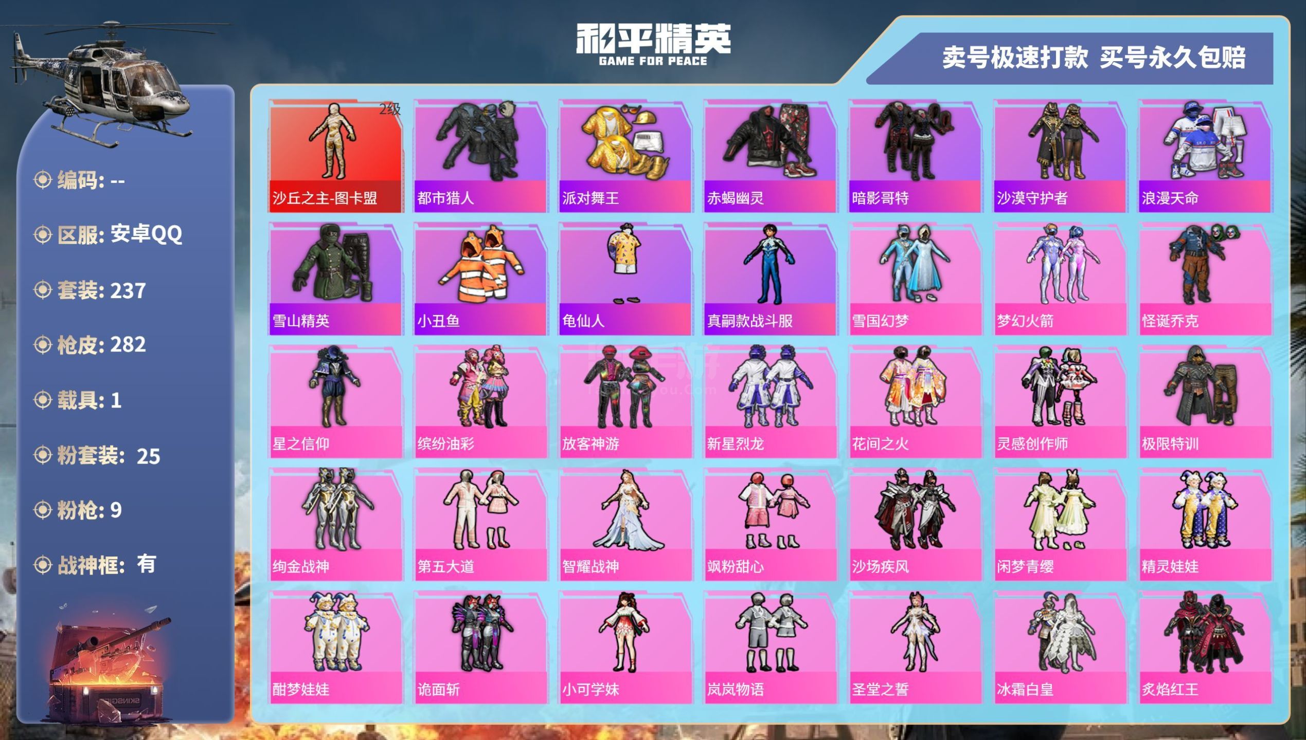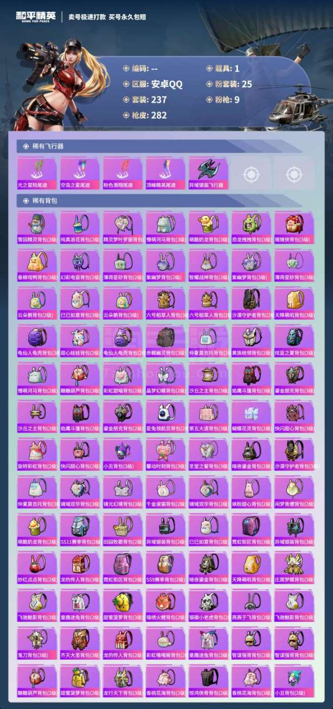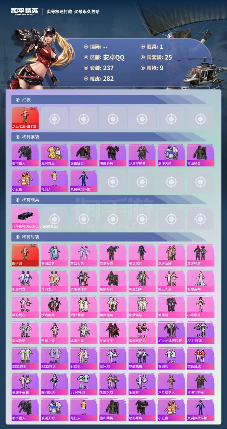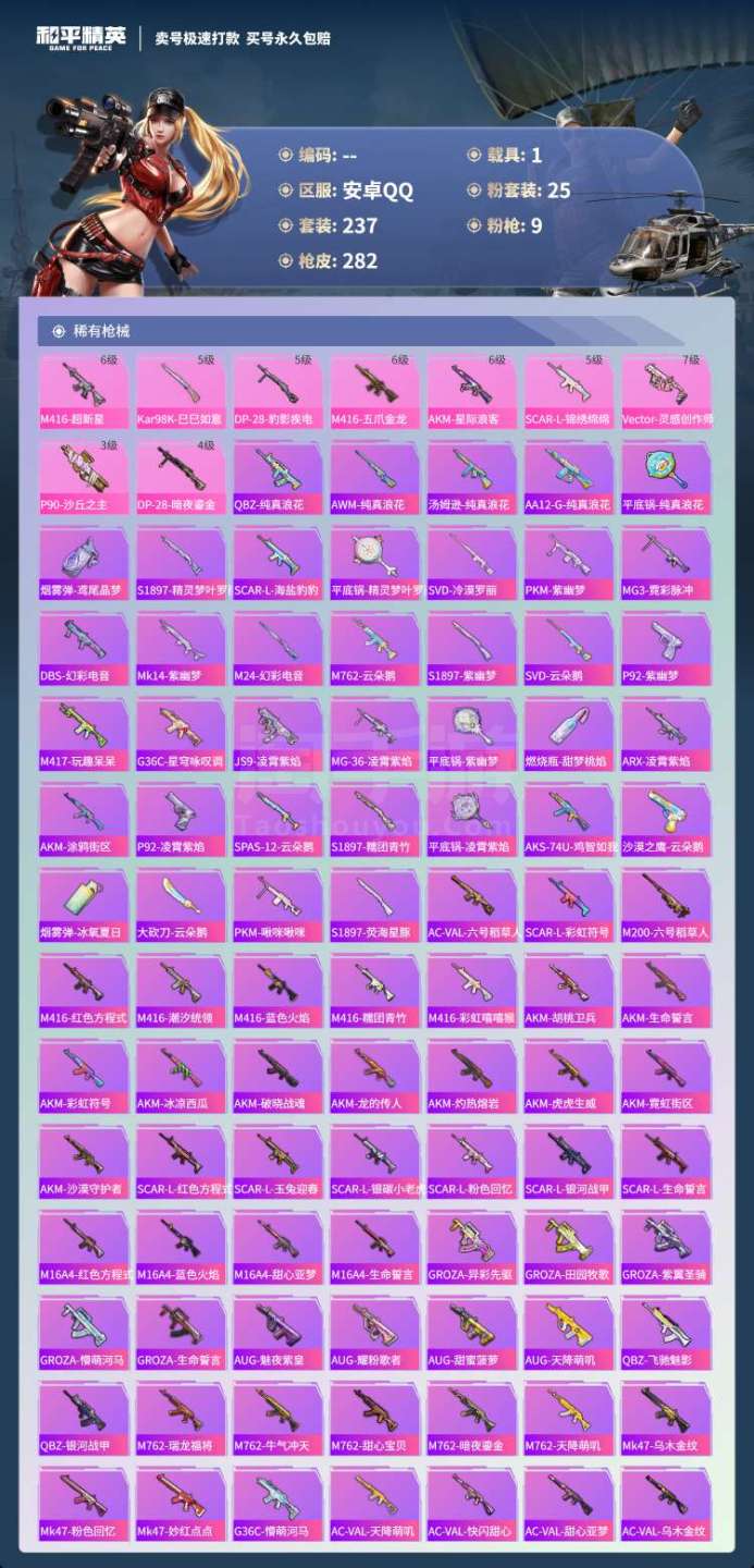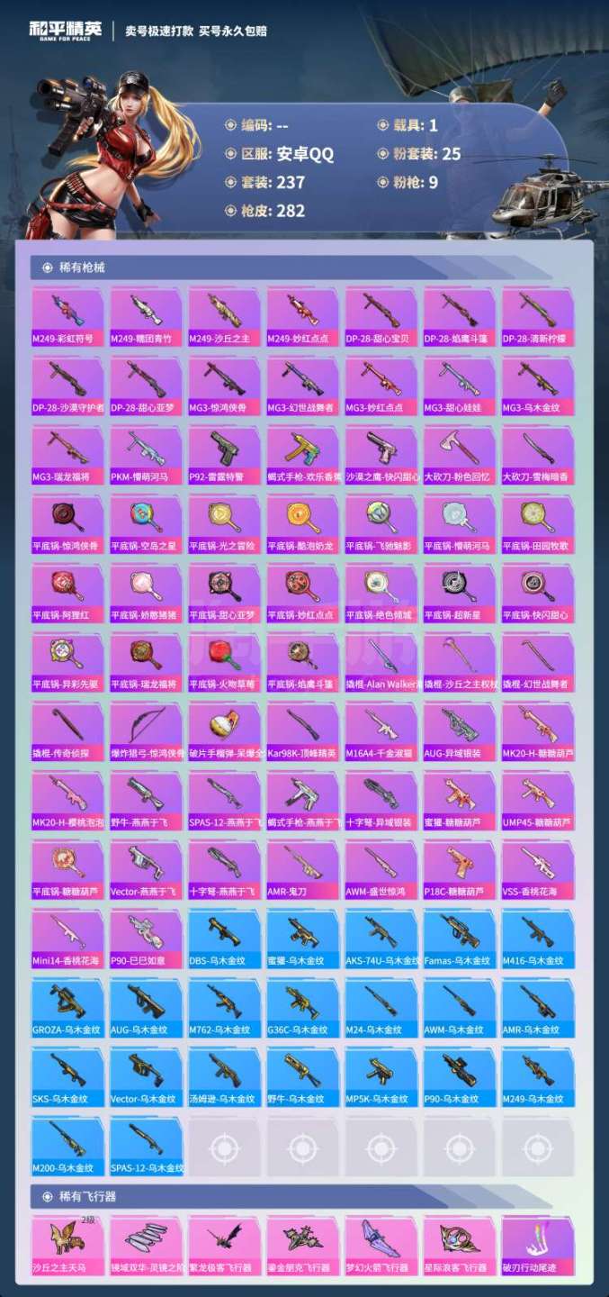 hs43520 安卓手Q-18王牌印记-有战神框-25粉装-9特效枪-1载具-103726热力值-2