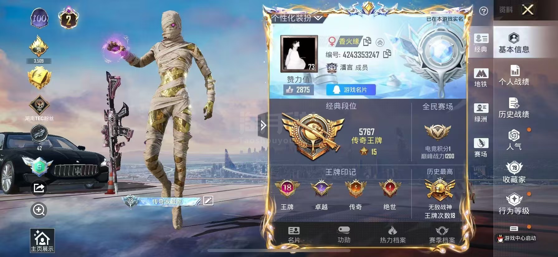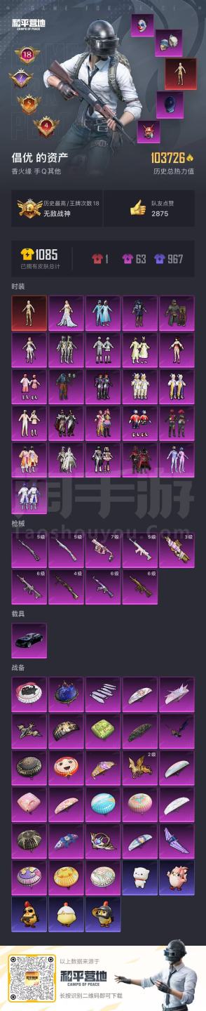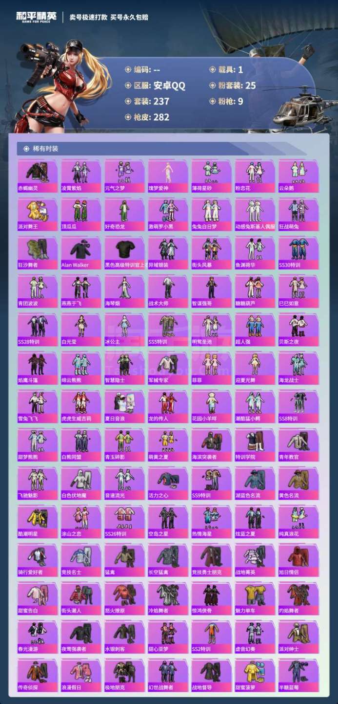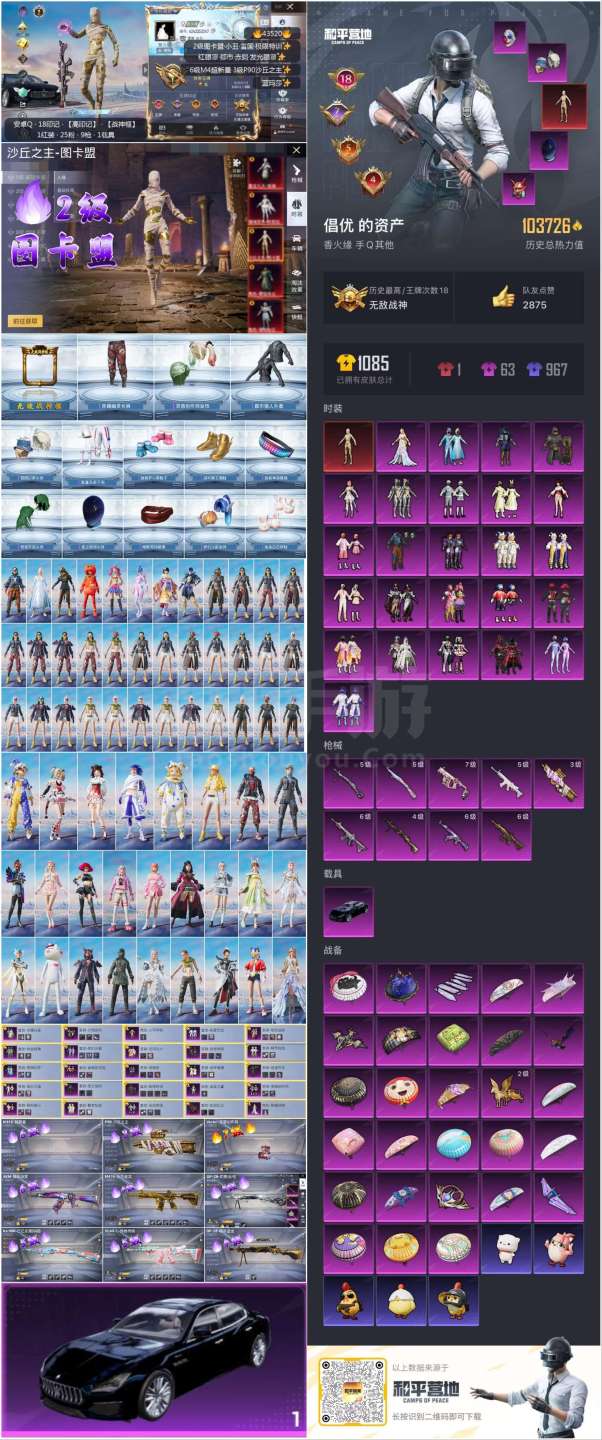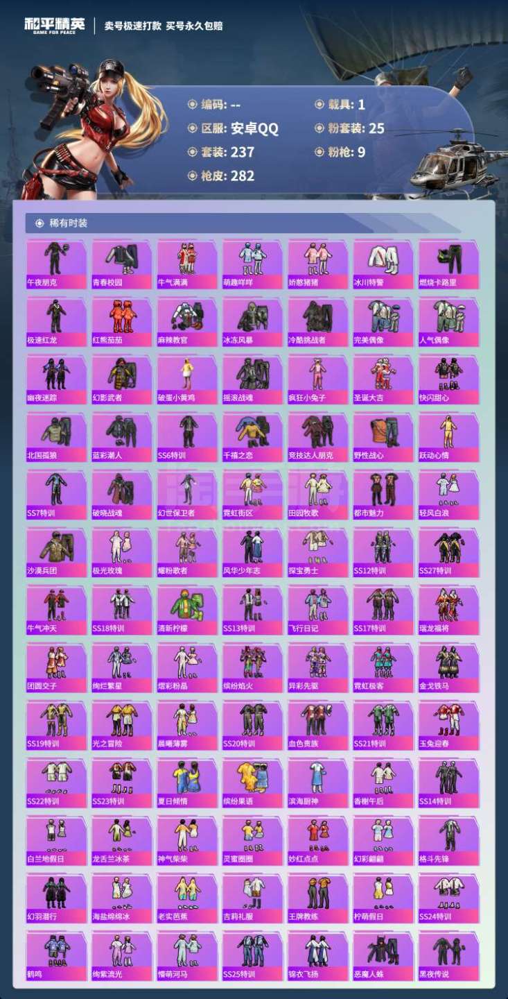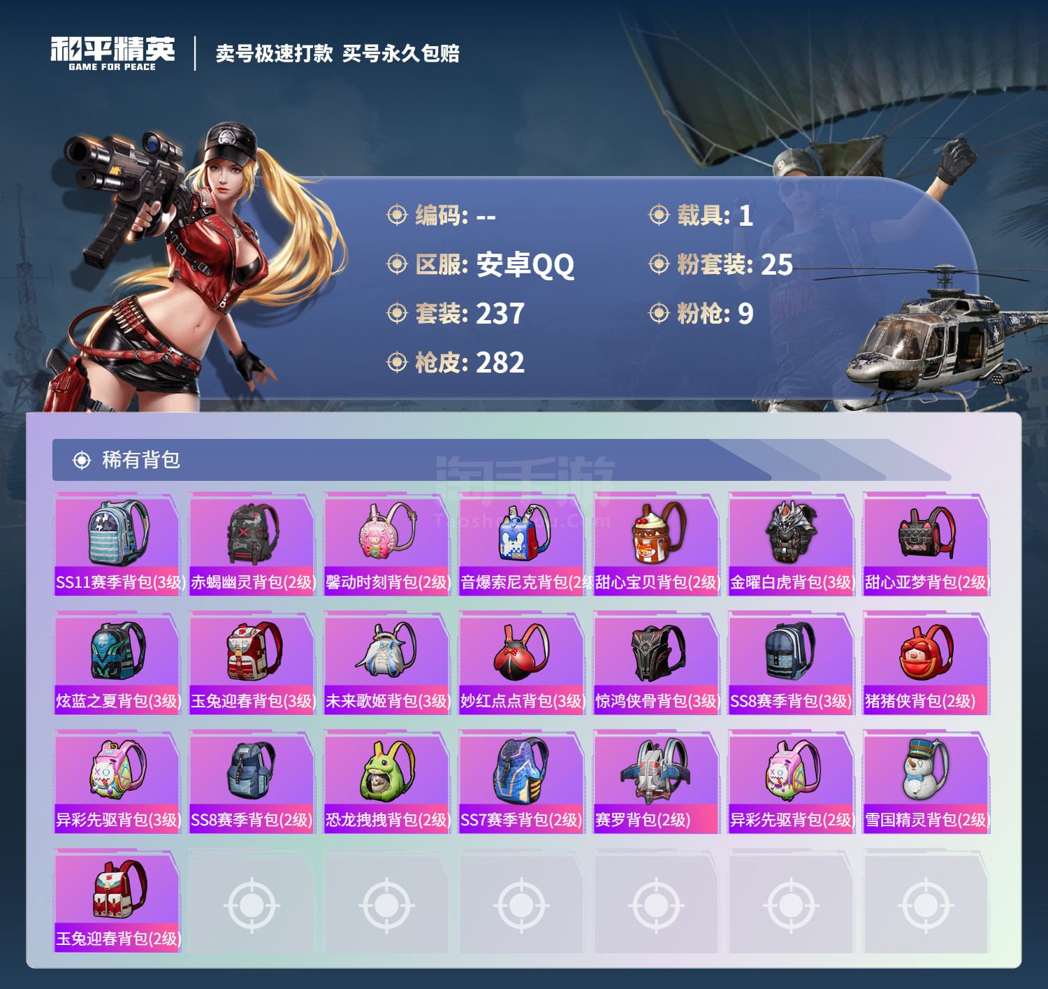 hs43520 安卓手Q-18王牌印记-有战神框-25粉装-9特效枪-1载具-103726热力值-2