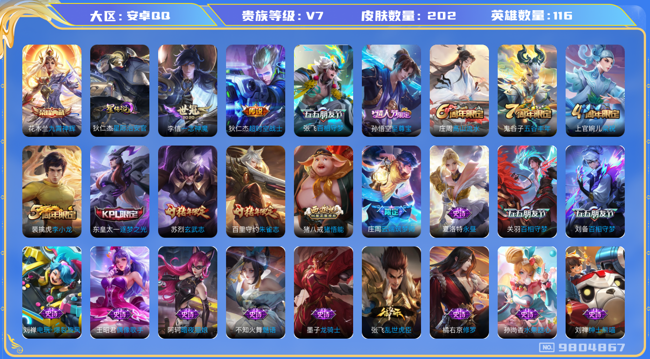 营地账号:341129940/【9804867】[9804867]实名: 可修改 性别: 男号 贵族等级: V7 英雄数: 116 皮肤数: 202 荣耀水晶: 九霄神辉 星传说: 星际治安官 传说皮: 一念神魔,超时空战士-狄仁杰,百相守梦(张飞) 限定皮: 李小龙,梁祝,云端筑梦师,逐梦之光,玄武志,朱雀志,至尊宝,高山流水,猪悟能,五谷丰年 亮点: 【店长推荐精品号】6王者印记,花木兰荣耀