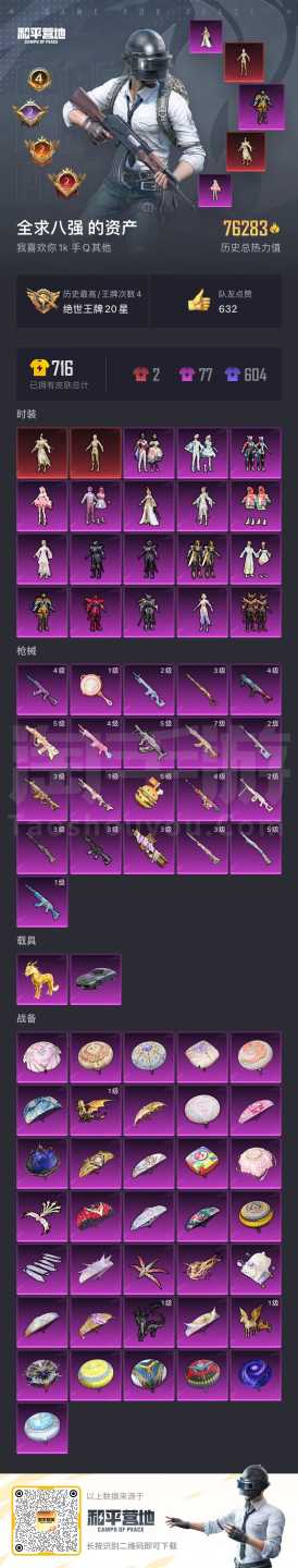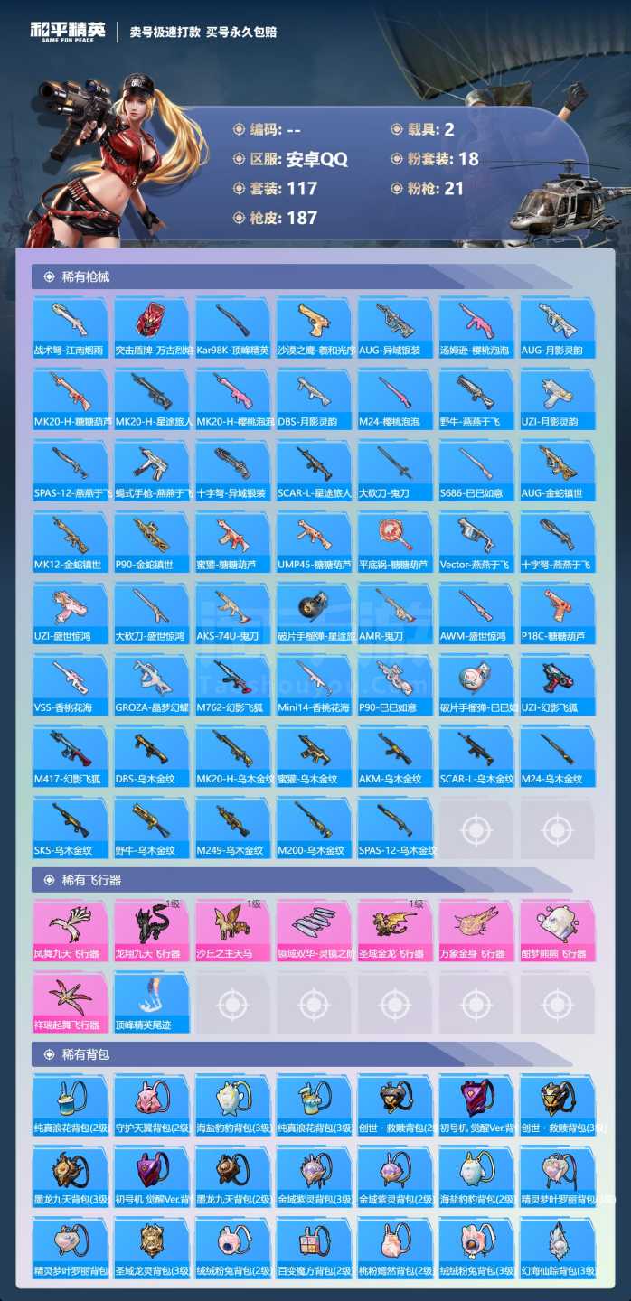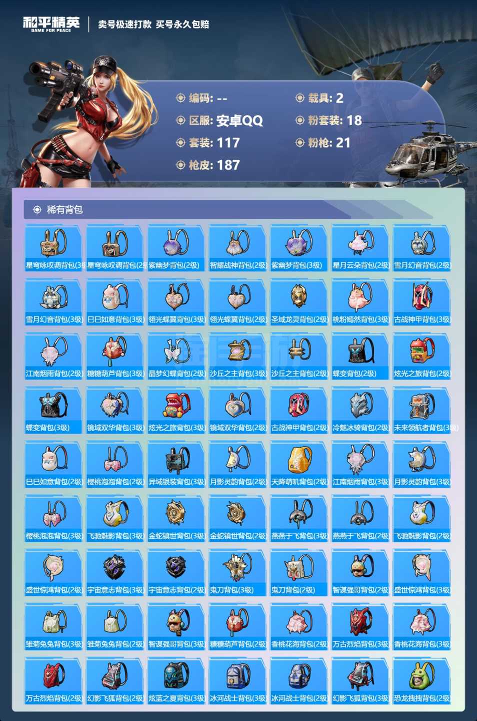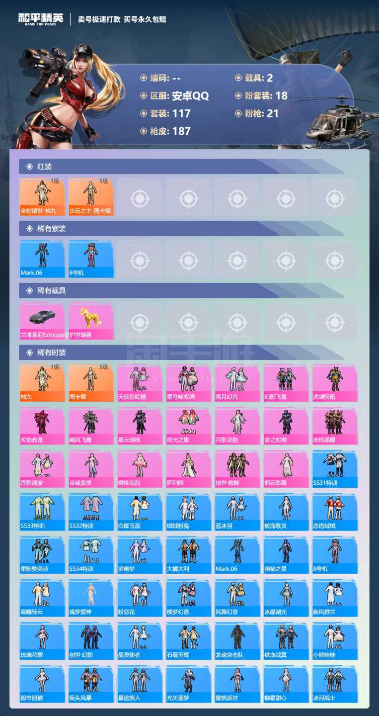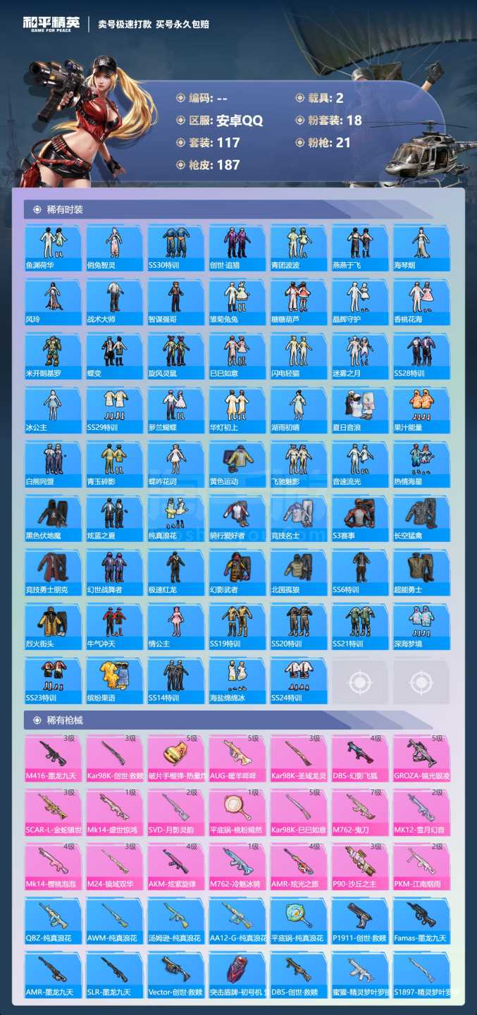 a3854/安卓QQ/-4王牌印记-18粉装-21特效枪-2载具-76283热力值-117套装-18