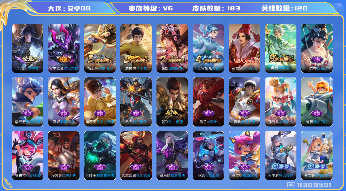 营地账号:421274134/【11309591】[11309591]实名: 可修改 性别: 男号 贵族等级: V6 英雄数: 120 皮肤数: 182 传说皮: 一念神魔,地狱之眼 限定皮: 遇见飞天,李小龙,游园惊梦,梁祝,大圣娶亲,鸣野蒿 亮点: 【店长推荐精品号】36级收藏家 李信传说一念神魔 孙悟空限定大圣娶亲 打野31段 3744星币 245皮肤碎片 积分夺宝220次 消耗任意点券恢