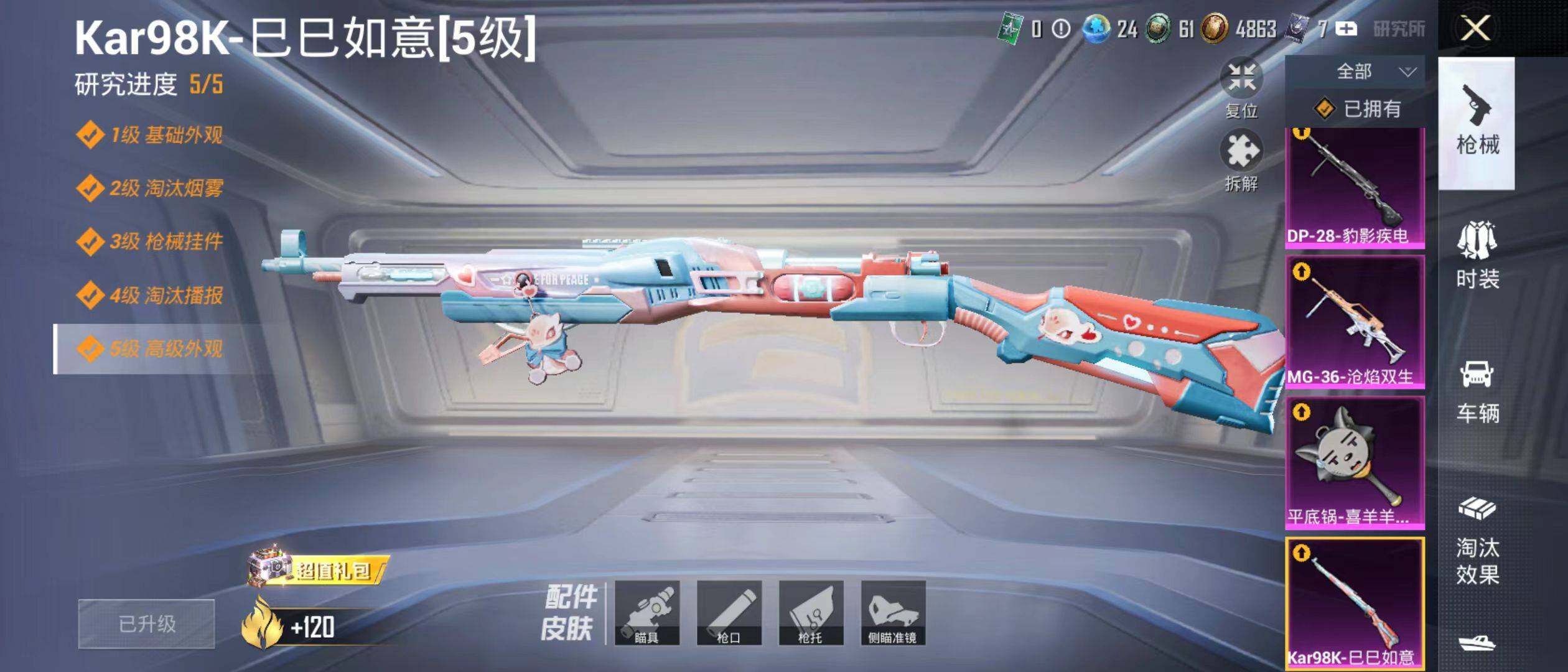 【粉色枪皮等级】:Kar98K-巳巳如意(五级),DP-28-豹影疾电(五级)