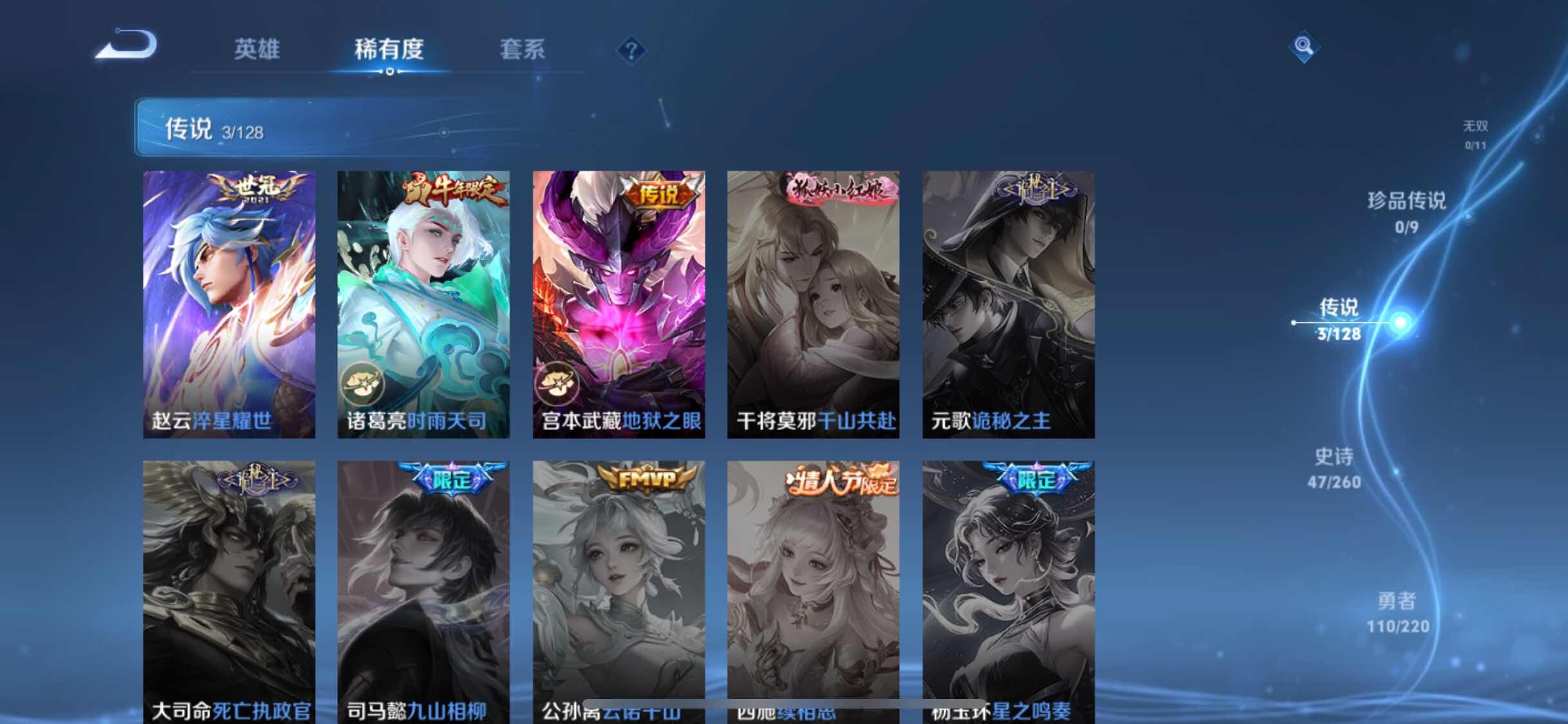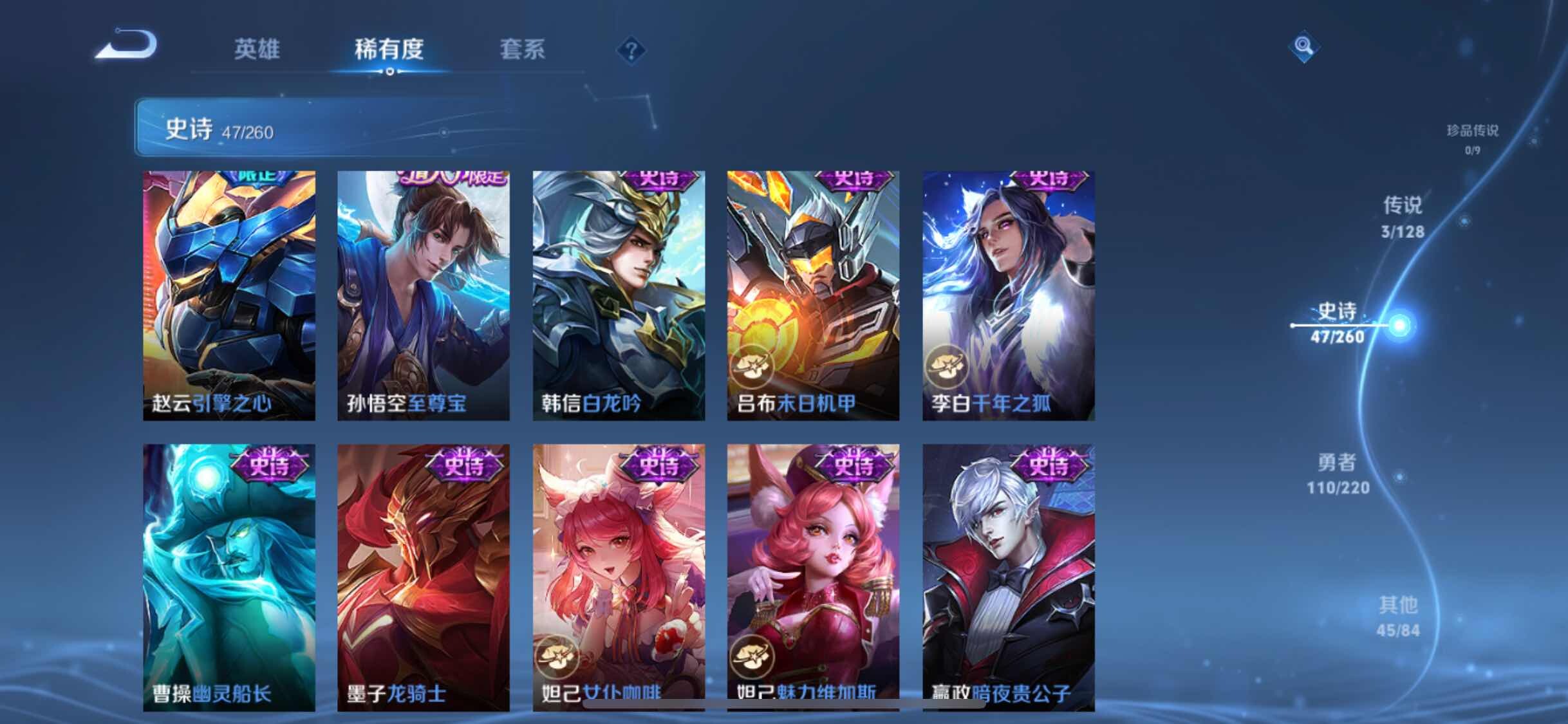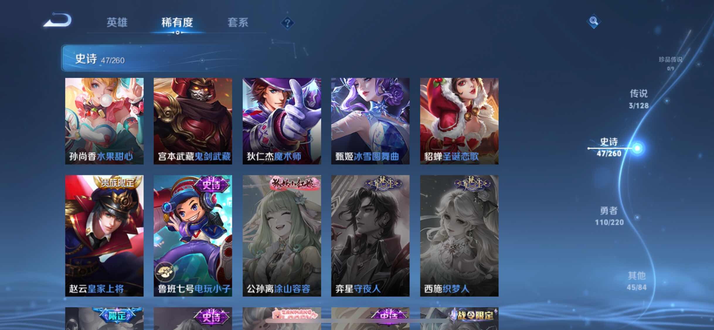 【时雨天司 引擎之心 至尊宝大圣娶亲小号】:苹果Q-V7-最强王者段位-124英雄-205皮肤-0典藏-0珍品无双-0无双-0珍品传说-3传说-47史诗