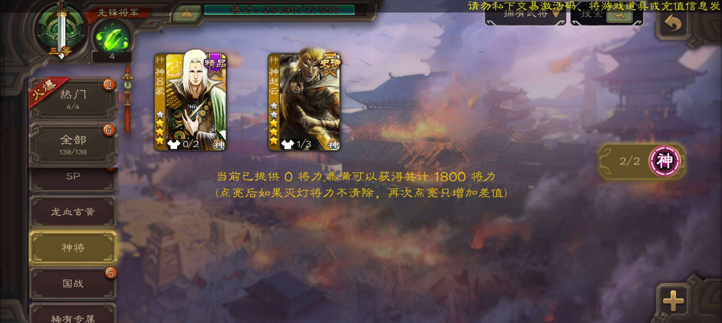 先锋将军,战龙在野动态神赵云谯周杨修3史诗,神吕蒙谋韩当崔琰张翼张布界曹植138将