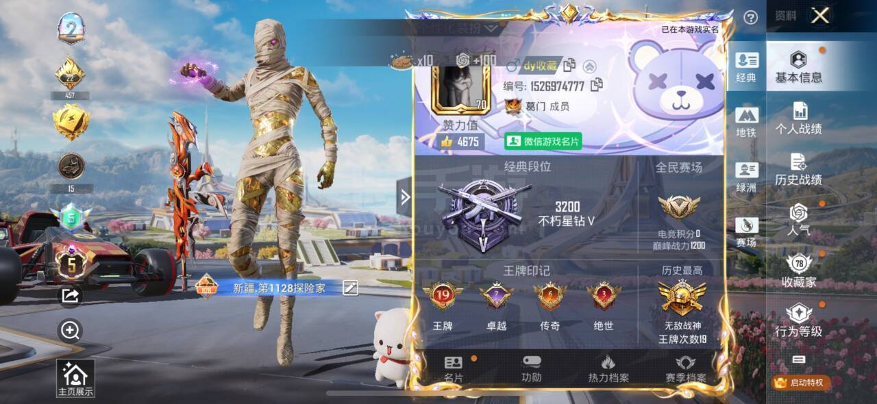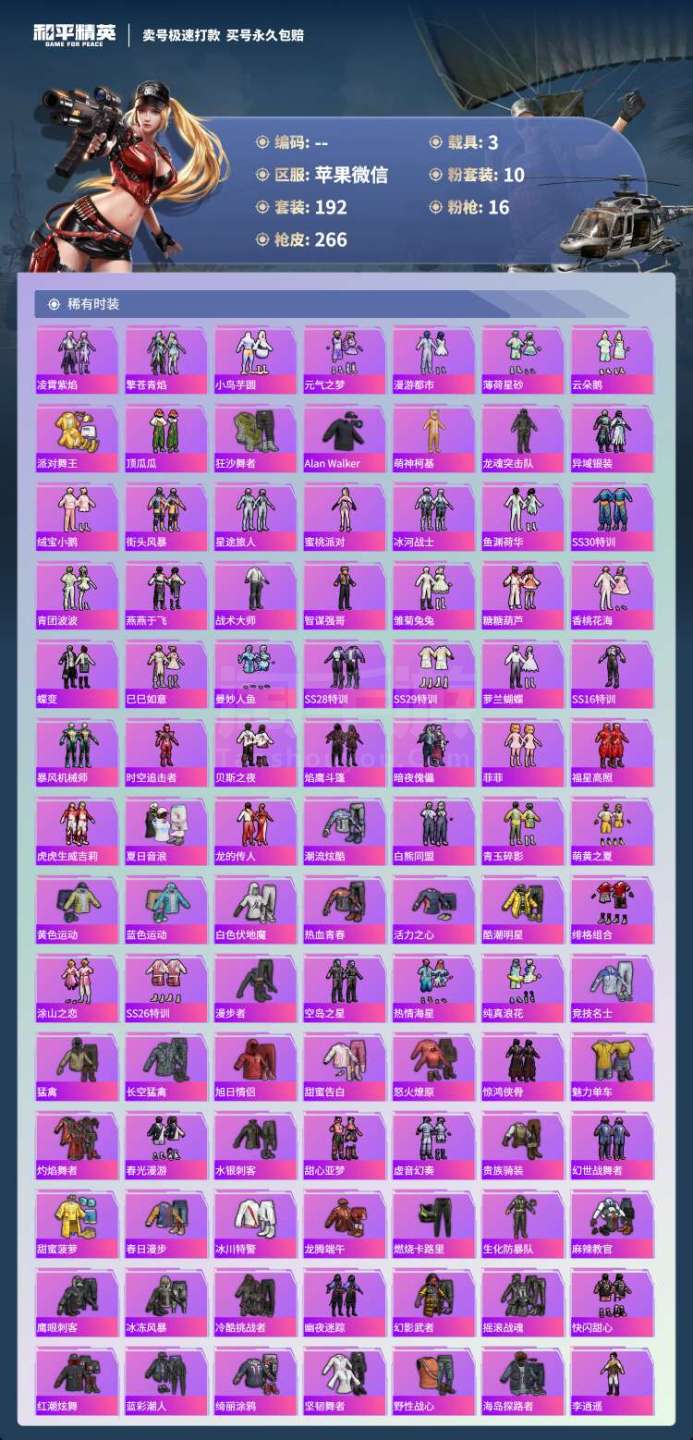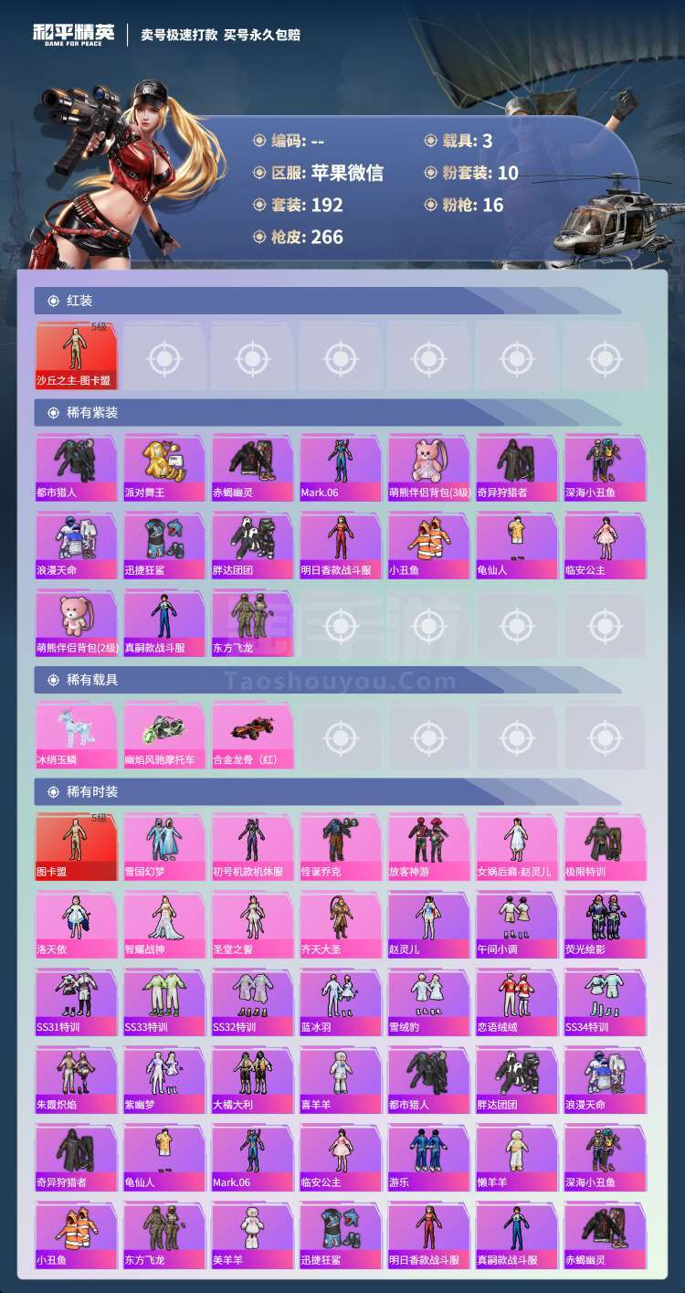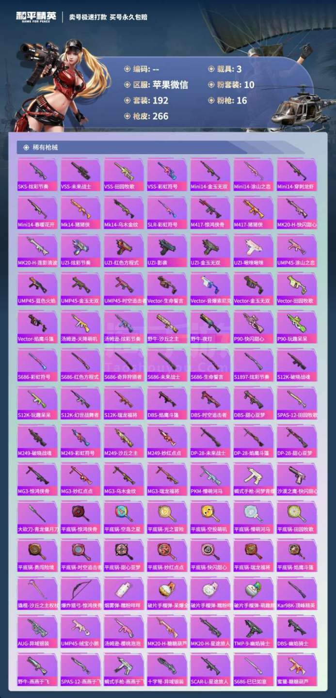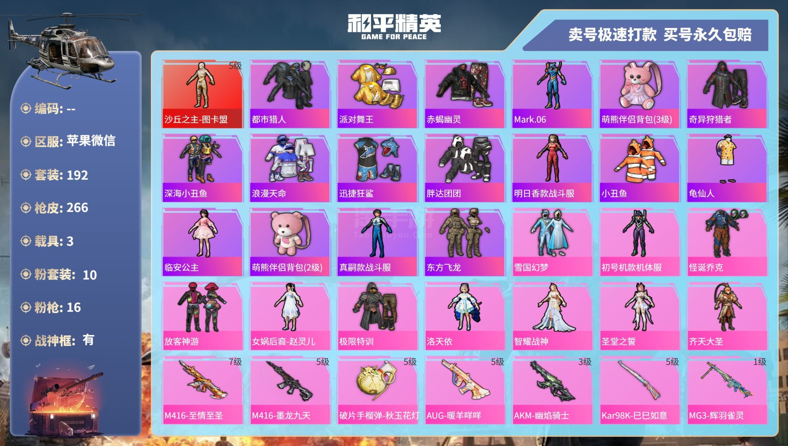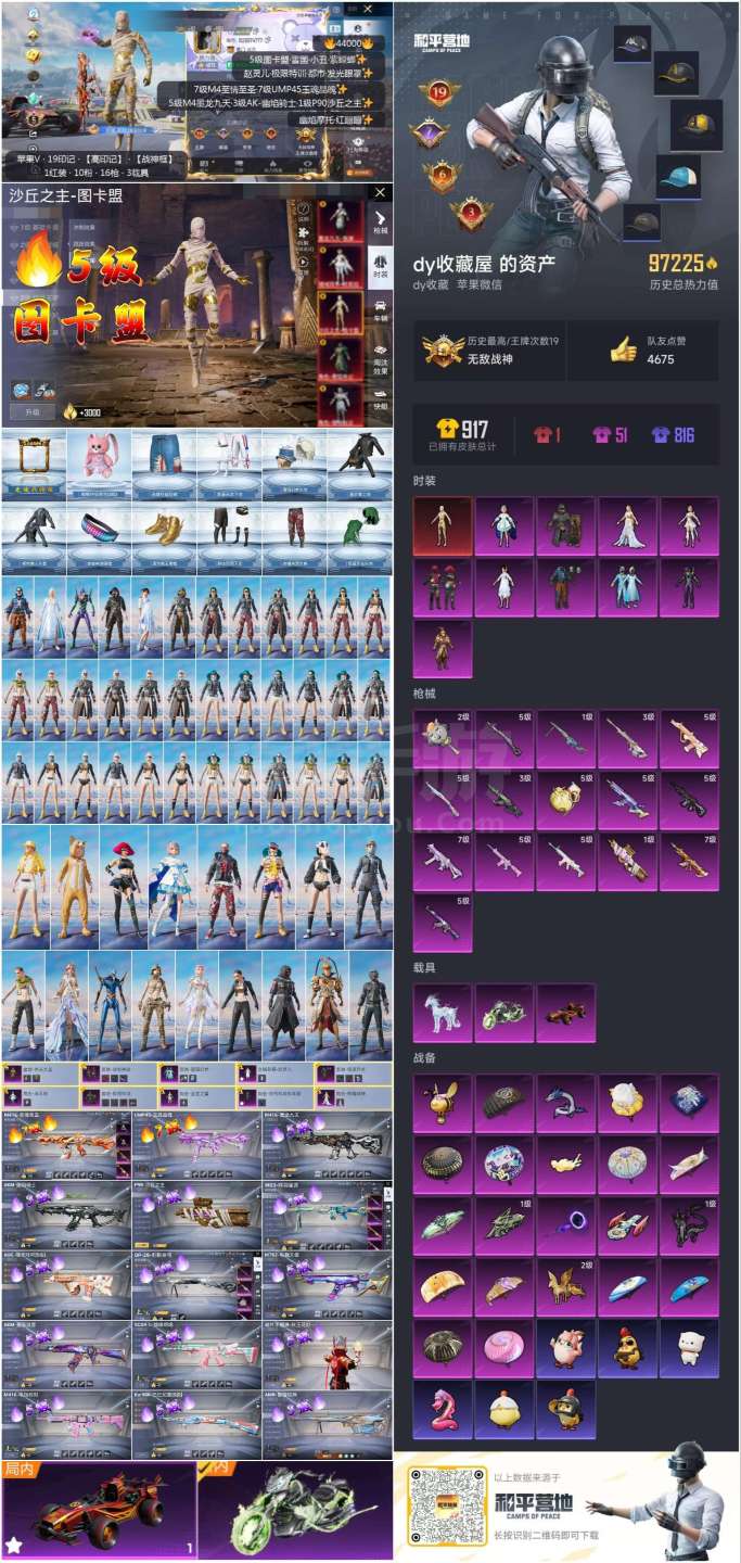 和平精英【苹果微信】hs44000 苹果v-19王牌印记-有战神框-10粉装-16特效枪-3载具-97225热力值-1