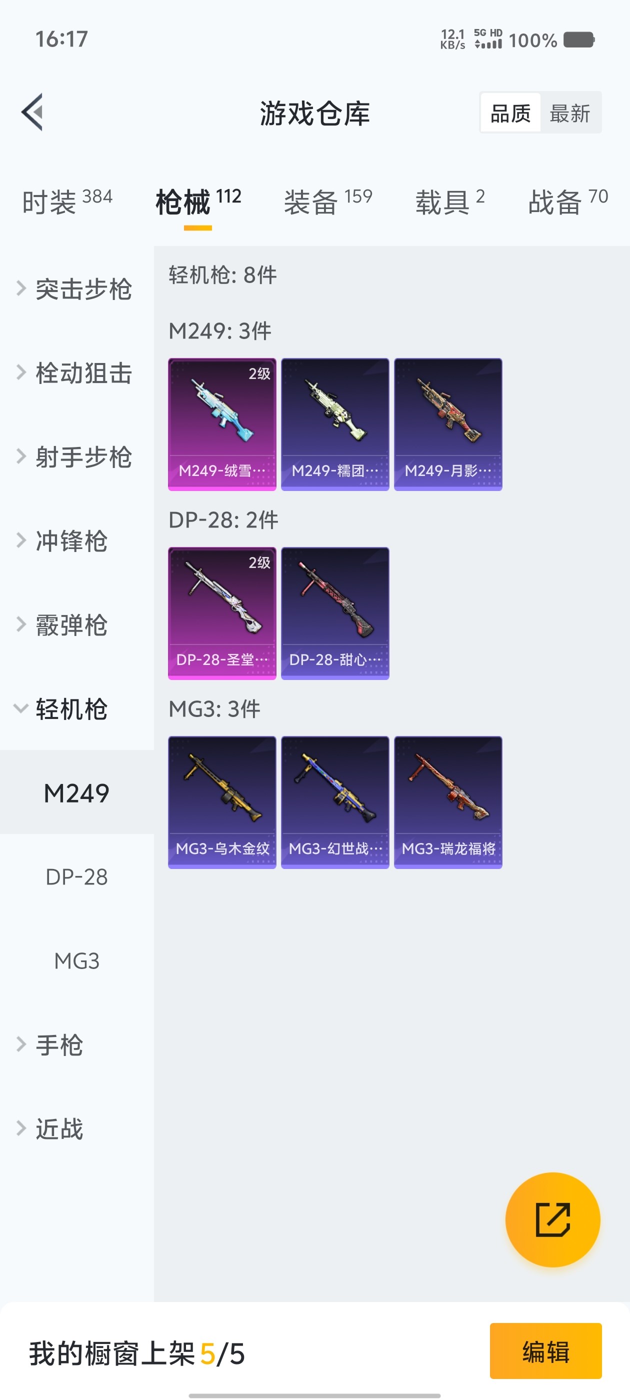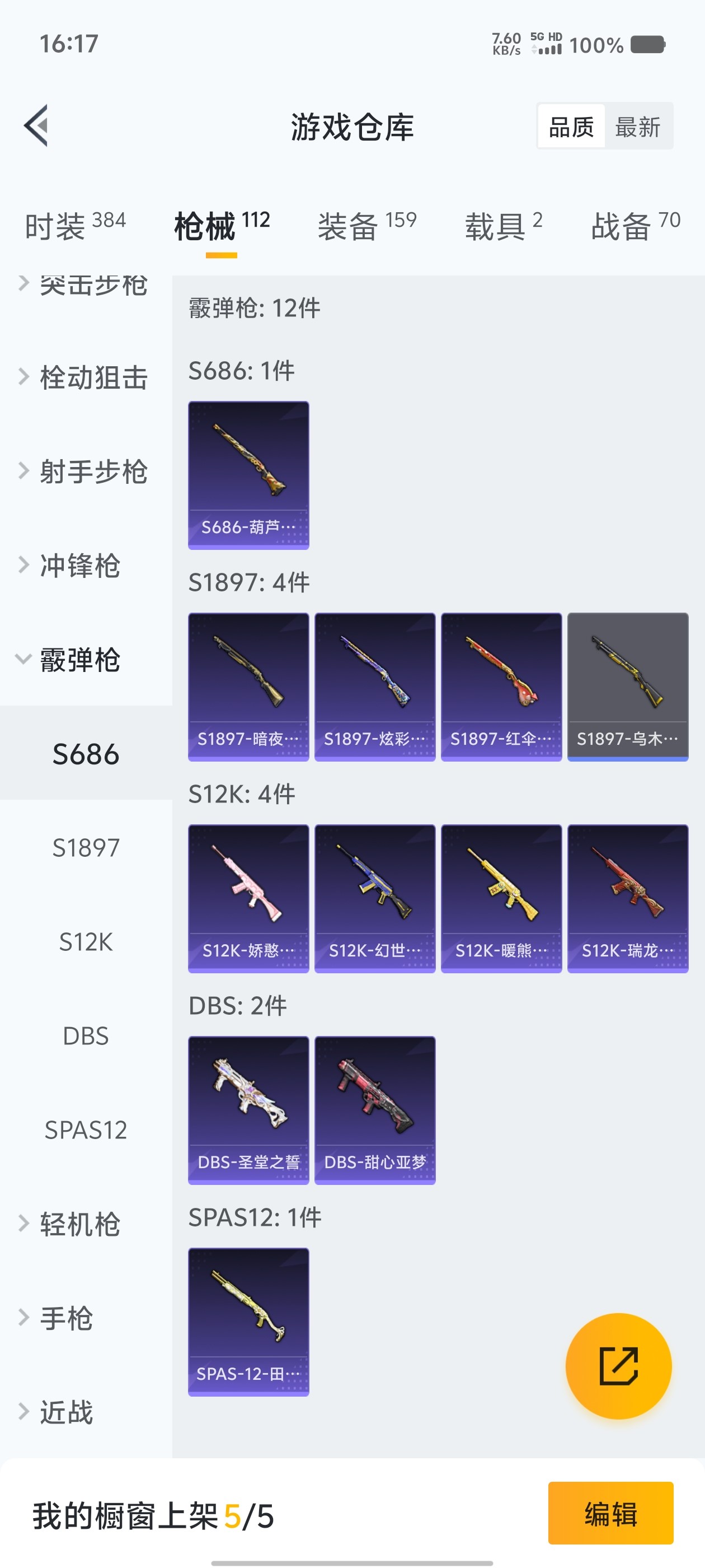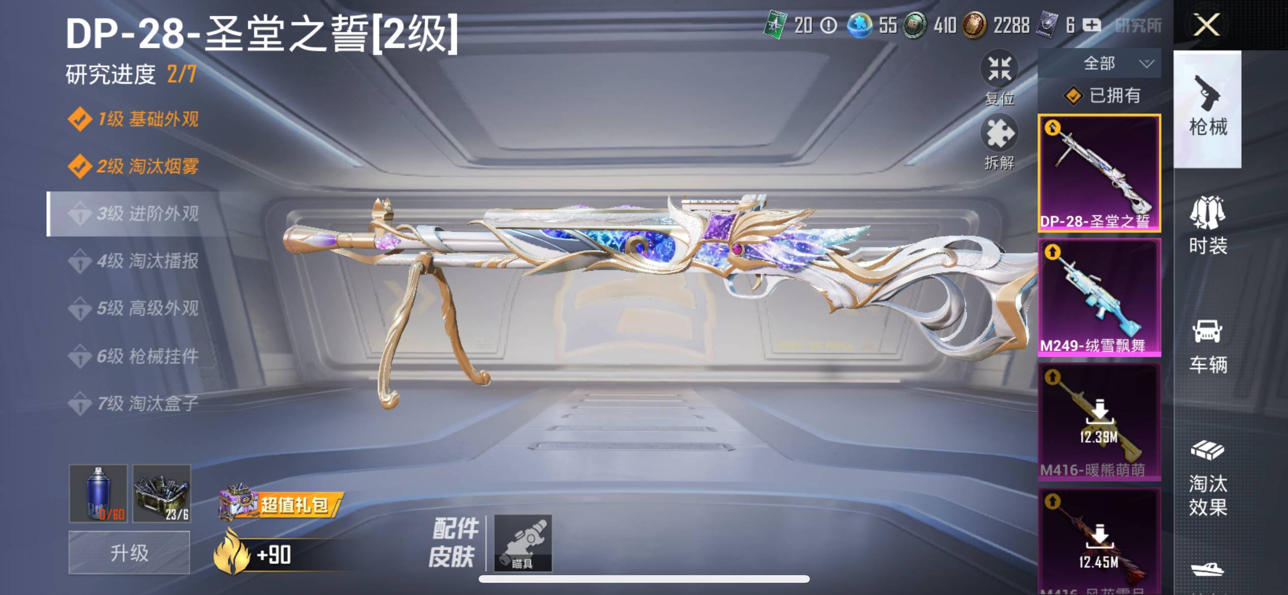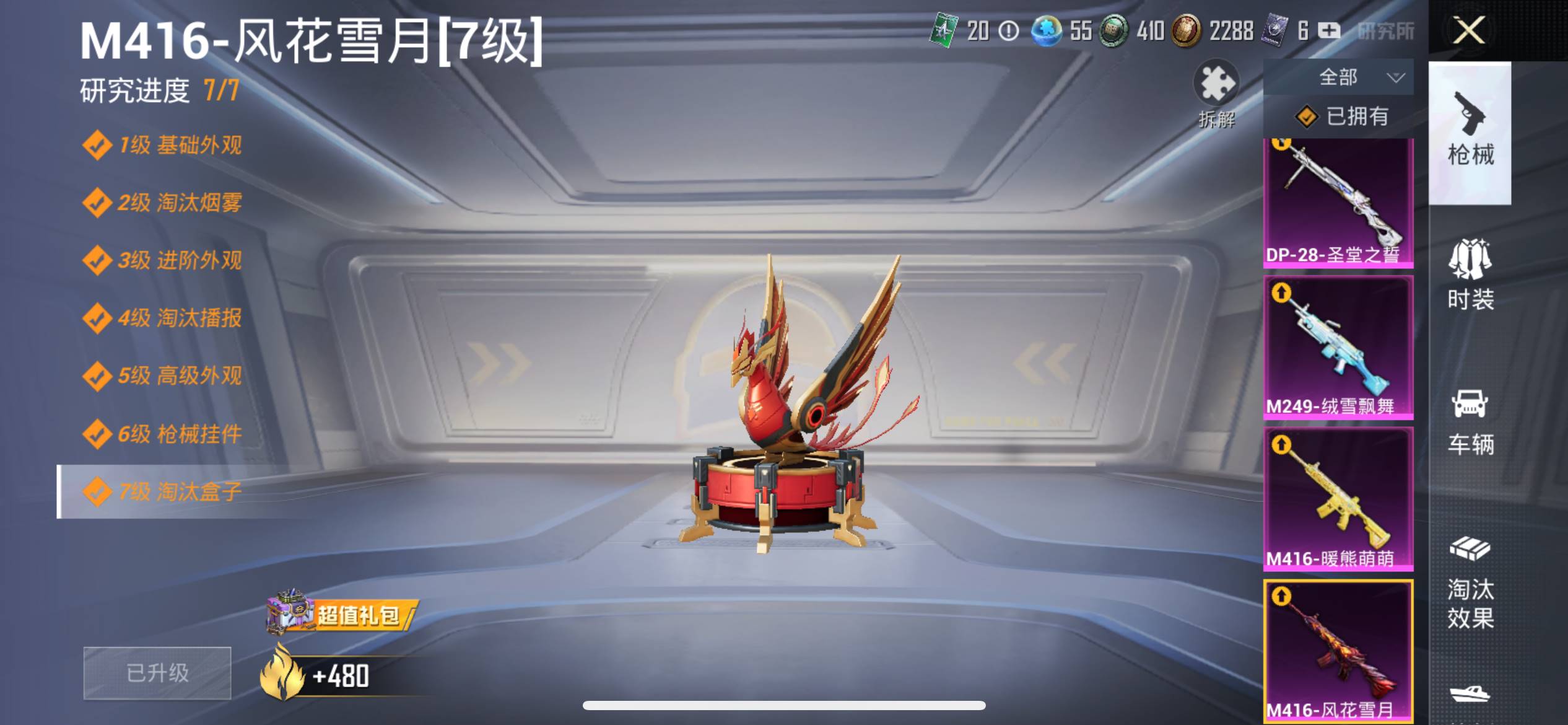 2载具 4升级枪 13粉装 2飞行器 112枪皮 96套装 43935热力 1印记 铂金