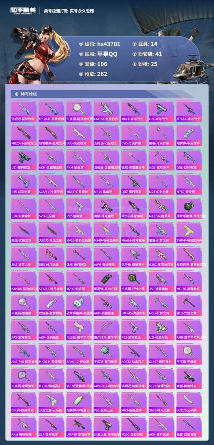 hs43701 苹果手Q-7王牌印记-41粉装-25特效枪-14载具-119555热力值-196套装
