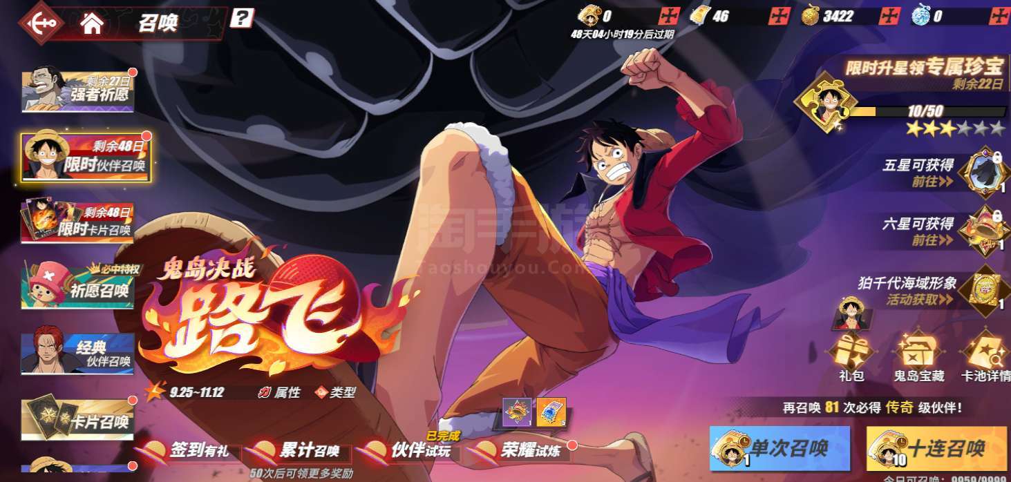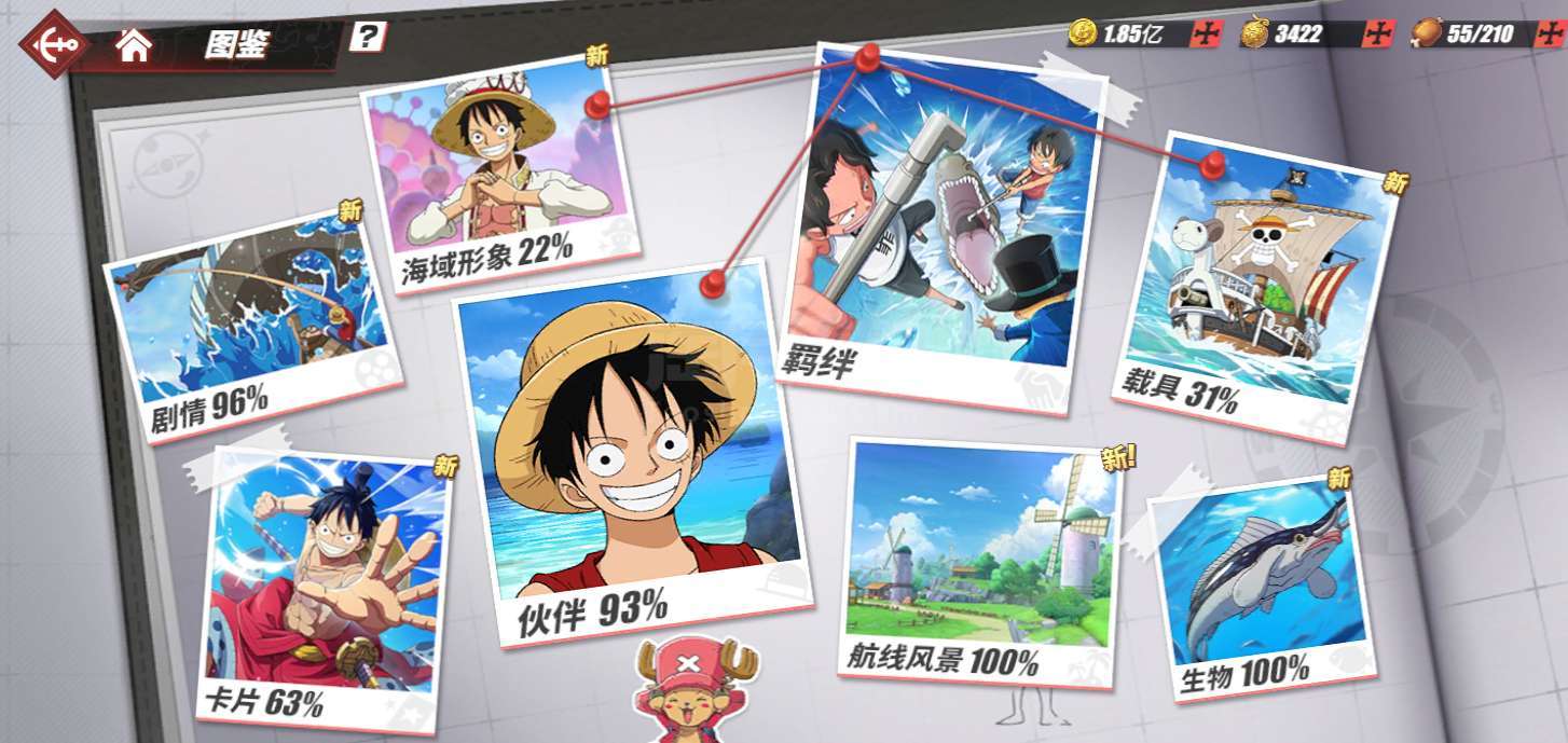 有3个典藏伙伴,70多个传奇伙伴,鬼岛路飞也有,有艘传奇船,海域形象也有,可以换绑,但是要10月才行