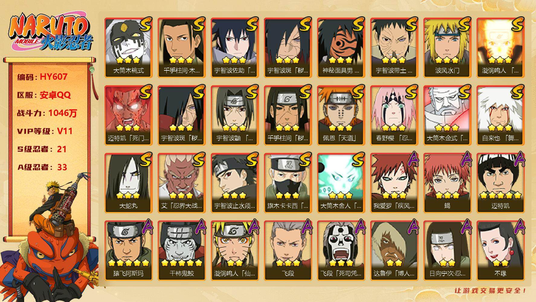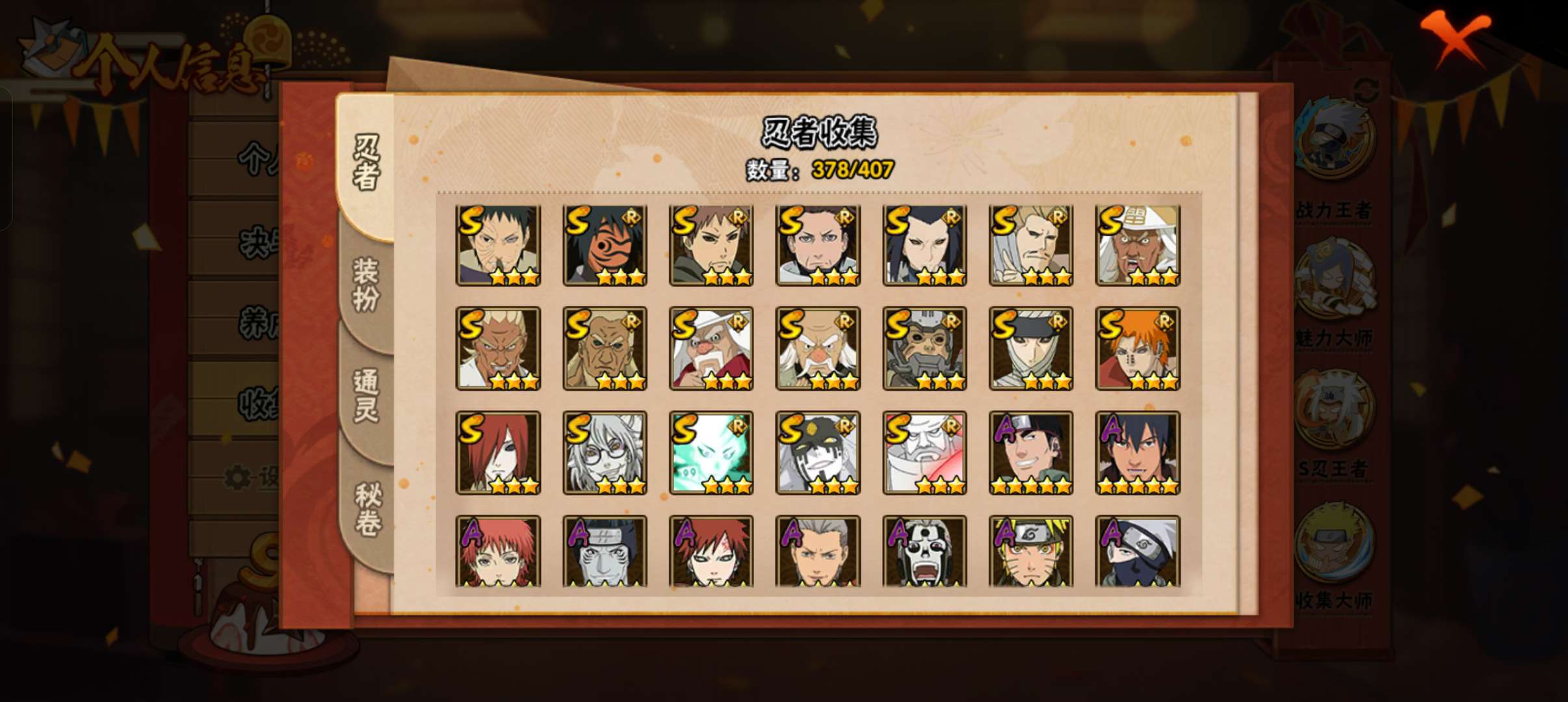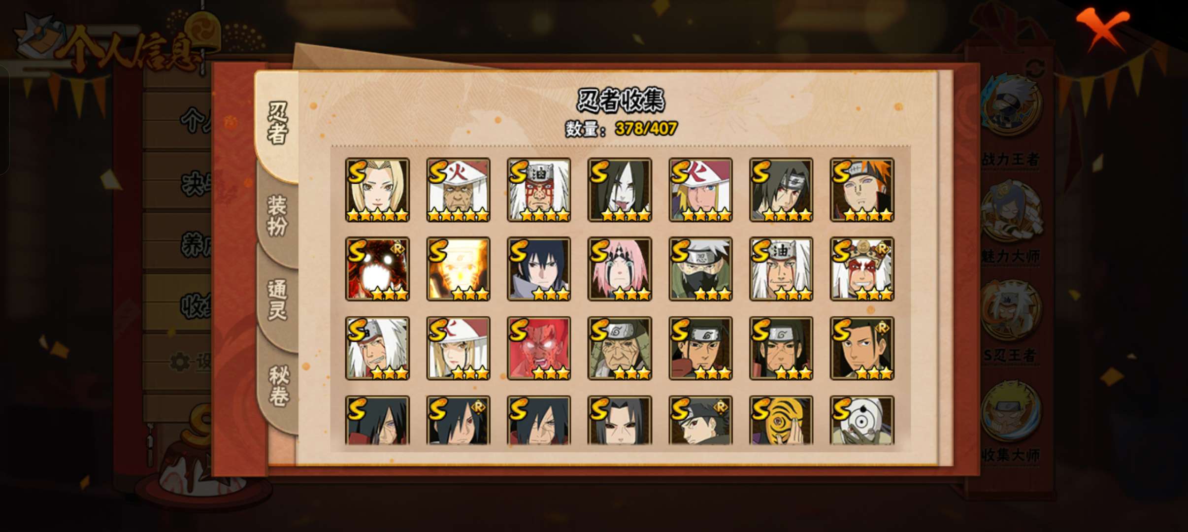 无,自来也(舞杰),自来也,自来也(仙人),大蛇丸,波风水门,佩恩(天道),宇智波鼬(须佐能乎),神秘面具男,千手扉间,艾(四代目),千手柱间,宇智波斑,长门(秽土),猿飞日斩(秽土),波风水门(秽土),纲手(百豪),千手扉间(秽土),宇智波斑(白面具),宇智波斑(秽土),药师兜(仙人),鬼灯幻月(二代目),金角银角(秽土),无(二代目),半藏(秽土),艾(三代目),佩恩天道(超),纲手,猿飞日斩,大野木(三代目),宇智波鼬(秽土),罗砂(四代目),千手柱间(秽土),忍界带土,木叶创立斑,三代目风影(秽土),八门凯,大野木(忍界大战),九喇嘛鸣人,大筒木金氏,忍战樱,神秘面具男 (红叶之刃),宇智波佐助(永恒万花筒),木叶创立( 柱间 ),秽土解斑,大筒木桃式(博人传),艾(忍界大战),止水(须佐能乎),旗木卡卡西(须佐能乎),大筒木舍人(最终章),自来也(传说中的三忍),漩涡鸣人(暴怒·第六尾)