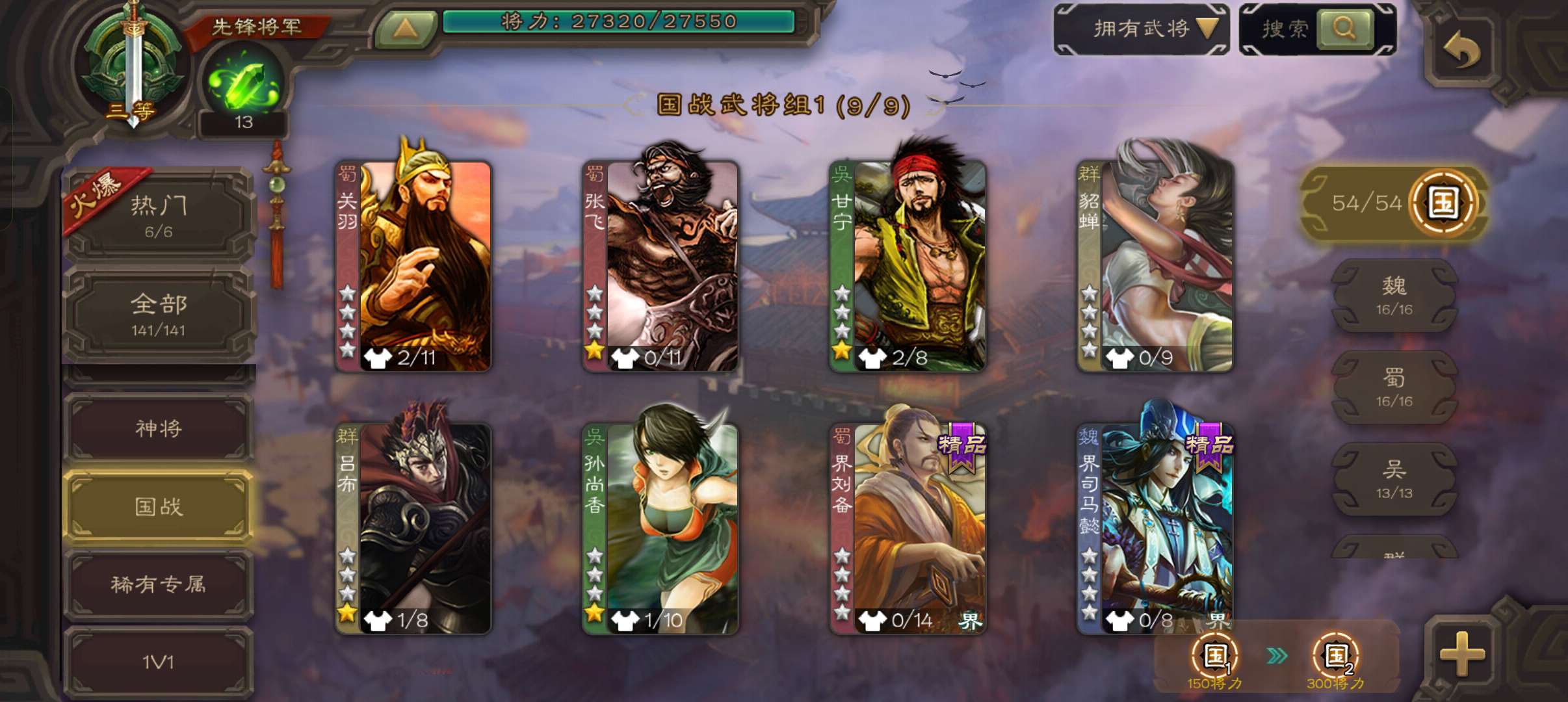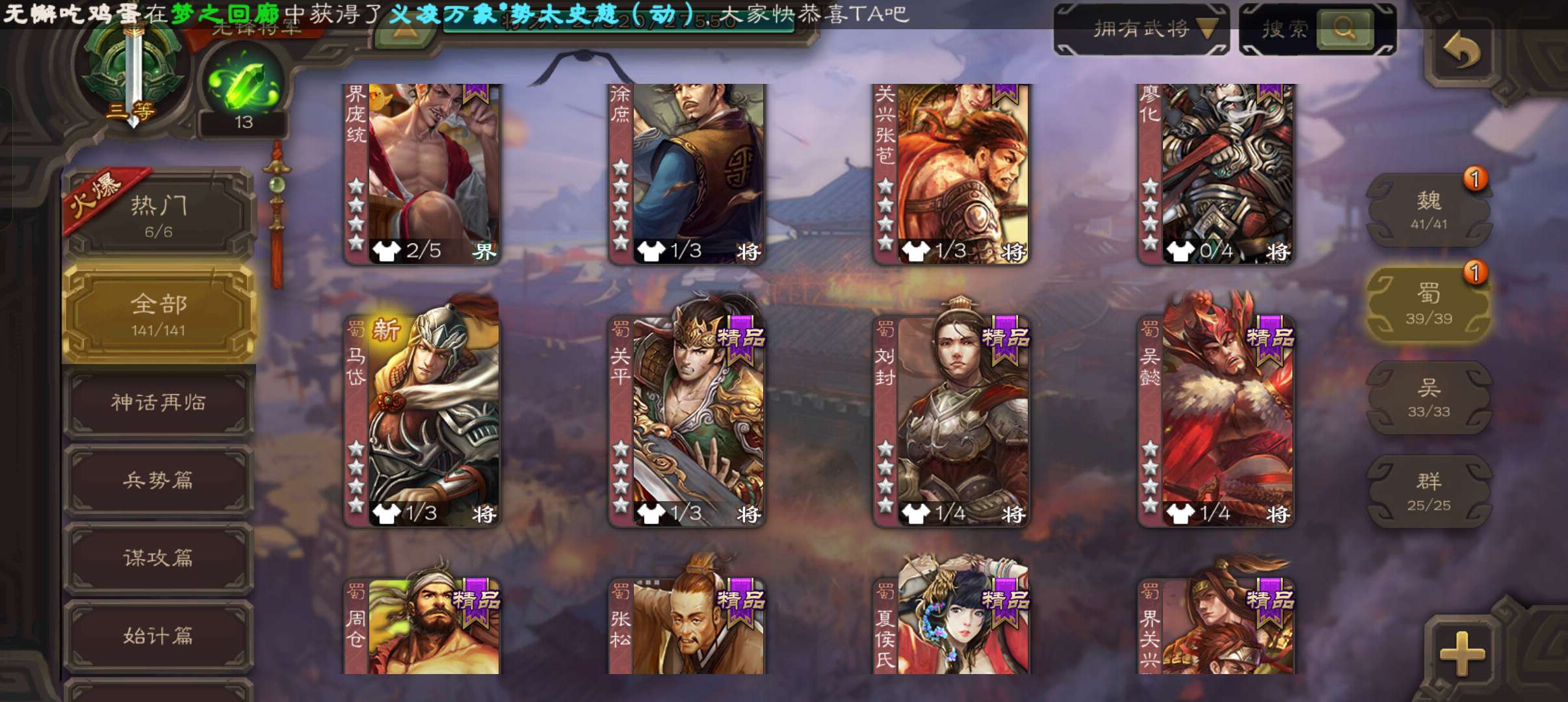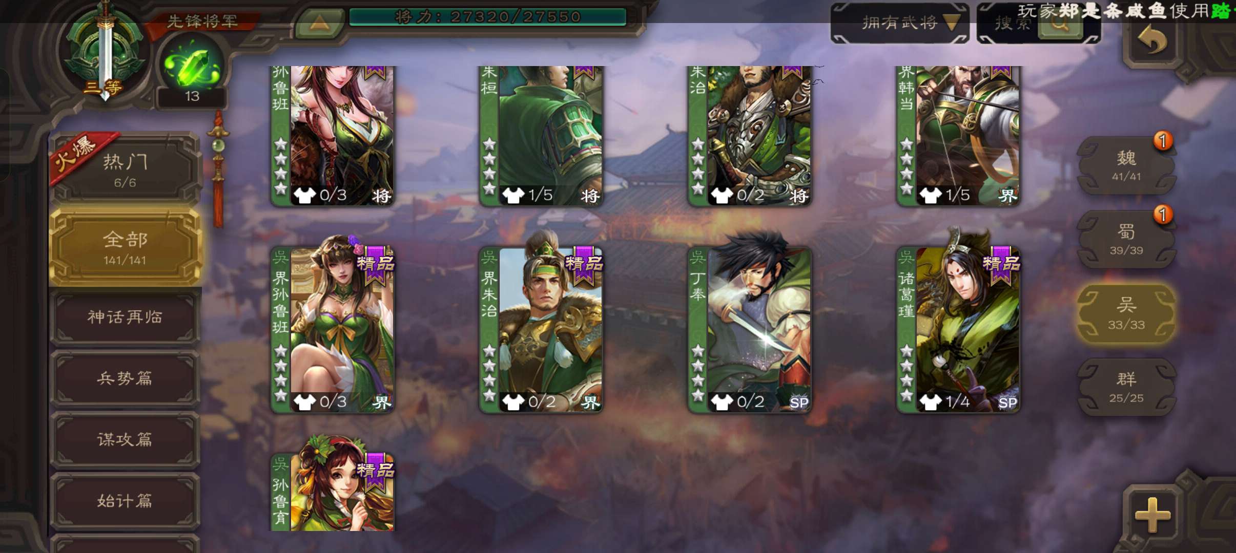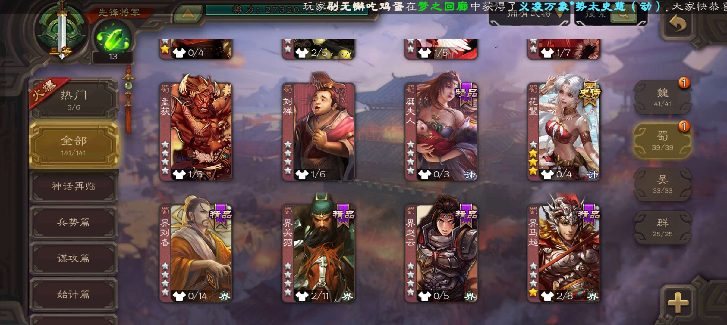 8万4羽毛4.7万豆,神赵云神刘备曹婴花鬘杨修5史诗先锋,神吕蒙动界大乔谋韩当界孙权甘夫人141将