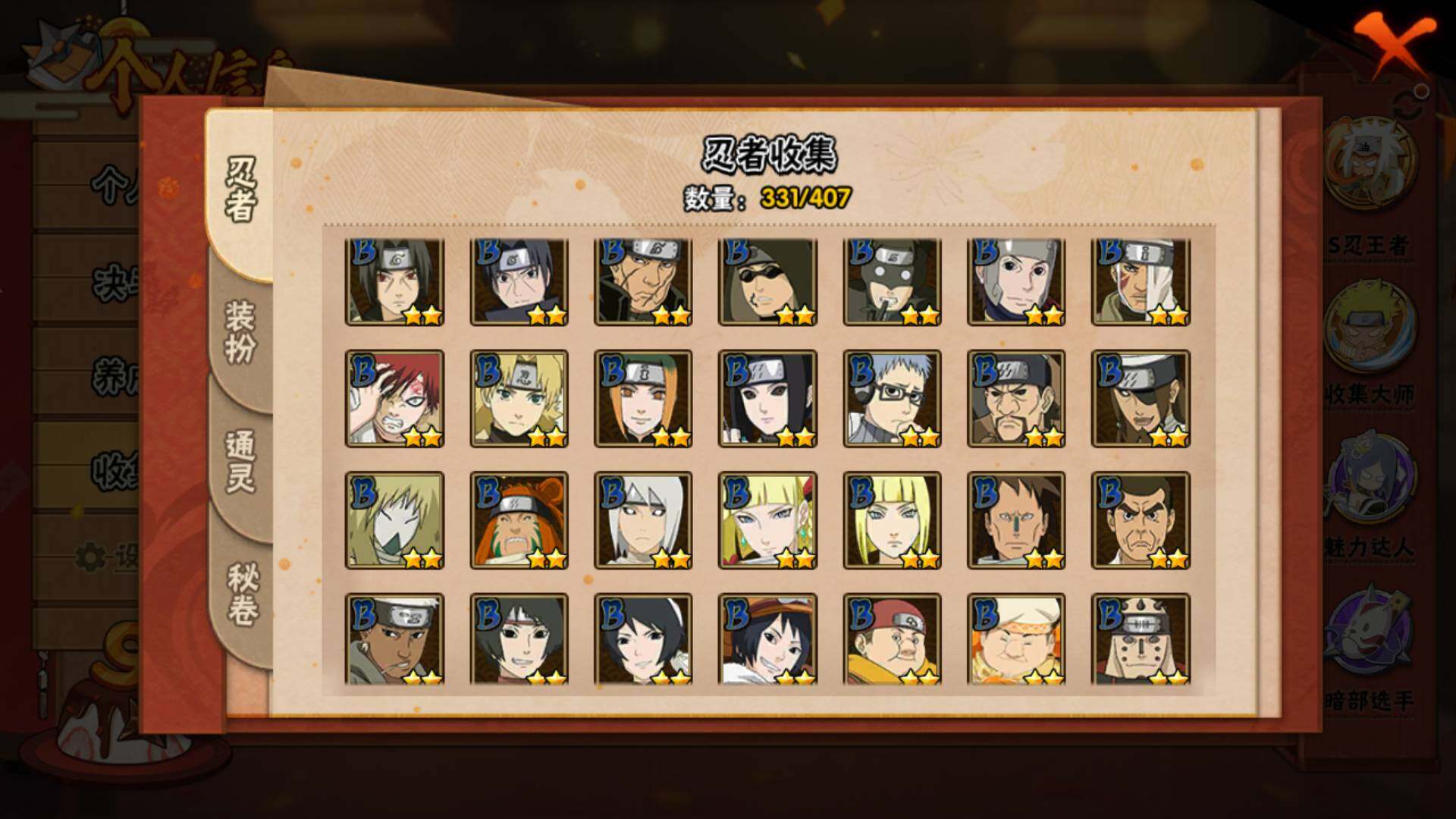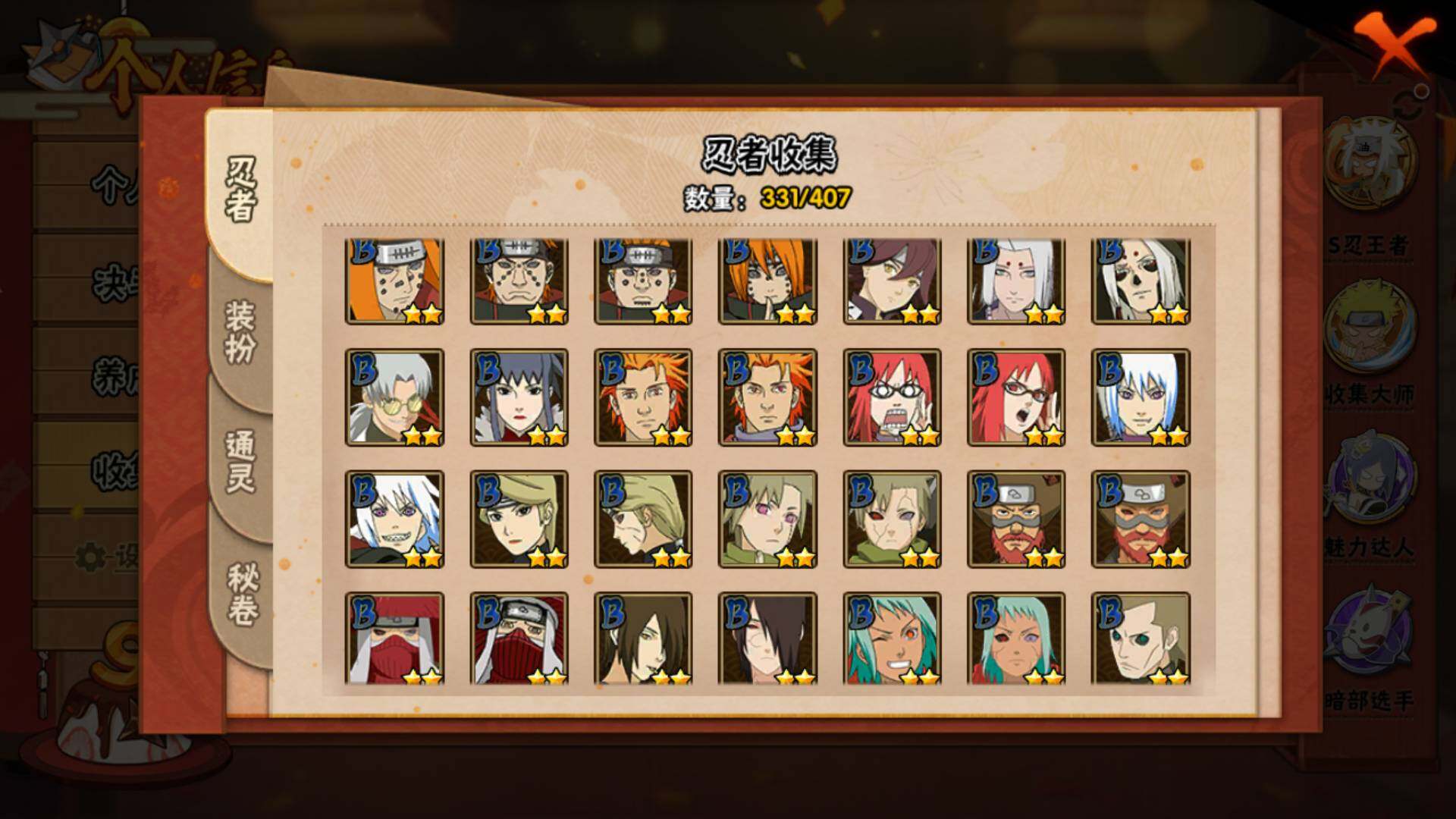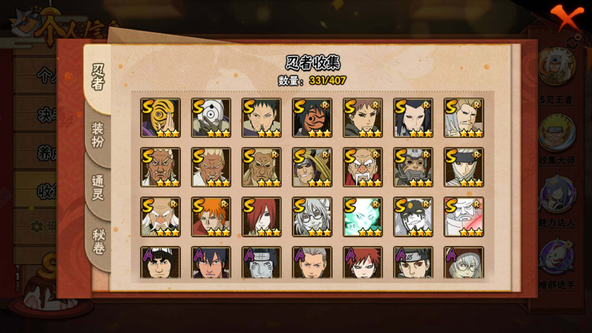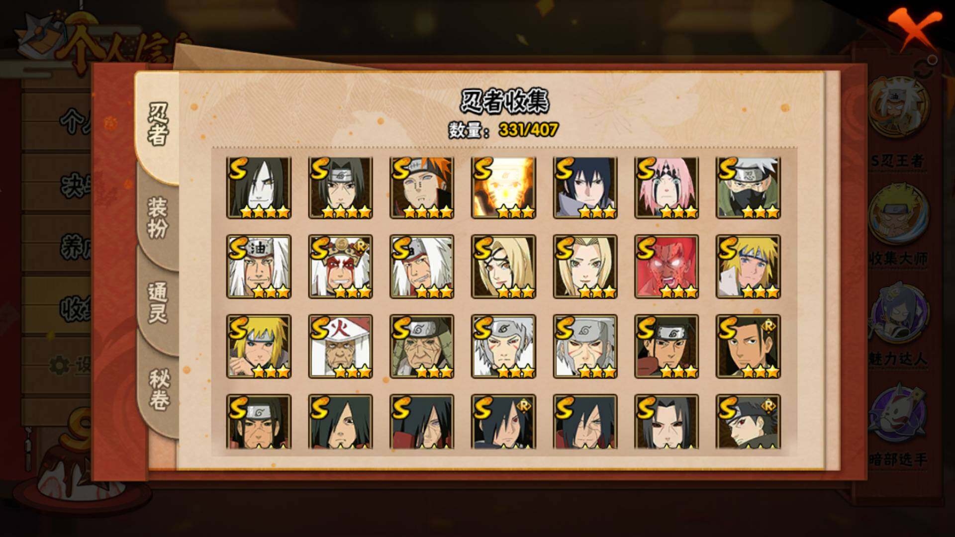 【S级忍者】:长门「秽土转生」(3星),三代目风影「秽土转生」(3星),半藏「秽土转生」(3星),金角·银角「秽土转生」(3星),猿飞日斩「秽土转生」(3星),波风水门「秽土转生」(3星),千手扉间「秽土转生」(3星),千手柱间「秽土转生」(3星),宇智波鼬「秽土转生」(3星),宇智波斑「秽土转生」(3星),宇