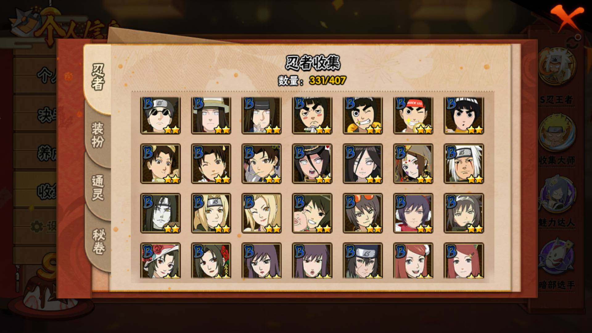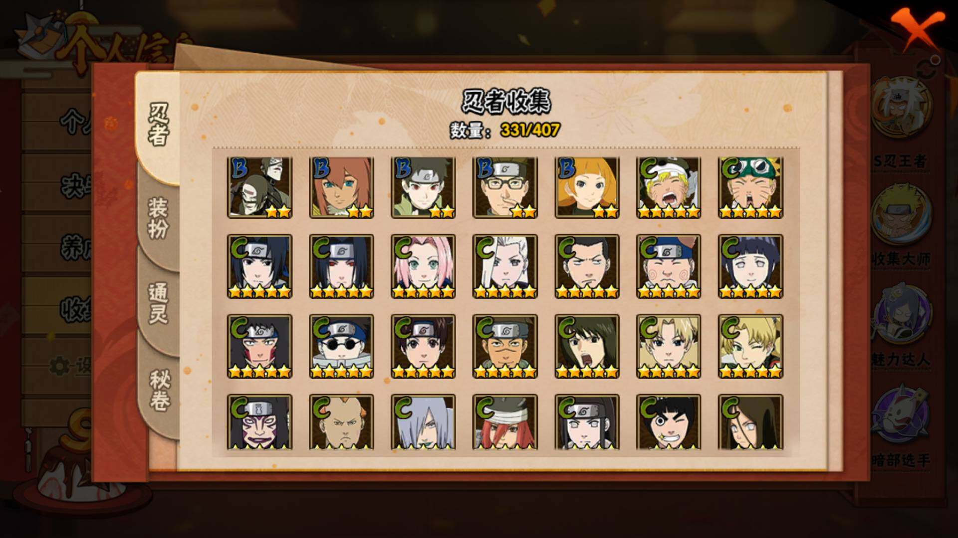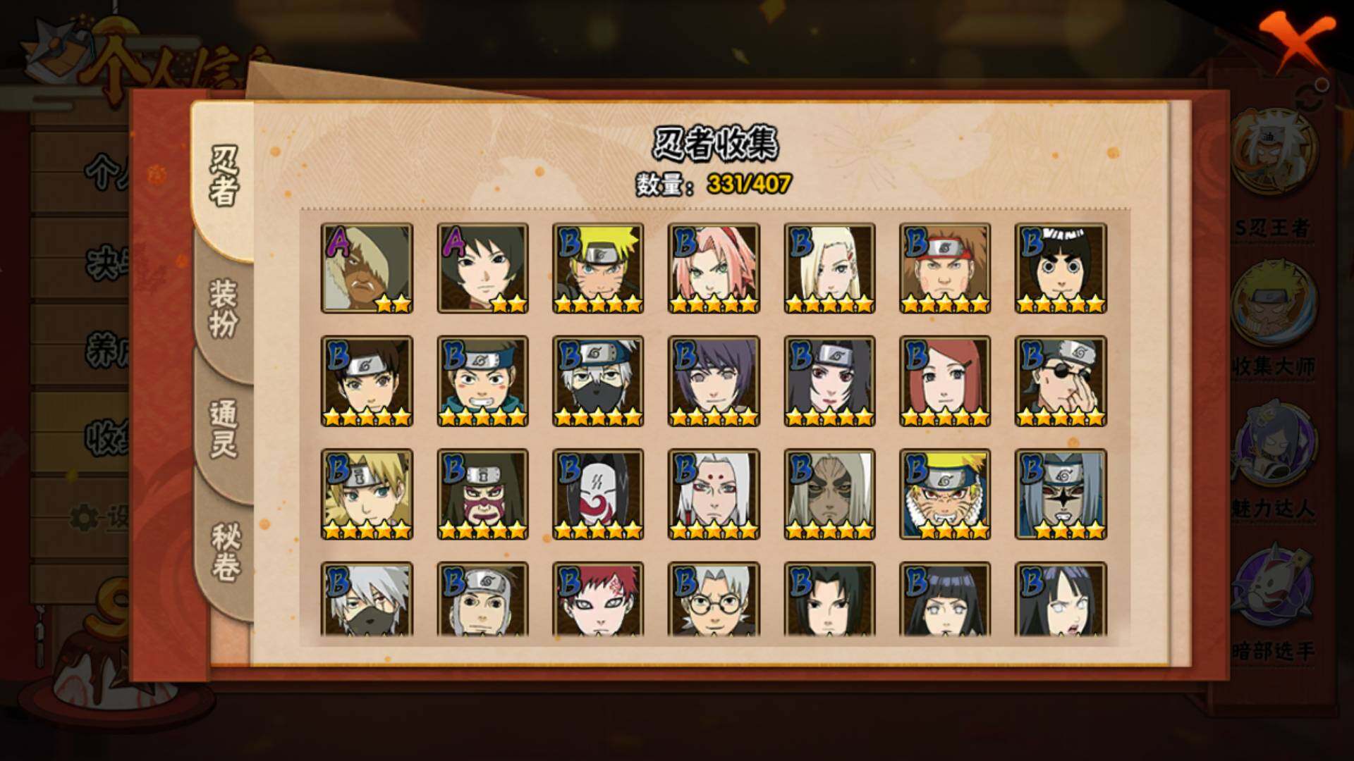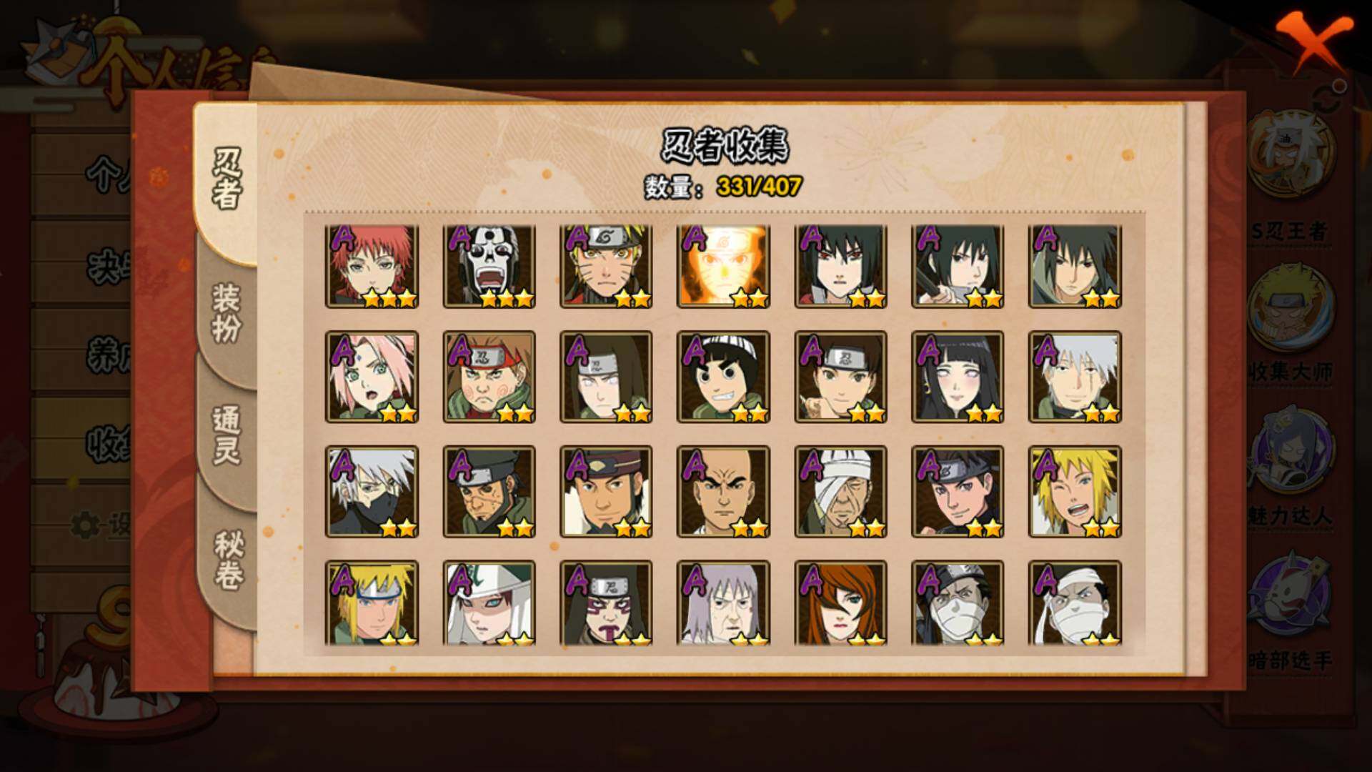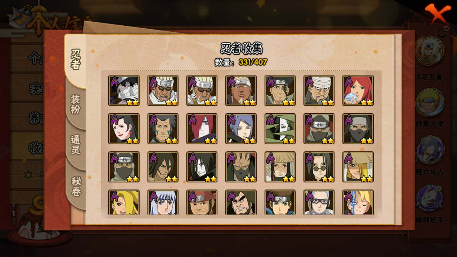 【S级忍者】:长门「秽土转生」(3星),三代目风影「秽土转生」(3星),半藏「秽土转生」(3星),金角·银角「秽土转生」(3星),猿飞日斩「秽土转生」(3星),波风水门「秽土转生」(3星),千手扉间「秽土转生」(3星),千手柱间「秽土转生」(3星),宇智波鼬「秽土转生」(3星),宇智波斑「秽土转生」(3星),宇