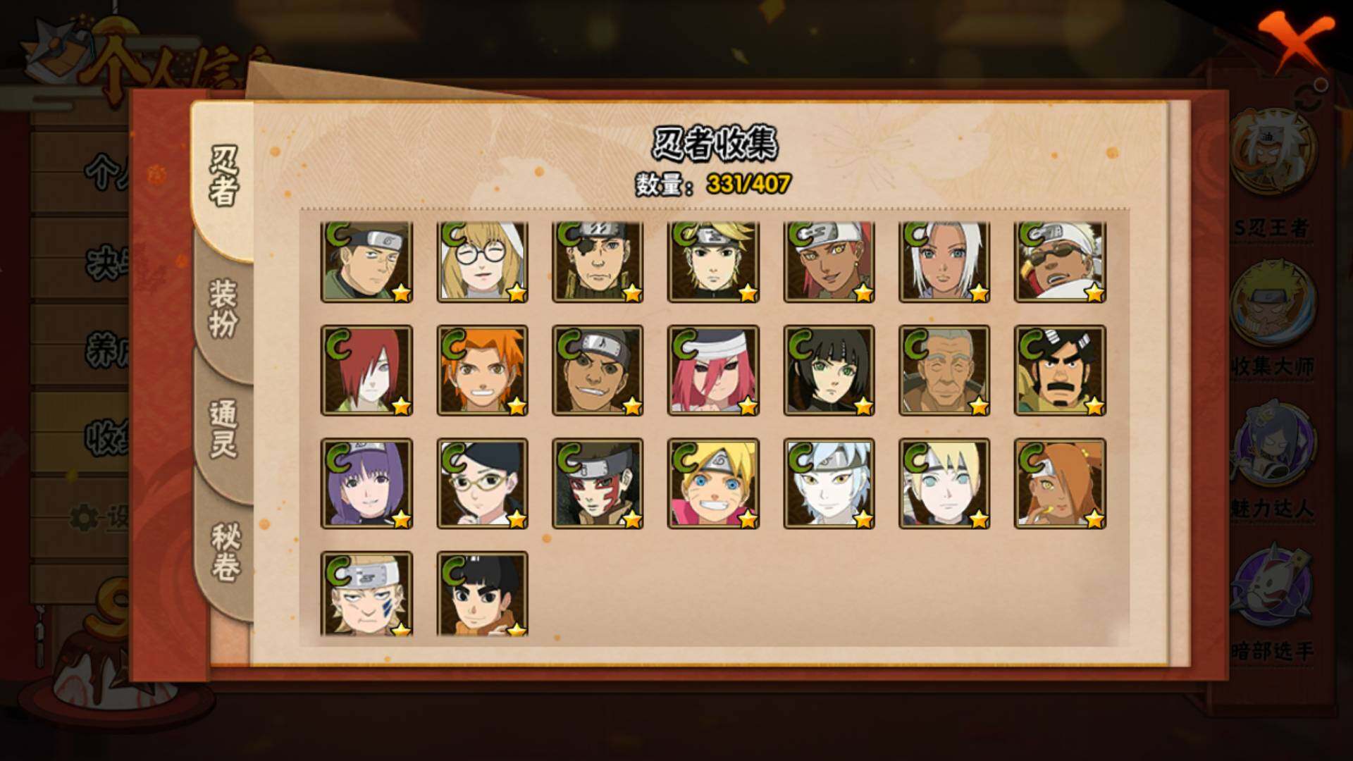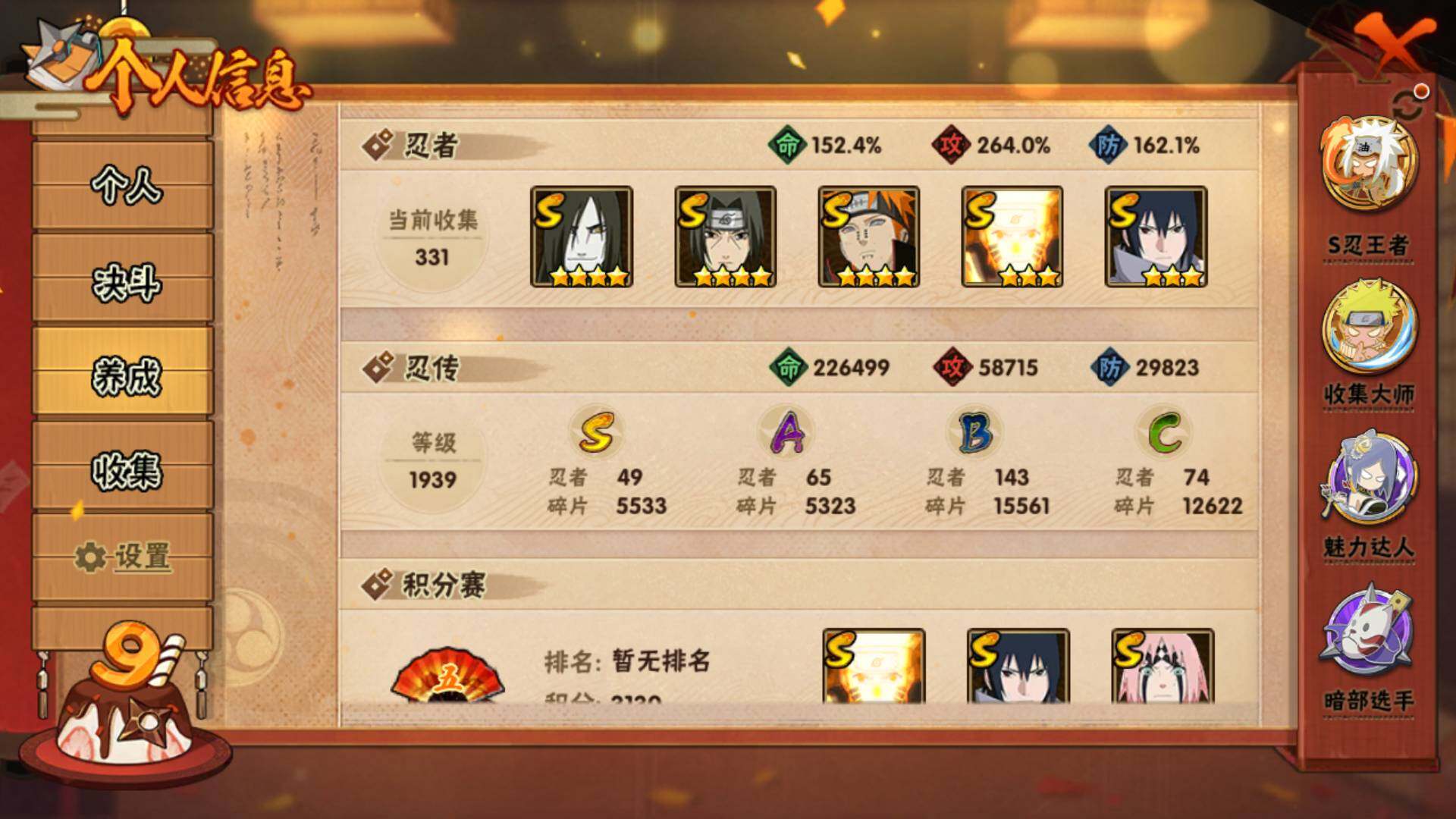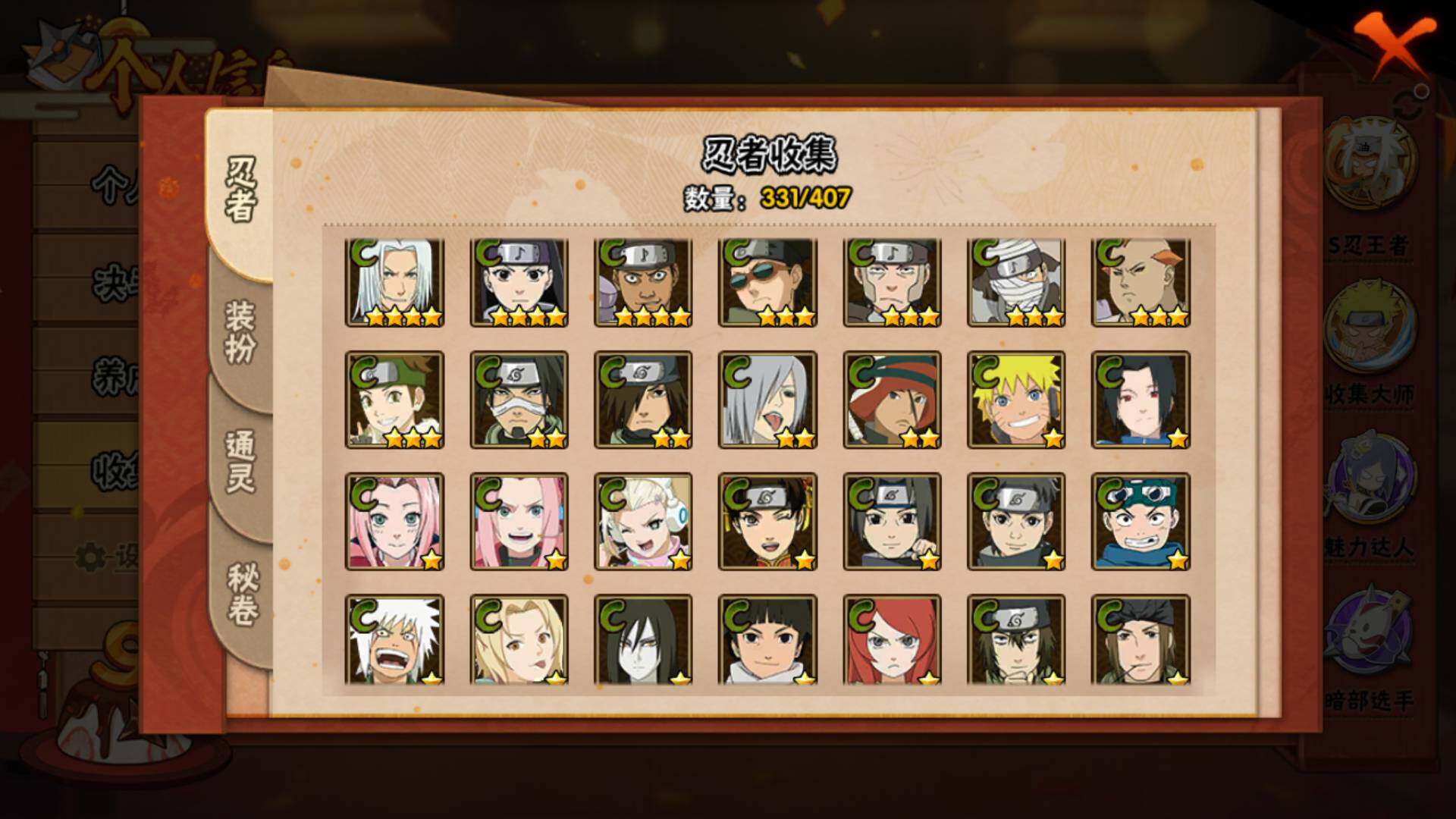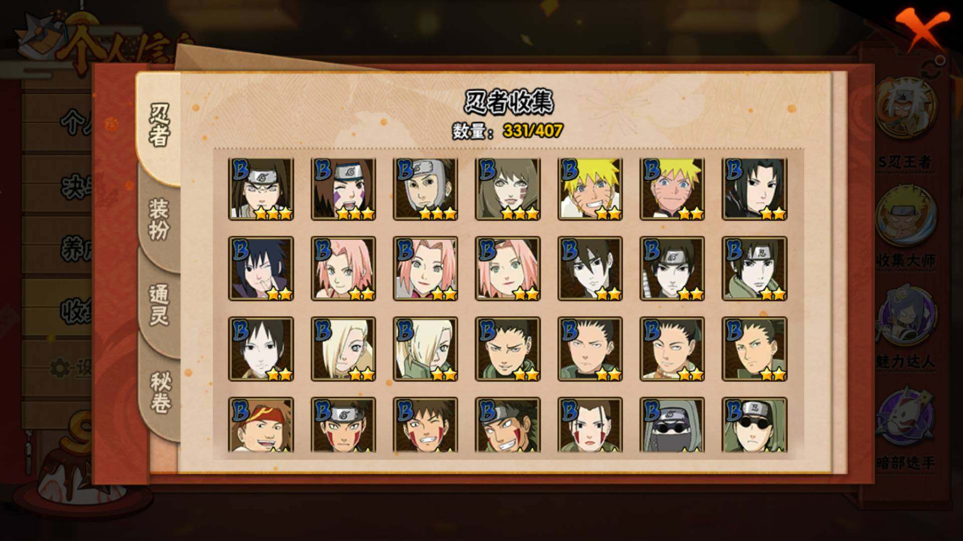 【S级忍者】:长门「秽土转生」(3星),三代目风影「秽土转生」(3星),半藏「秽土转生」(3星),金角·银角「秽土转生」(3星),猿飞日斩「秽土转生」(3星),波风水门「秽土转生」(3星),千手扉间「秽土转生」(3星),千手柱间「秽土转生」(3星),宇智波鼬「秽土转生」(3星),宇智波斑「秽土转生」(3星),宇
