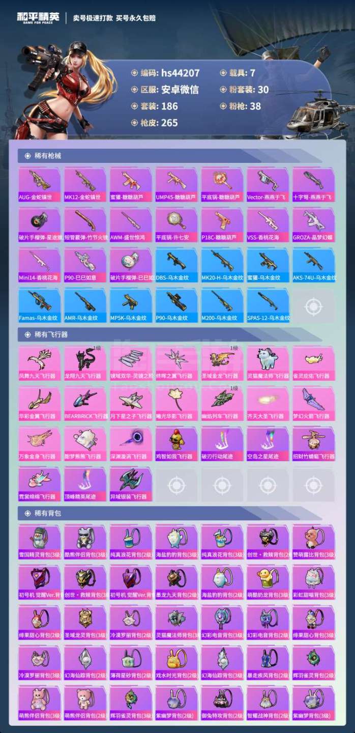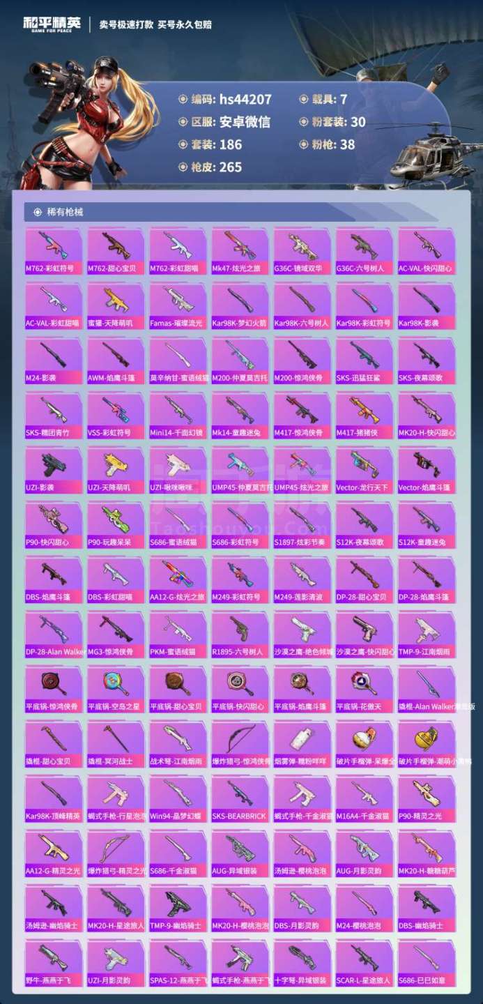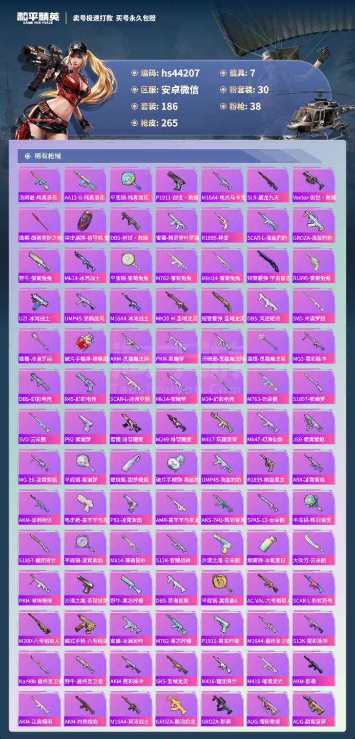 和平精英【安卓微信】hs44207 安卓v-10王牌印记-30粉装-38特效枪-7载具-122056热力值-186套装