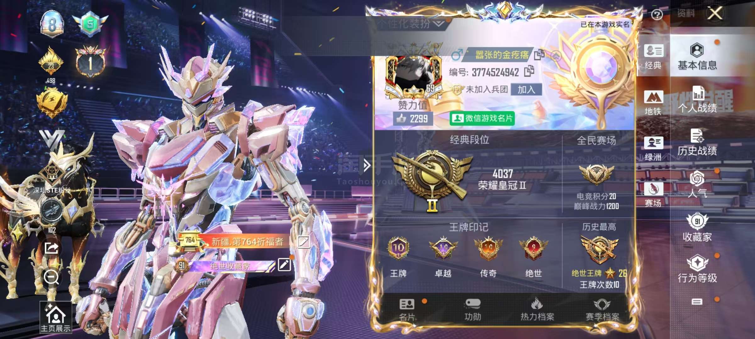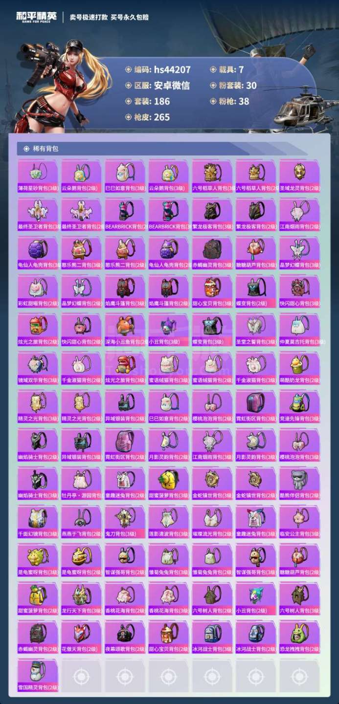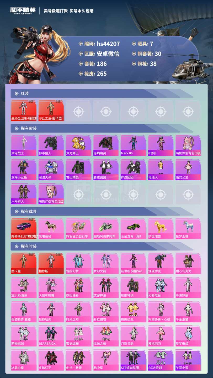 和平精英【安卓微信】hs44207 安卓v-10王牌印记-30粉装-38特效枪-7载具-122056热力值-186套装