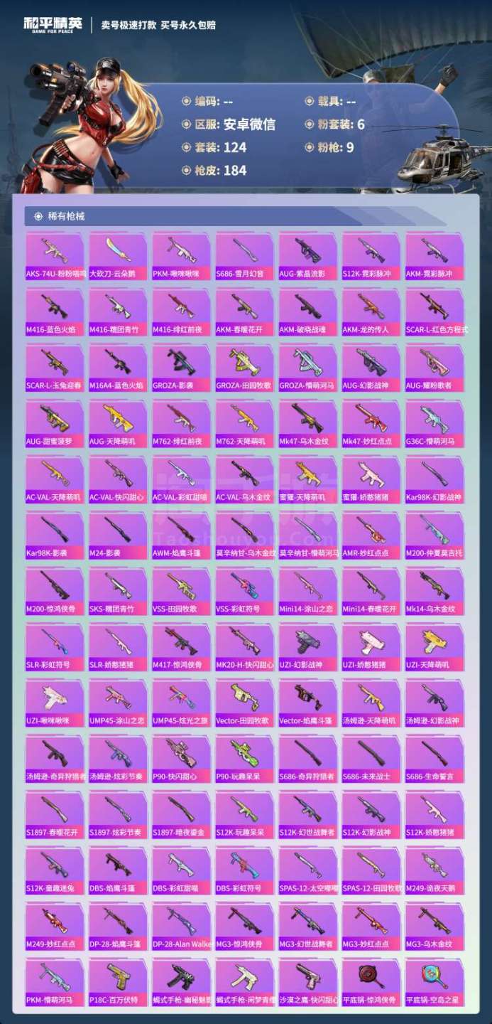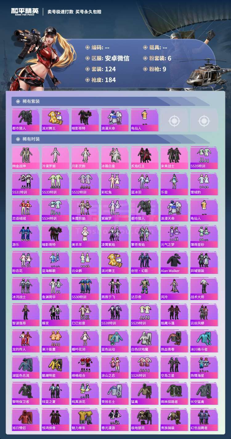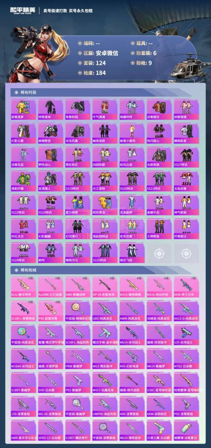 hs44188 安卓微-15王牌印记-6粉装-9特效枪-0载具-55125热力值-124套装-18