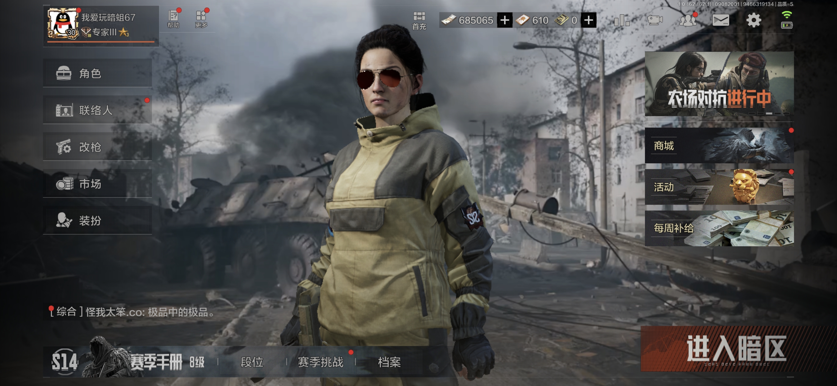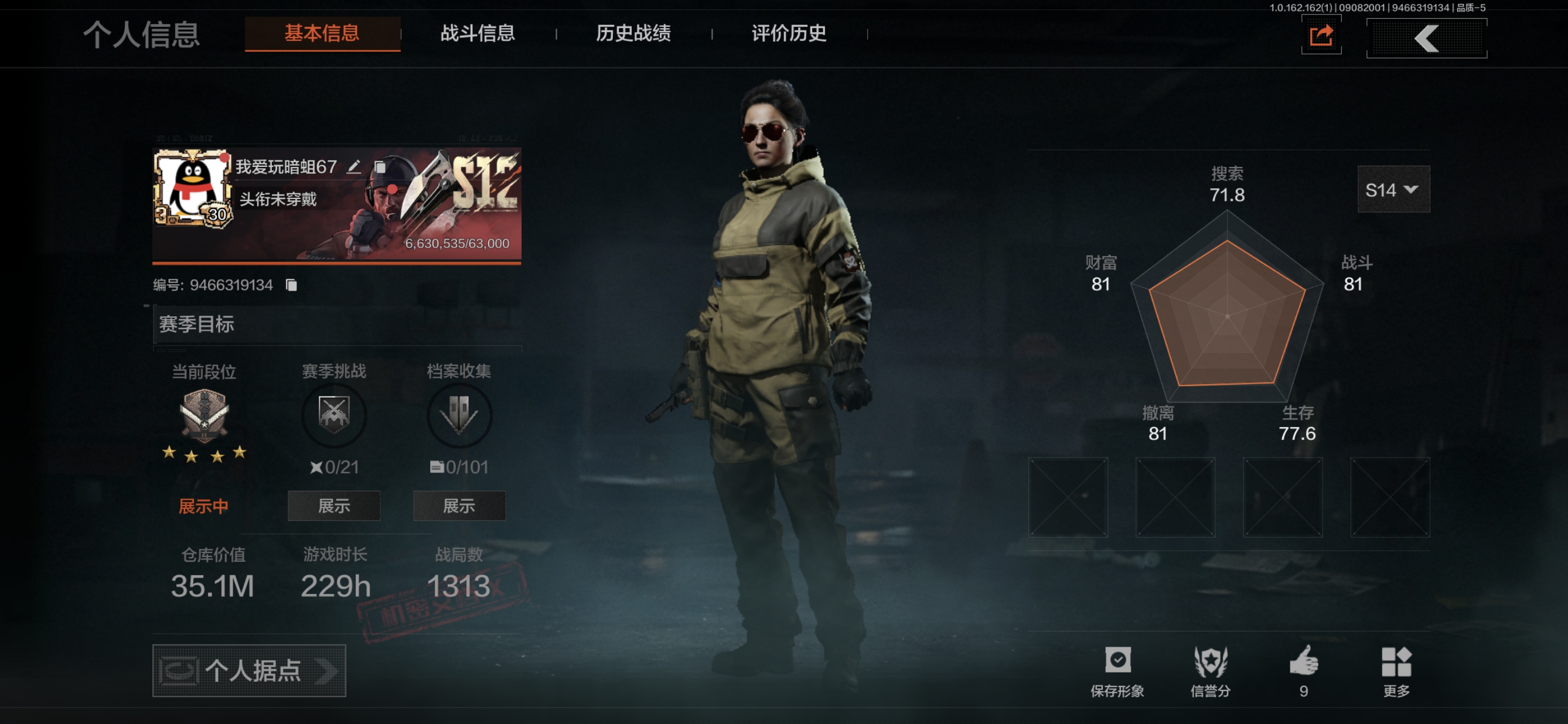 FY5468,总资产:35m,近战武器:,野战折刀,角色装扮(紫):,都市夜影套装,公司成员套装,鎏
