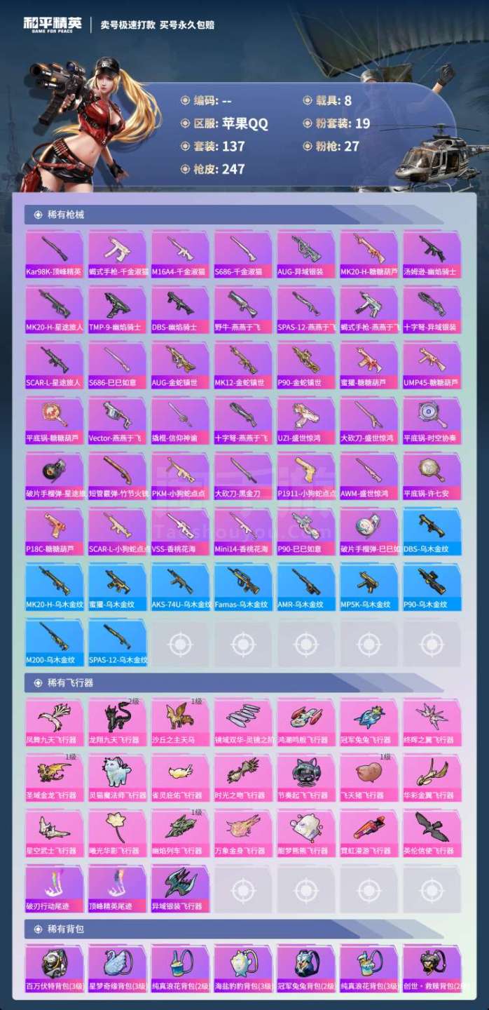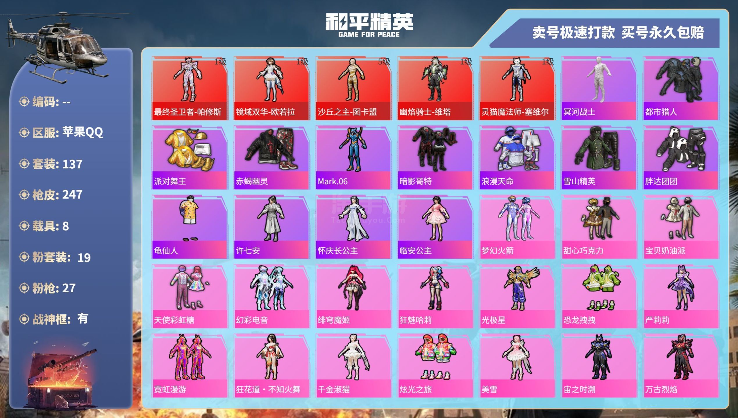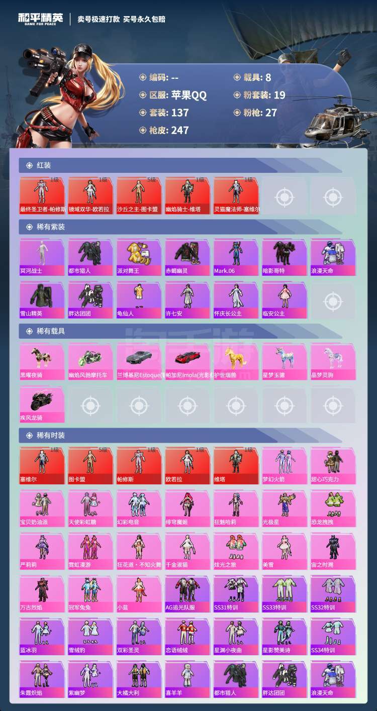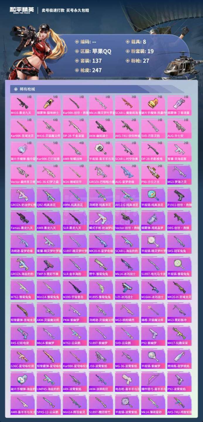 和平精英【苹果QQ】hs43960 苹果手Q-9王牌印记-有战神框-19粉装-27特效枪-8载具-107658热力值-1