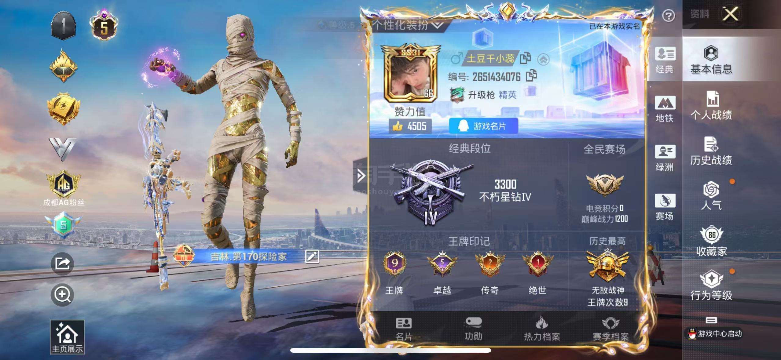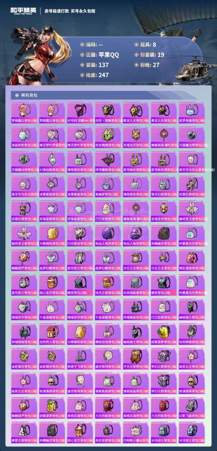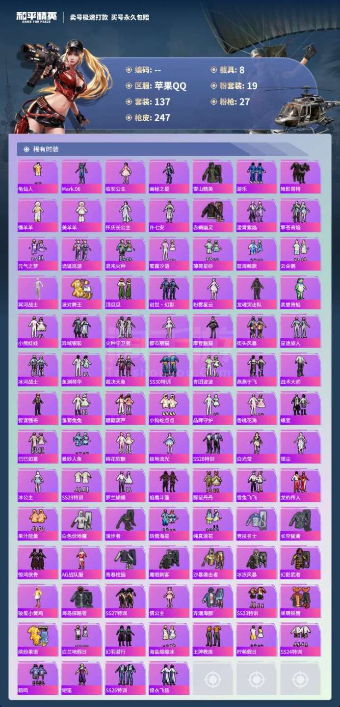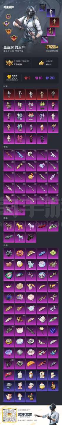 和平精英【苹果QQ】hs43960 苹果手Q-9王牌印记-有战神框-19粉装-27特效枪-8载具-107658热力值-1