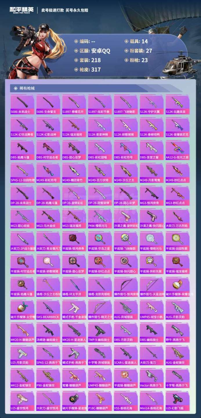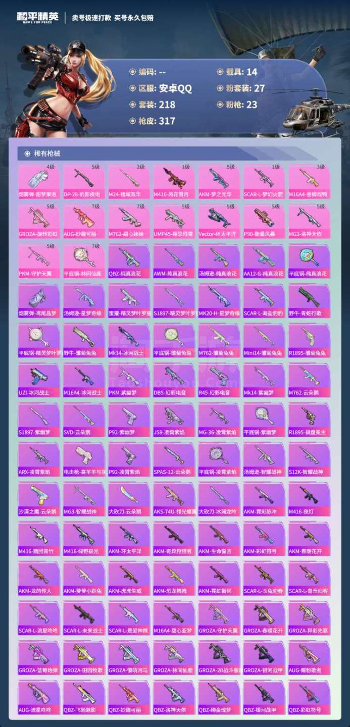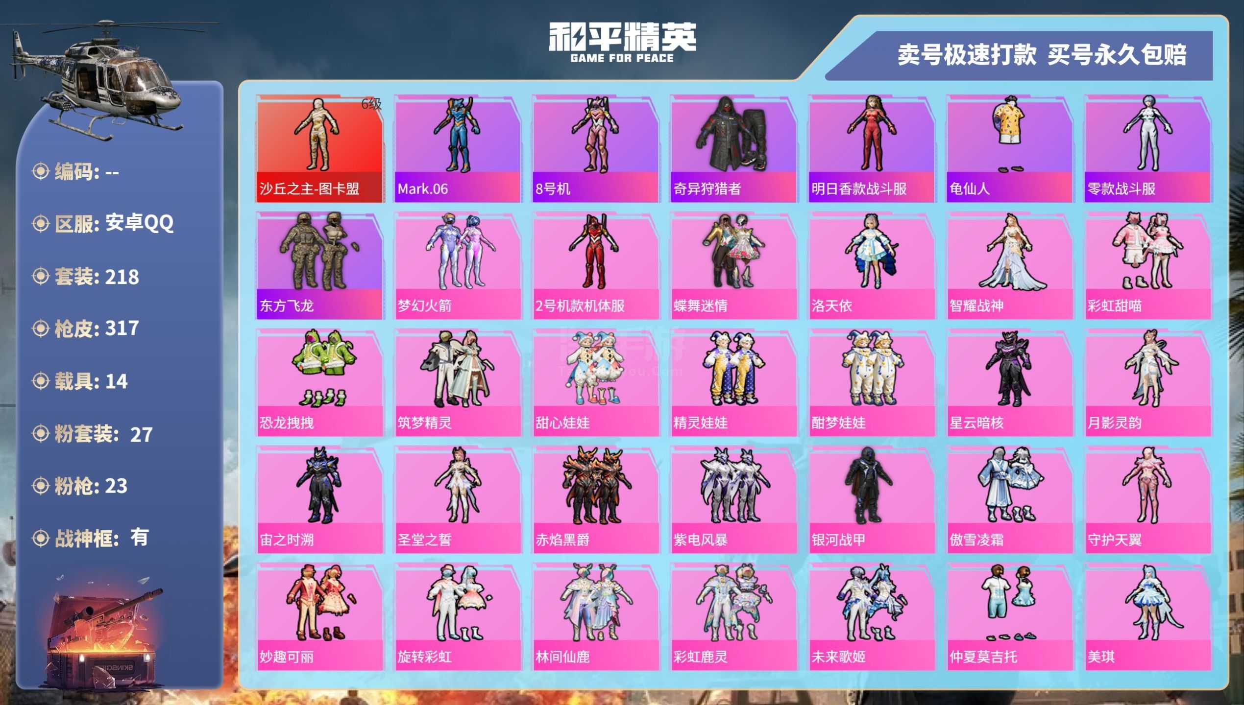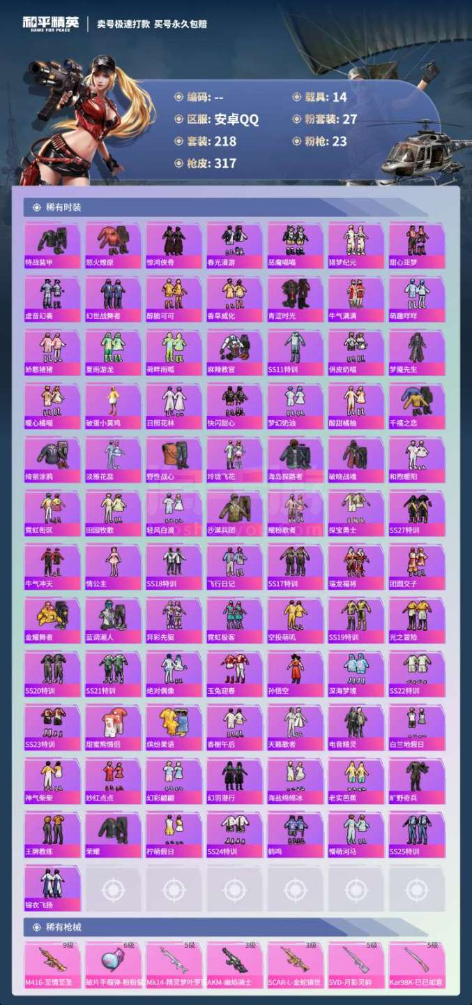 和平精英【安卓QQ】hs43980 安卓手Q-17王牌印记-有战神框-27粉装-23特效枪-14载具-148623热力值