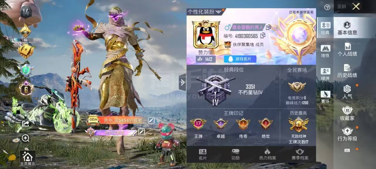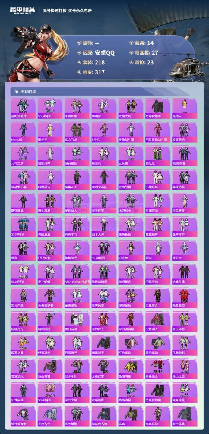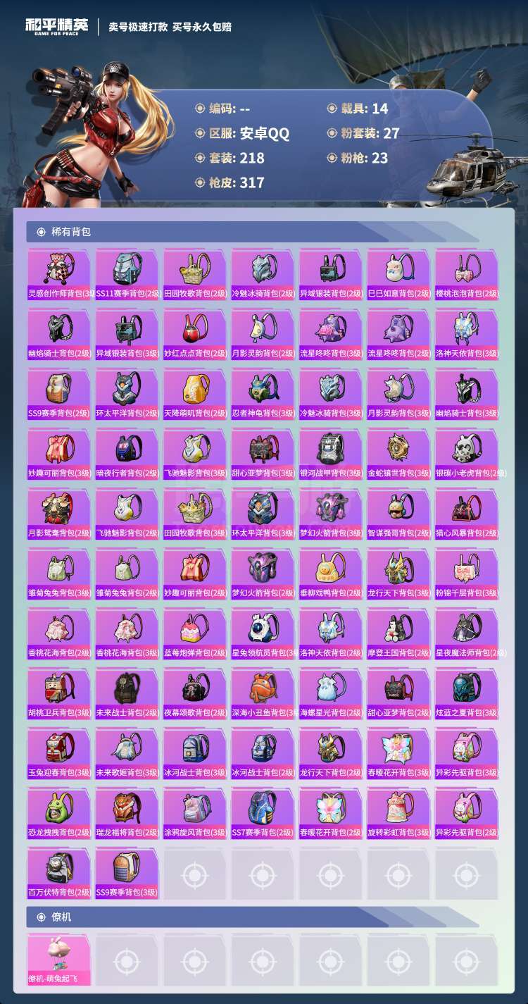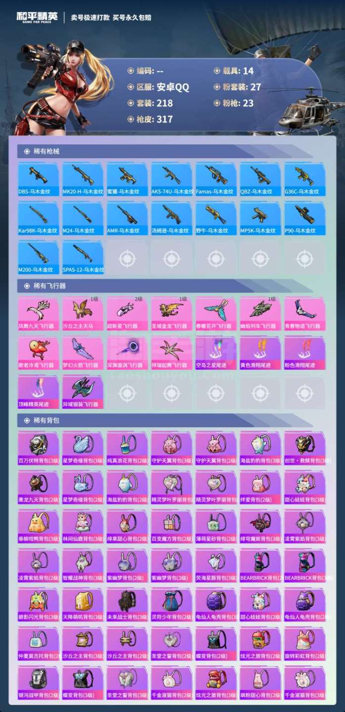 和平精英【安卓QQ】hs43980 安卓手Q-17王牌印记-有战神框-27粉装-23特效枪-14载具-148623热力值