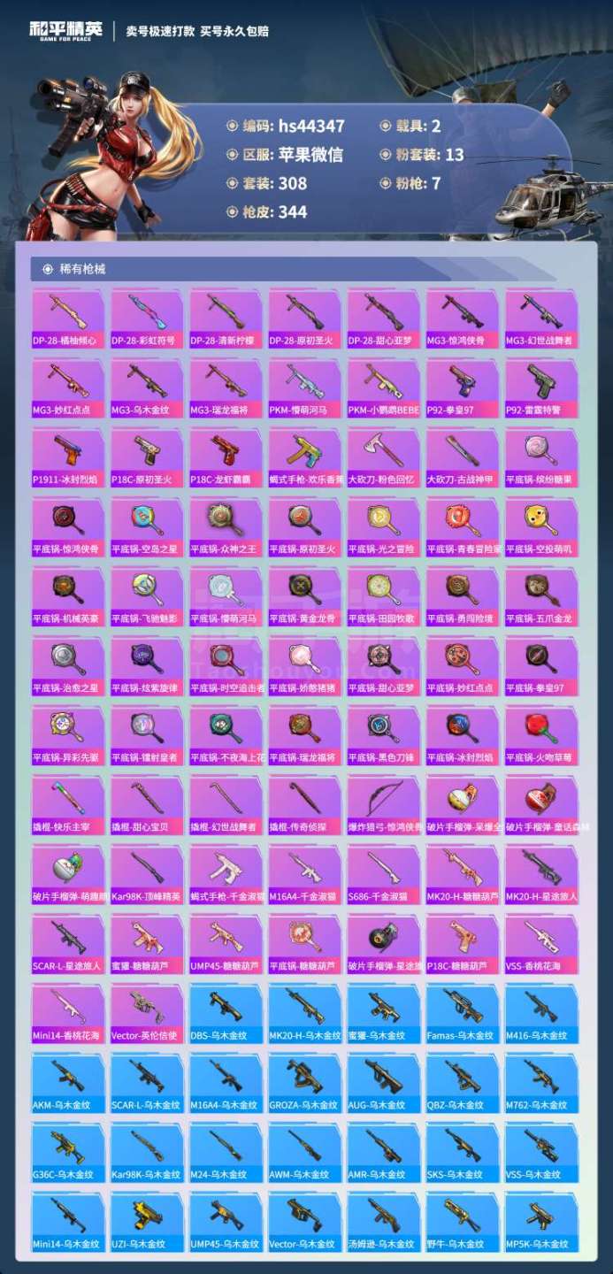 hs44347 苹果微-20王牌印记-13粉装-7特效枪-2载具-116058热力值-308套装-