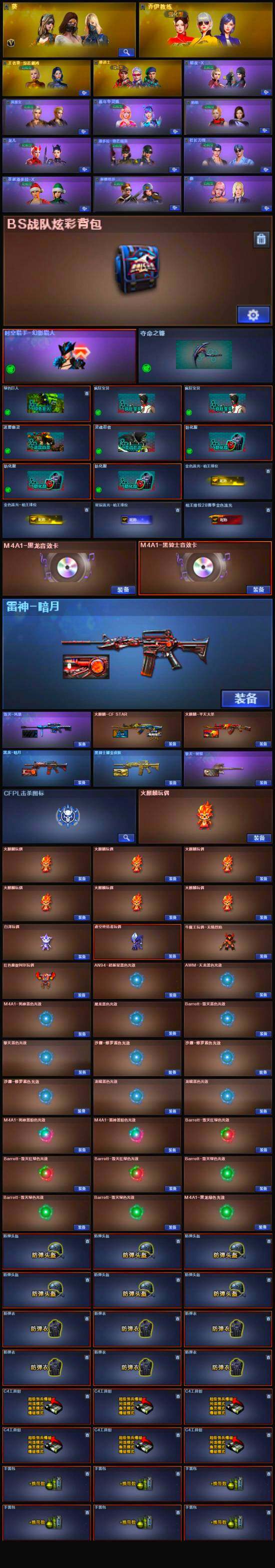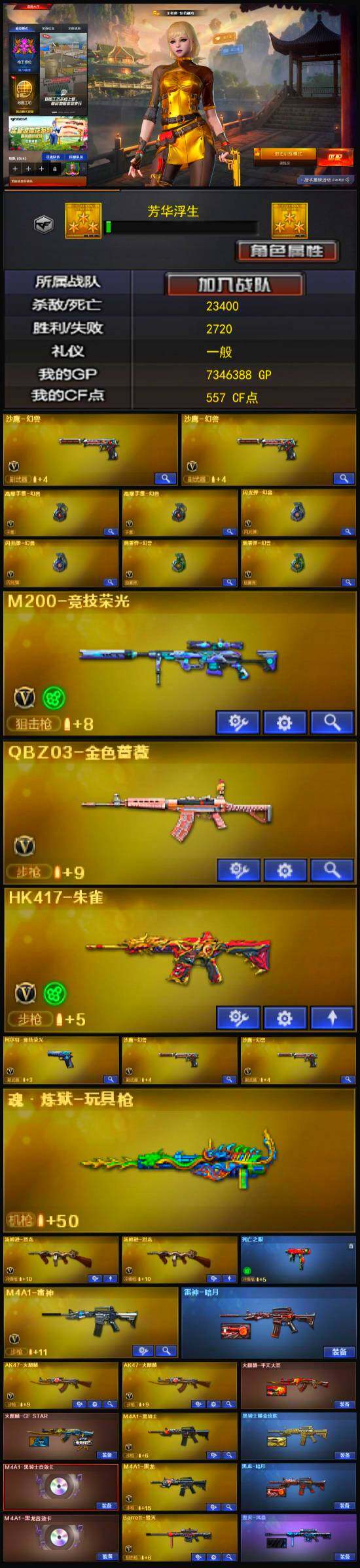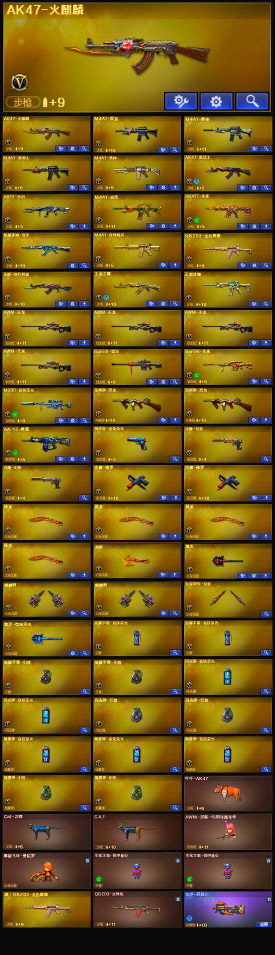 【热门武器】:QBZ03-金色蔷薇,HK417-朱雀,M200-竞技荣光,死亡之眼,金色小号,C.A.T,Cat-刀锋,牛牛-AK47,M4A1-黑骑士,汤姆逊-烈龙*2,沙鹰-修罗*2,高爆手雷-幻兽*2