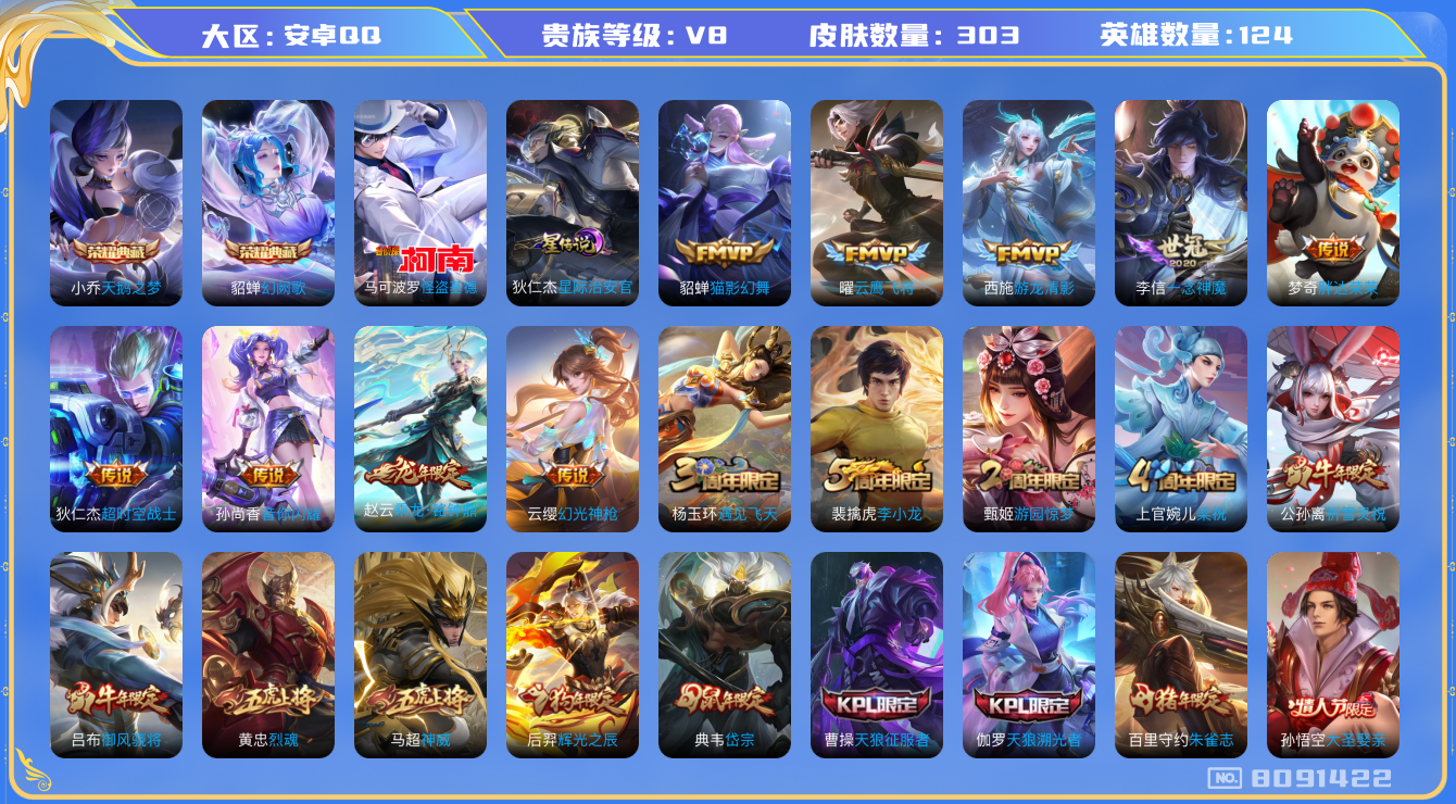 营地账号:475604198/[8091422]女号 富婆号 妹子号 303皮肤 2典藏 1珍品 1星传说 14传说 109限定 实名: 可修改 贵族等级: V8 荣耀水晶: 天鹅之梦,幻阙歌 珍品传说: 怪盗基德 星传说: 星际治安官 传说皮: 云鹰飞将,猫影幻舞,一念神魔,胖达荣荣,游龙清影,超时空战士-狄仁杰,音你闪耀,乘龙·铭钟鼎,幻光神枪 限定皮: 遇见飞天,李小龙,祈雪灵祝,游园惊梦