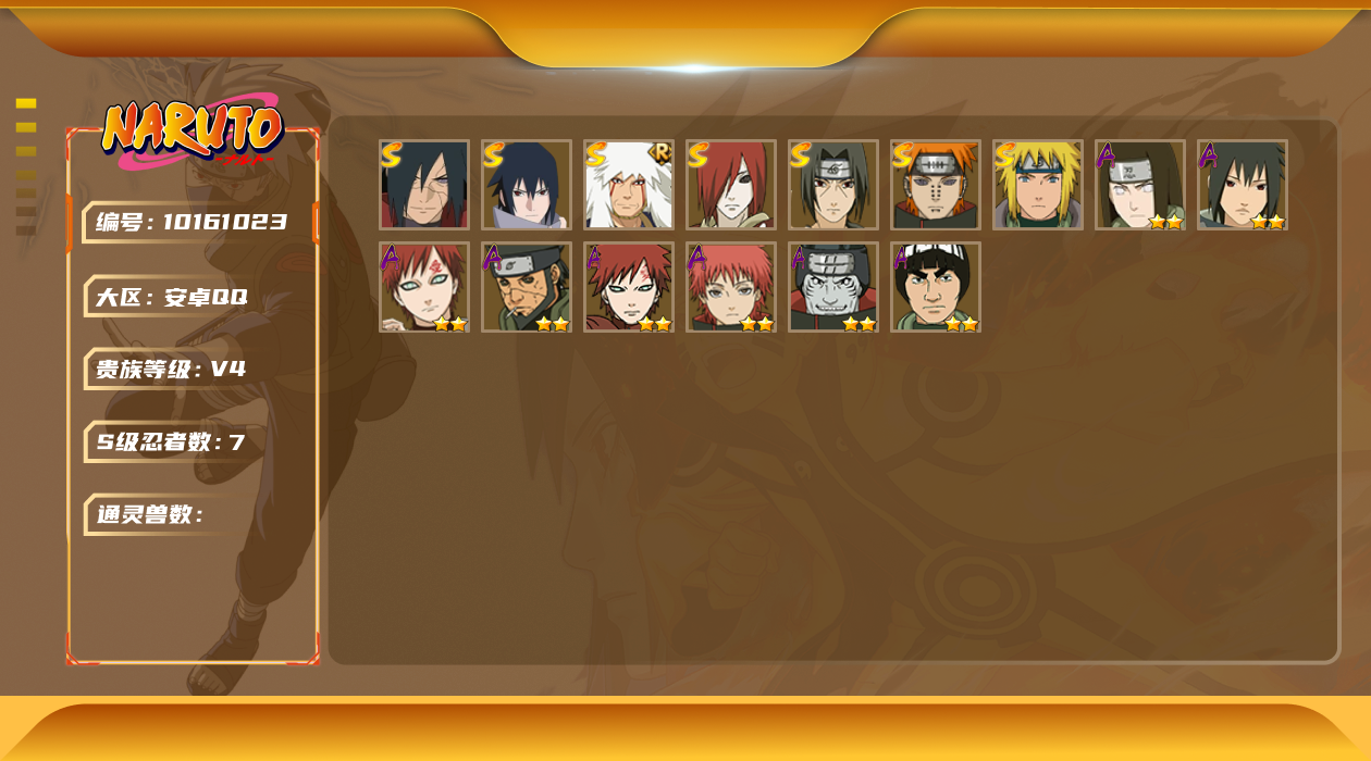 [10161023]7S! 贵族等级: V4 S忍数: 7 A忍数: 8 战力值(万): 286 S级忍者: 长门「秽土转生」,佩恩「天道」,波风水门,宇智波鼬 「须佐能乎」,自来也 「舞之豪杰」,宇智波佐助「永恒万花筒」,宇智波斑「秽土转生·解」 通灵兽: 忍犬,忍龟,蛤蟆吉,蓝蛇,猿魔,蛤蟆仙人,镰鼬,山椒鱼,蜃,鲛鲨,砂之守鹤