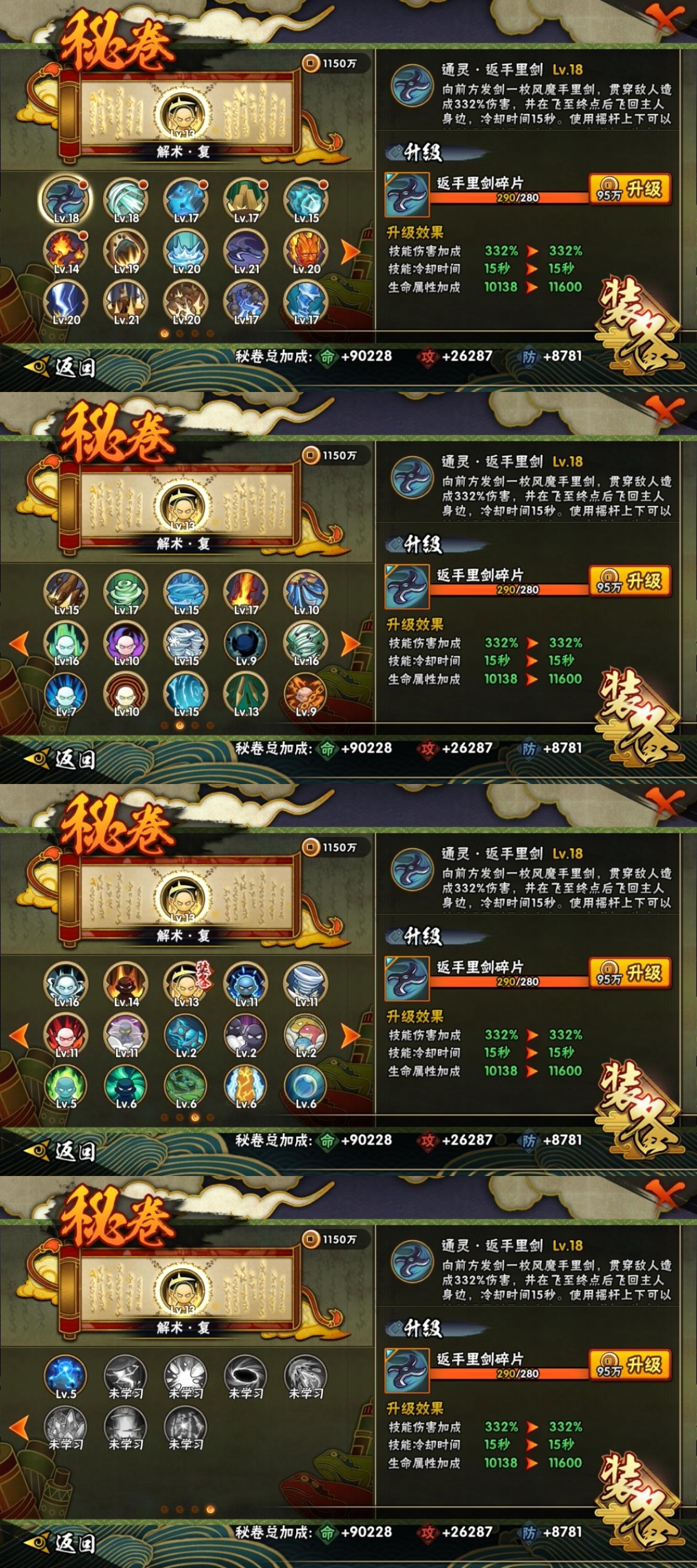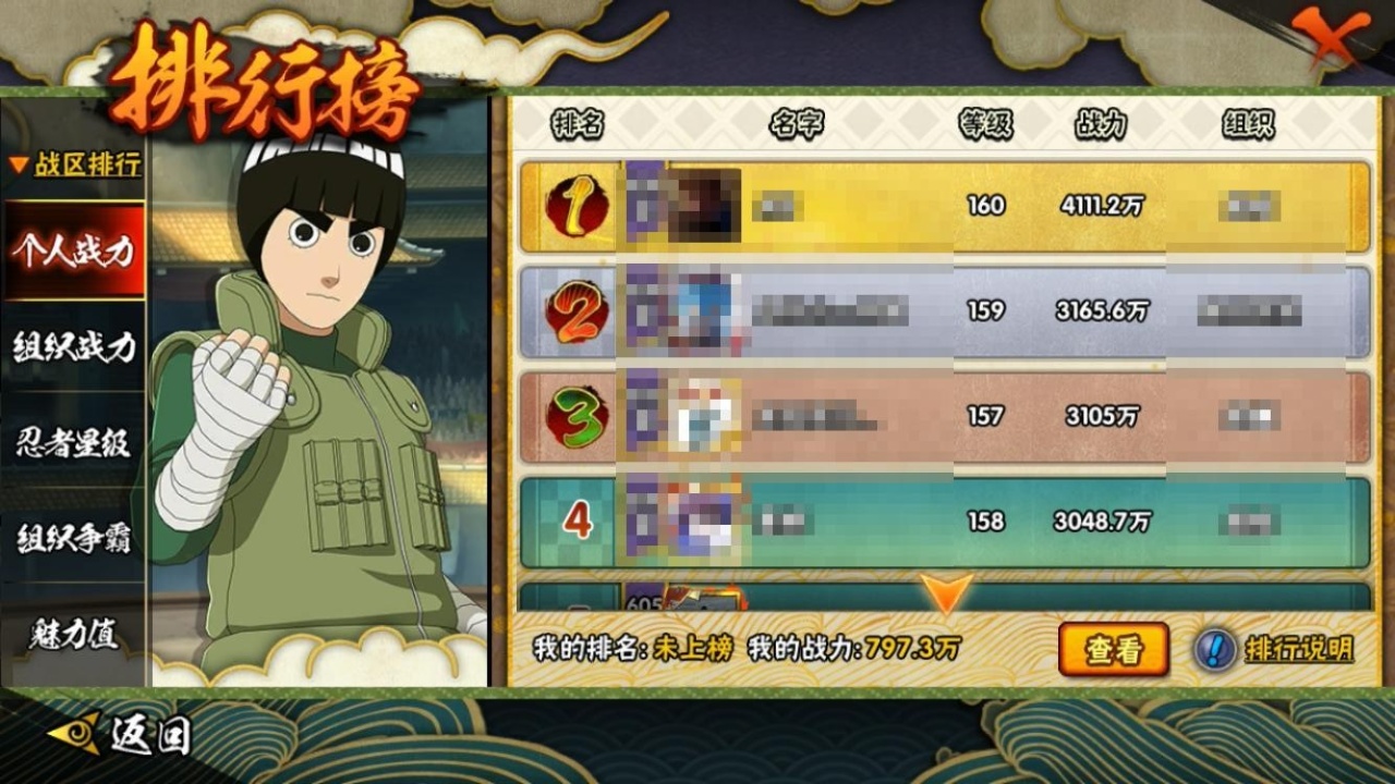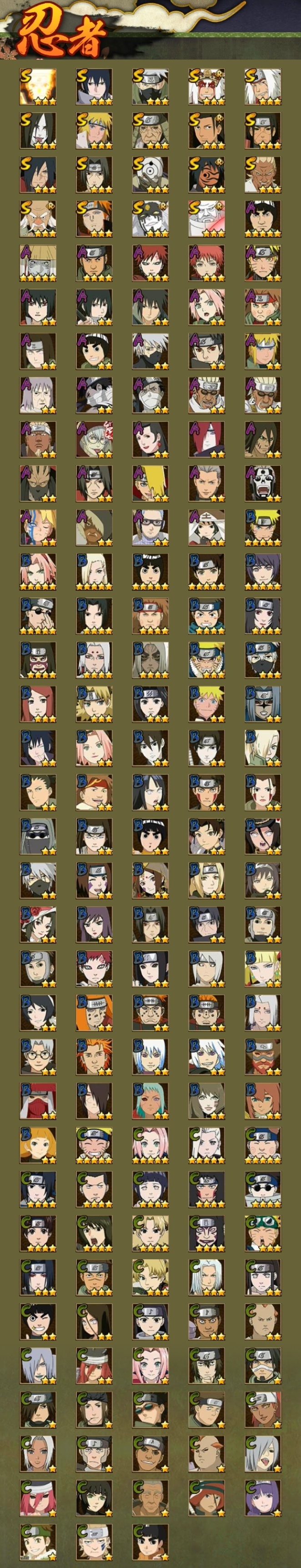 [10219369]19S!实名: 包人脸 贵族等级: V10 S忍数: 19 A忍数: 35 战力值(万): 797 S级忍者: 千手柱间「秽土转生」,猿飞日斩「秽土转生」,佩恩「天道」,大蛇丸,波风水门,宇智波鼬 「须佐能乎」,大野木 「忍界大战」,自来也 「舞之豪杰」,宇智波斑「白面具」,漩涡鸣人 「九喇嘛连结」,大筒木金式「博人传」,神秘面具男 「红夜之刃」,宇智波佐助「永恒万花筒」,千