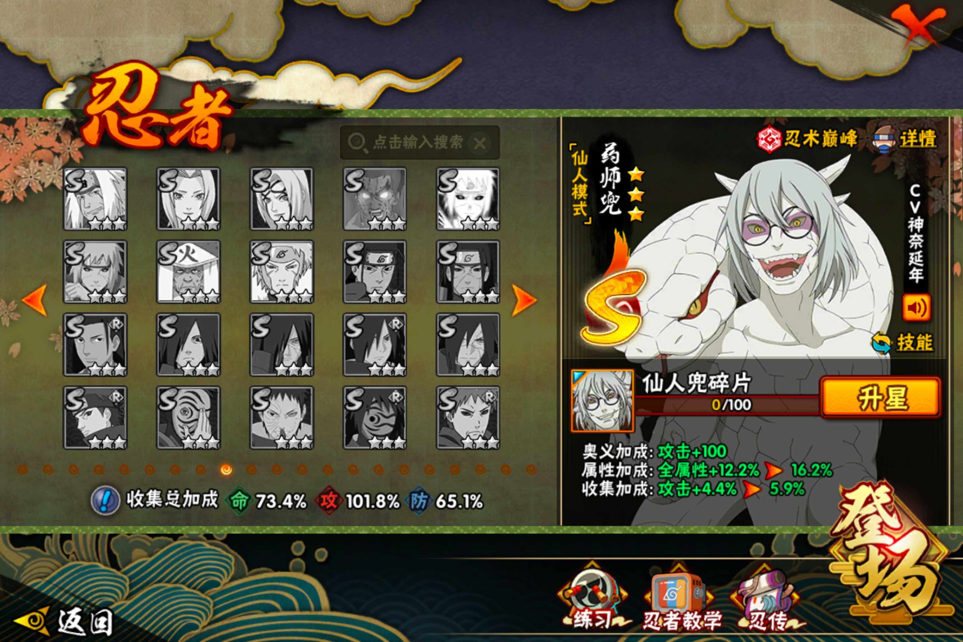 【S级忍者】:猿飞日斩「秽土转生」(3星),千手扉间「秽土转生」(3星),宇智波鼬「秽土转生」(3星),春野樱「忍界大战」(3星),宇智波鼬「须佐能乎」(3星),自来也「舞之豪杰」(3星),大蛇丸(3星),波风水门(3星),药师兜「仙人模式」(3星),漩涡鸣人「九喇嘛连结」(3星),佩恩「天道」(3星),宇智波佐助「永恒万花筒」(3星),宇智波