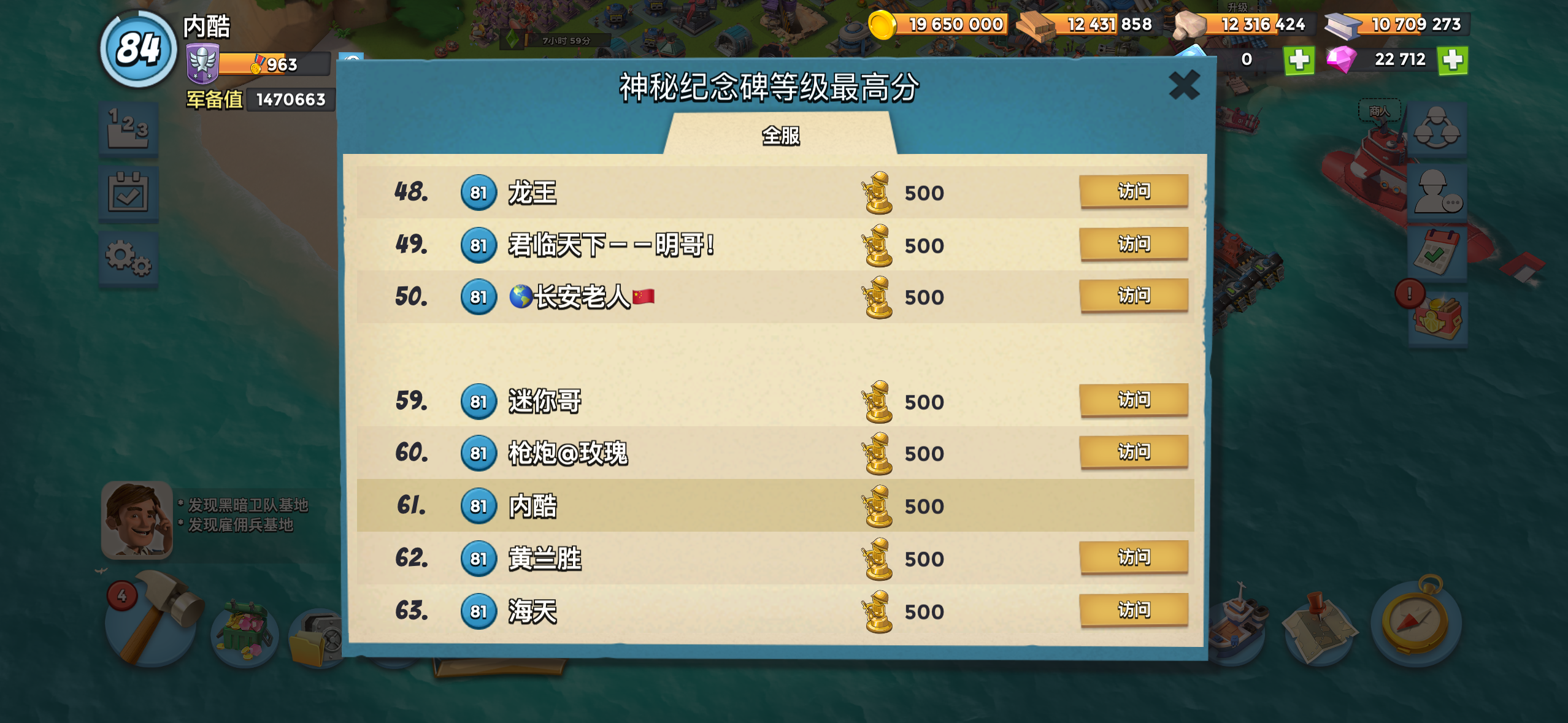 84建筑满级,资源很多,纪念碑也是满级的,可以冲榜的号