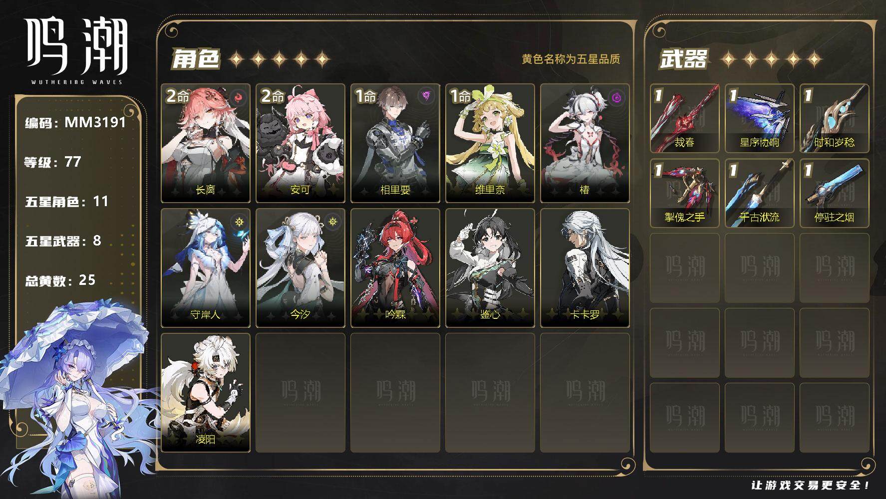【MM3191】【MF2186 0+1椿 0+1守岸人 】77级/25黄/女主/11个五星角色/8个五星武器