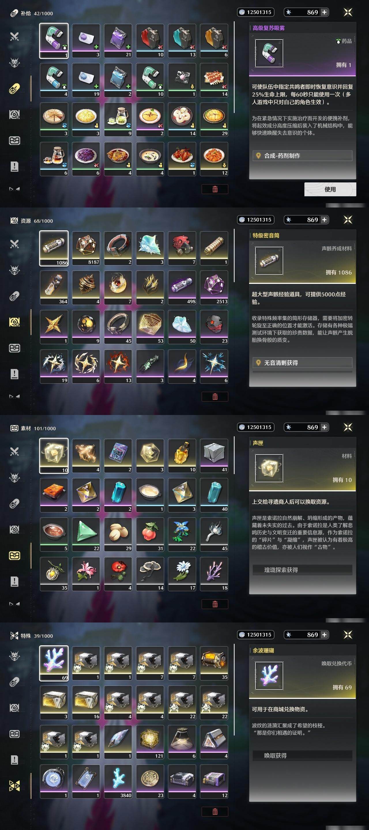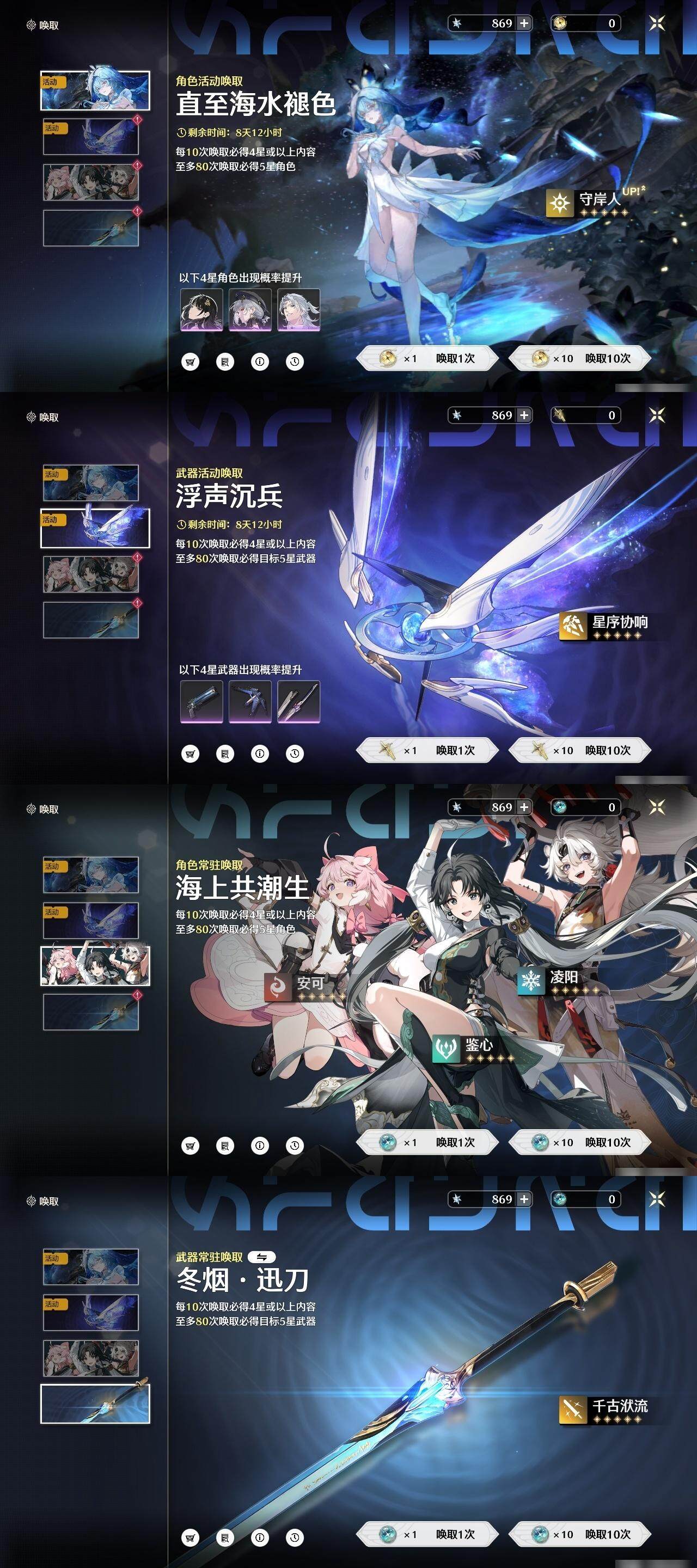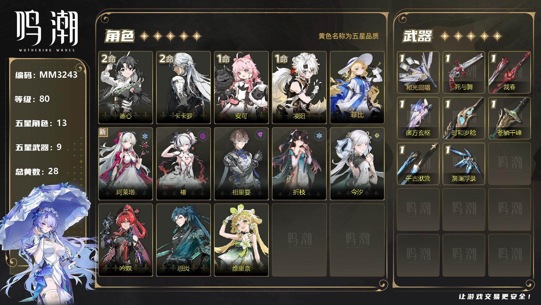 未绑定,菲比,珂莱塔,椿,相里要,折枝,今汐,吟霖,忌炎,维里奈,鉴心,卡卡罗,安可,凌阳,和光回唱,死与舞,裁春,诸方玄枢,时和岁稔,苍鳞千嶂,千古洑流,漪澜浮录,2命鉴心,2命卡卡罗,1命安可,1命凌阳,0命菲比,0命珂莱塔,0命椿,0命相里要,0命折枝,0命今汐,0