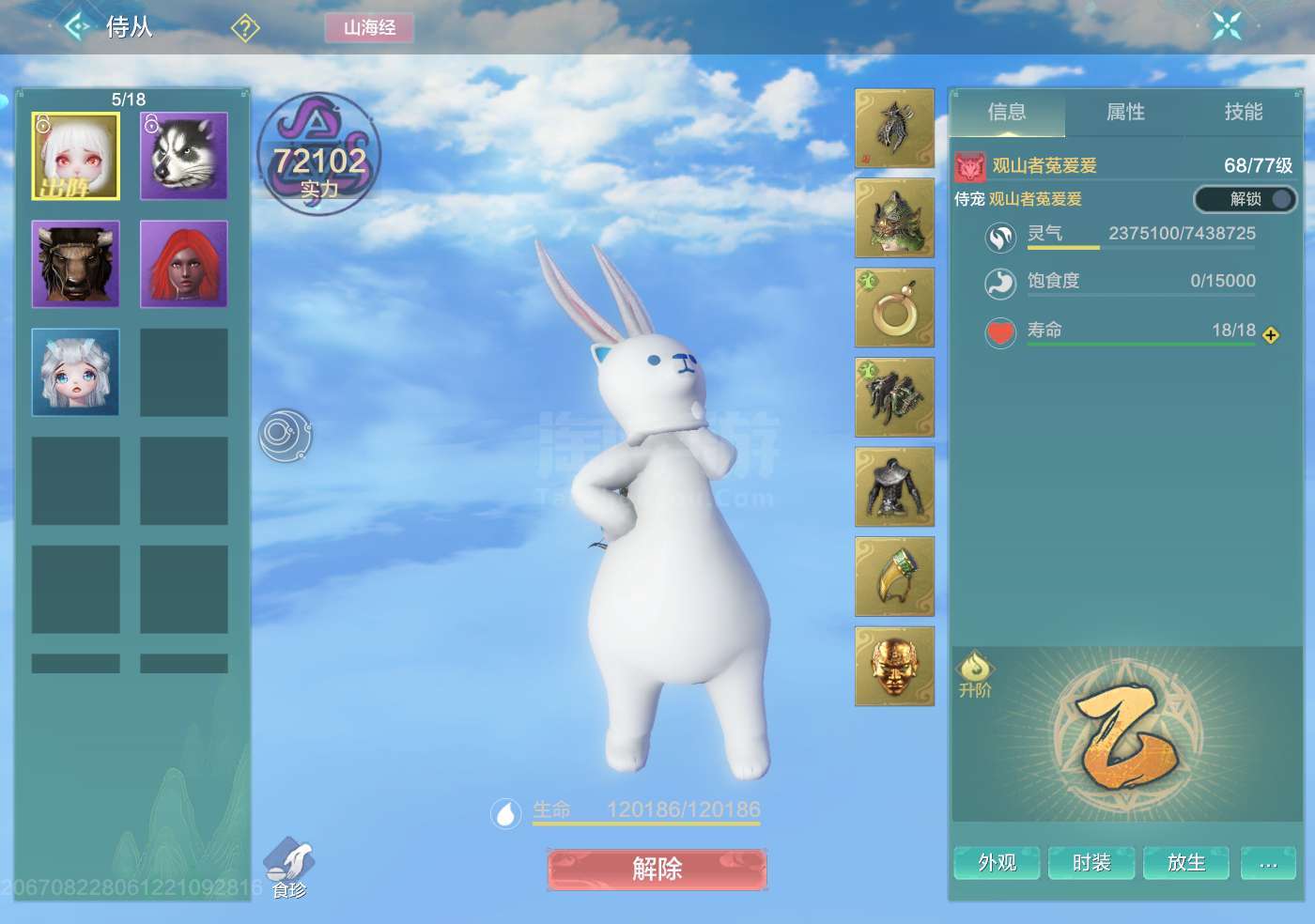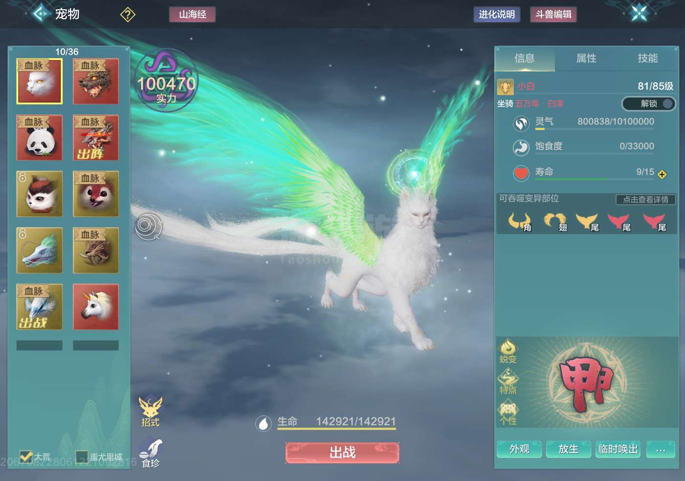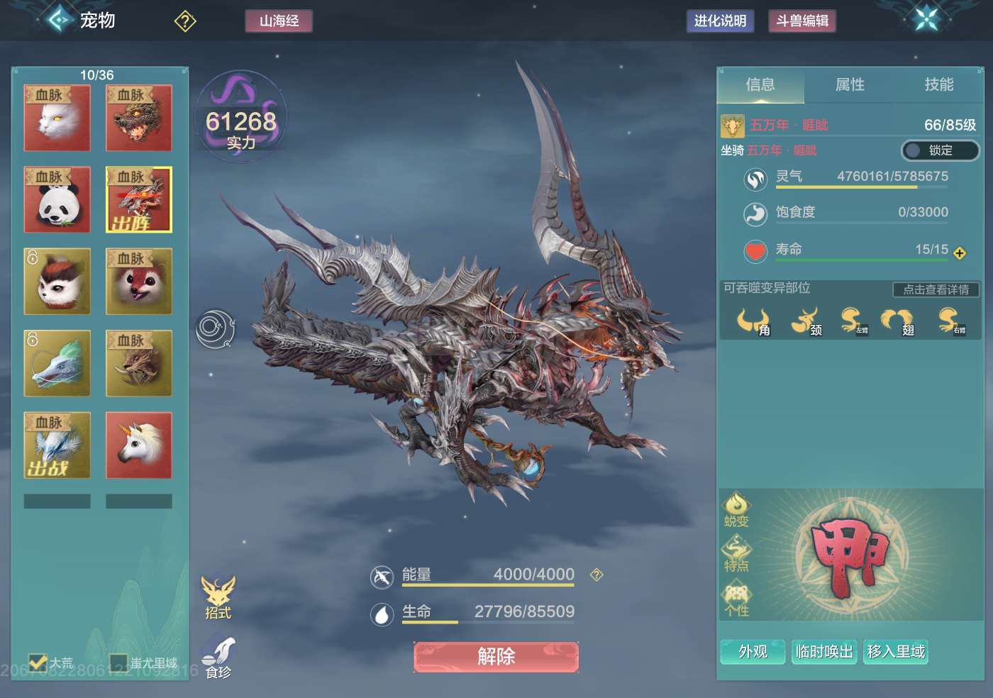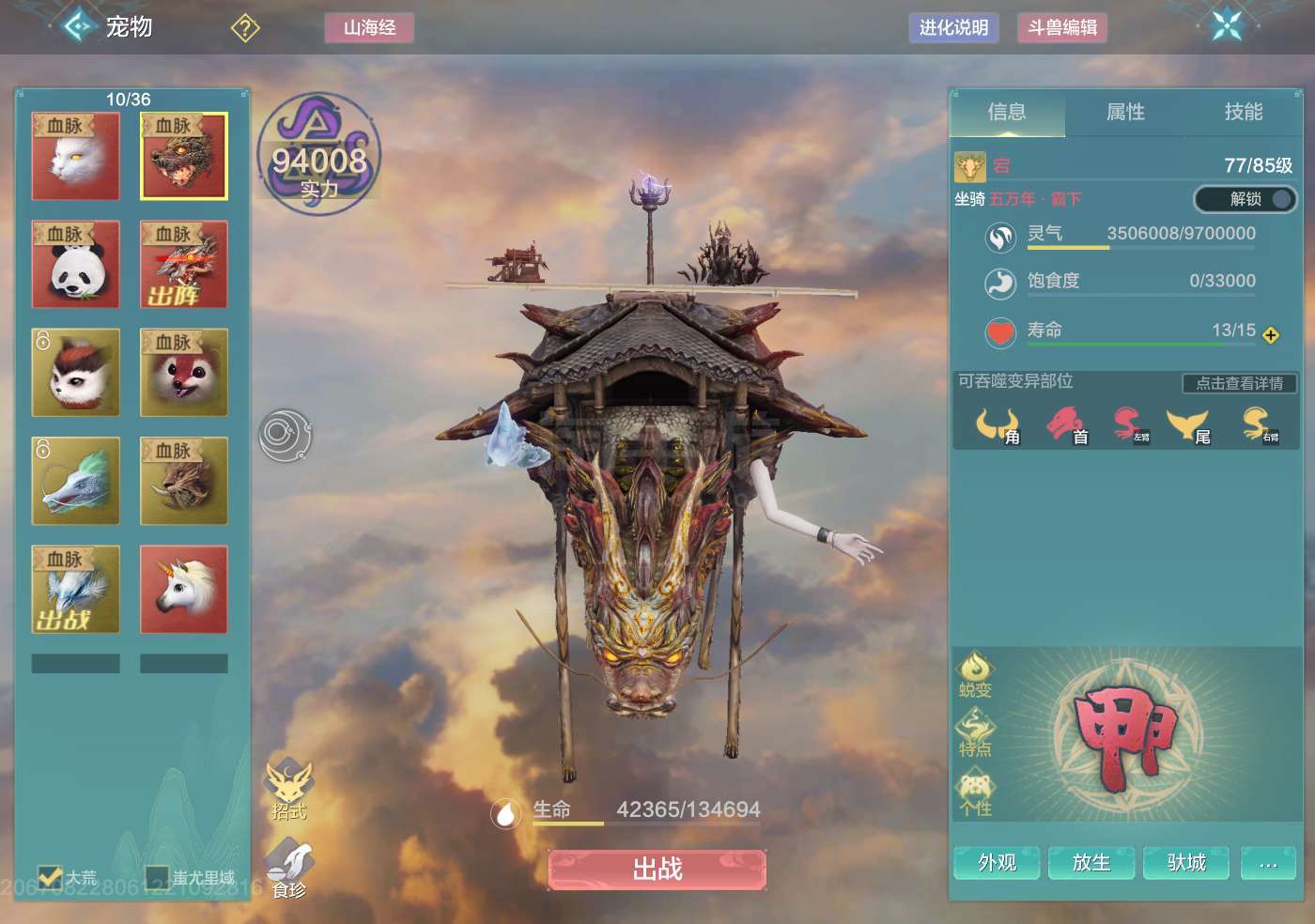 妄想山海【安卓QQ】10万战力,4个双甲级宠物,白泽 霸下 睚眦 熊猫,侍从兔媛媛,木元素攻击2400