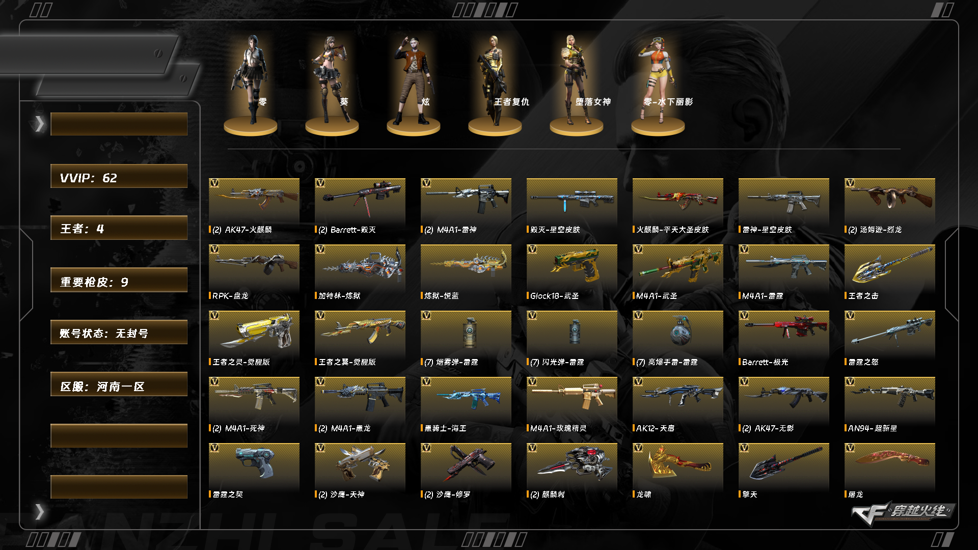 皇冠Q 穿越火线(CF)-北部战区-河南一区 【Lv.100 高阶大元帅】 62V,4王者,毁灭星空/极光能量核心/火麒麟平天大圣/雷神能量核心/雷神星空/黑龙能量核心/死神秘银/天启暗月/修罗能量核心/_零/_葵/_炫/Barrett-毁灭(2)/Barrett-极光/雷霆之怒/M4A1-雷神(2)/M4A1-死神(2)/M4A1-雷神音效卡/Barrett-毁灭音效卡 【重要角色】_零/_葵/