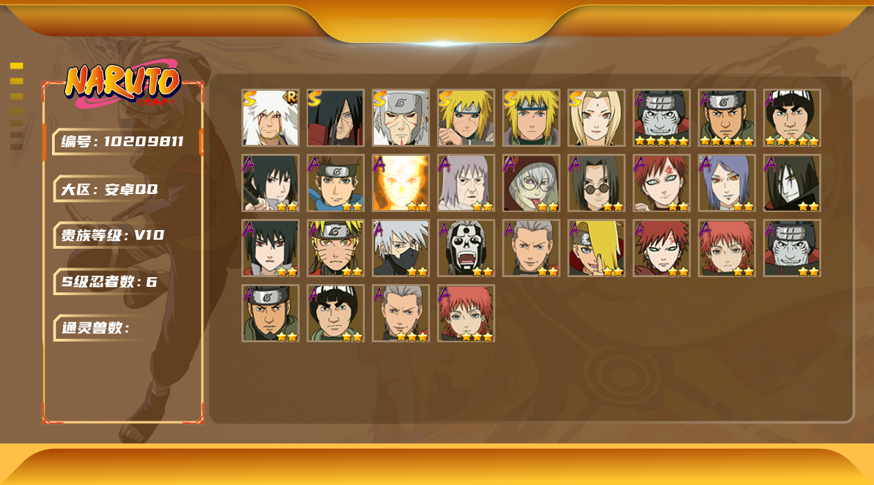 [10209811]6S!实名: 可修改 贵族等级: V10 S忍数: 6 A忍数: 20 战力值(万): 596 S级忍者: 宇智波斑「秽土转生」,千手扉间「秽土转生」,波风水门「秽土转生」,波风水门,纲手,自来也 「舞之豪杰」 通灵兽: 忍犬,忍龟,蛤蟆吉,蓝蛇,猿魔,蛞蝓,蛤蟆仙人,镰鼬,山椒鱼,蜃,鲛鲨,蛤蟆健,乌鸦,蛤蟆龙,砂之守鹤