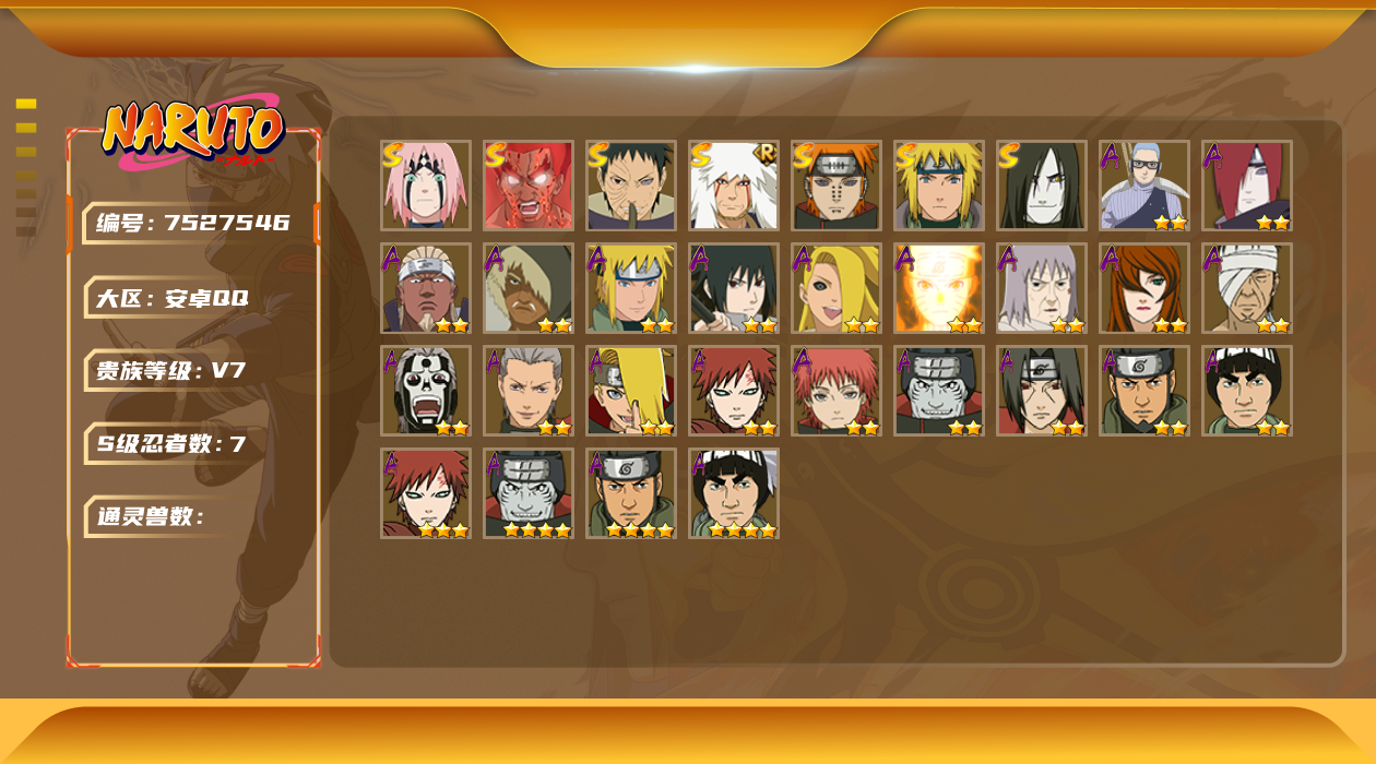 [7527546]实名: 可修改 贵族等级: V7 S忍数: 7 A忍数: 20 S级忍者: 佩恩「天道」,大蛇丸,波风水门,迈特凯「死门」,宇智波带土 「忍界大战」,自来也 「舞之豪杰」,春野樱 「忍界大战」 通灵兽: 忍犬,忍龟,蛤蟆吉,蓝蛇,猿魔,蛤蟆仙人,镰鼬,山椒鱼,蜃,鲛鲨,蛤蟆健,乌鸦,砂之守鹤