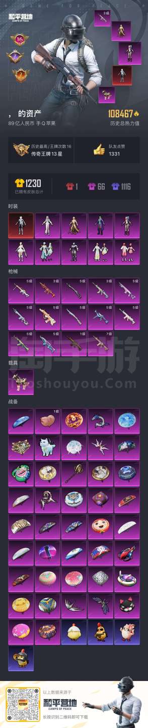 hs44223 苹果手Q-16王牌印记-9粉装-14特效枪-1载具-108467热力值-204套装-