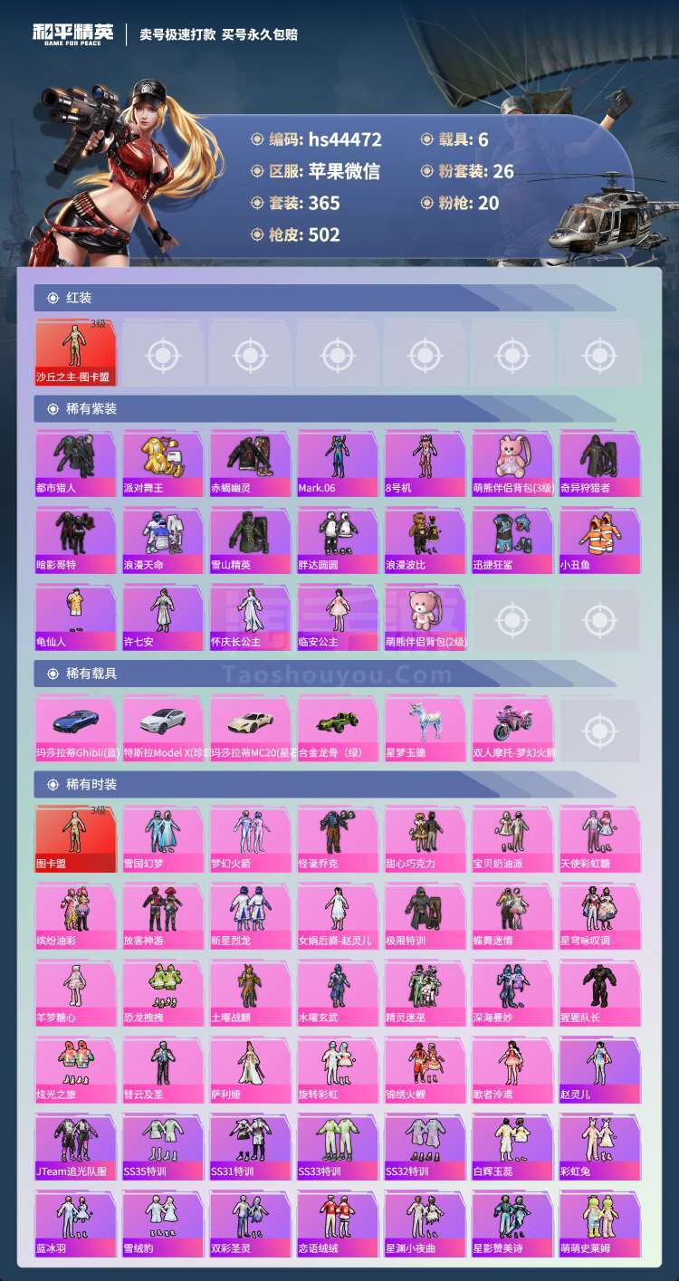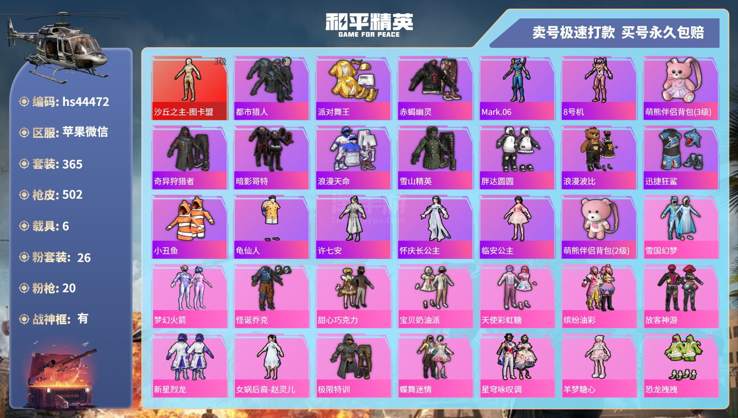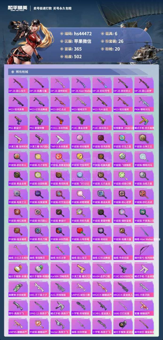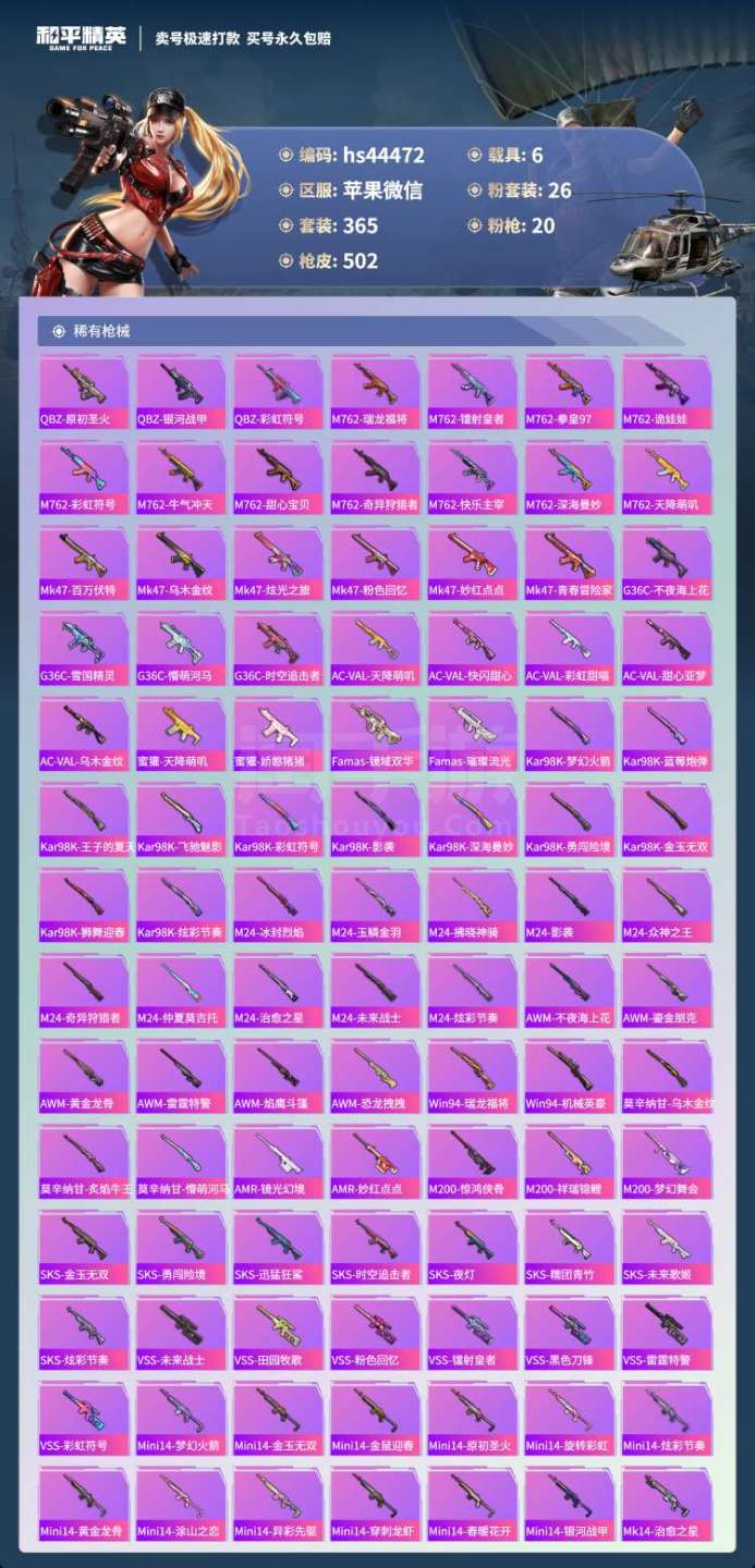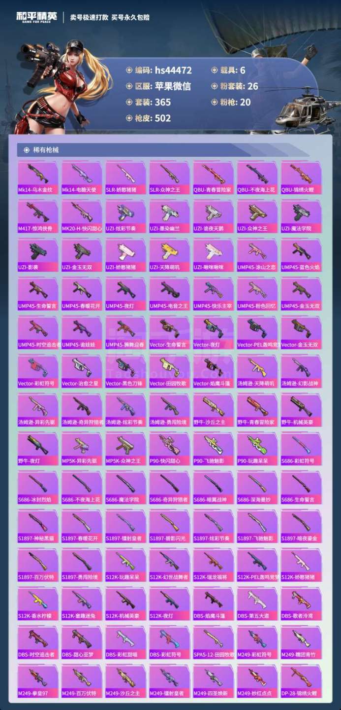 hs44472 苹果微-25王牌印记-有战神框-26粉装-20特效枪-6载具-180188热力值-