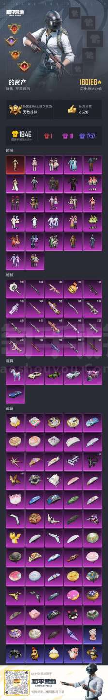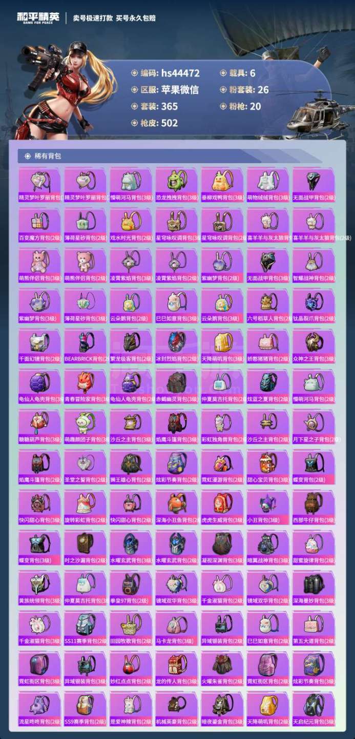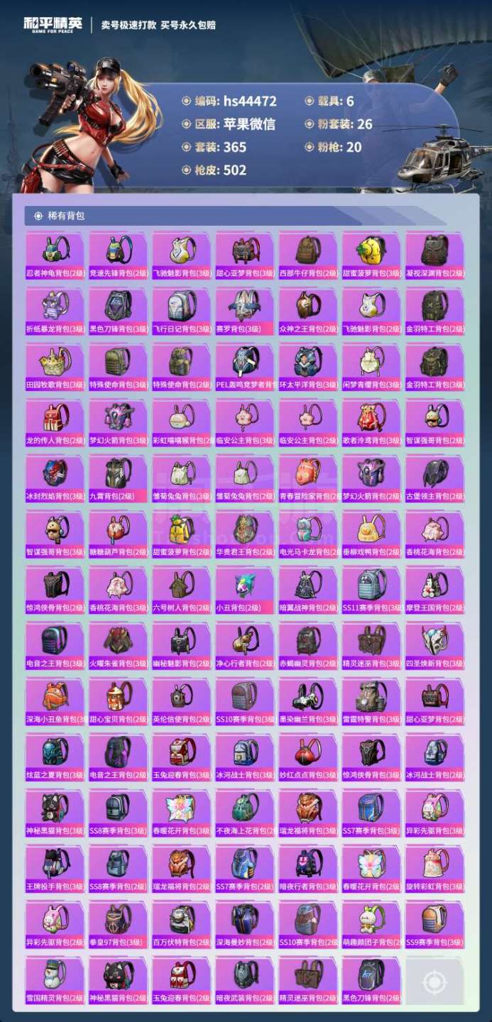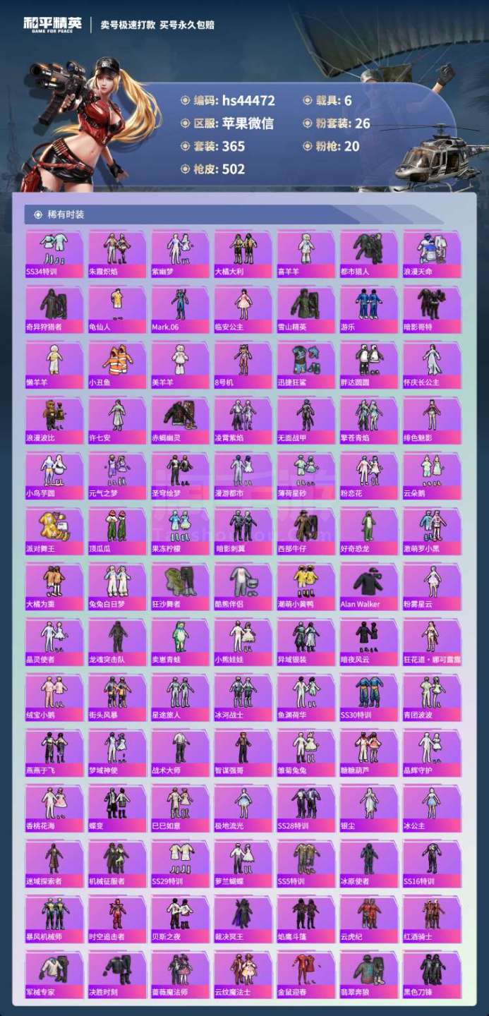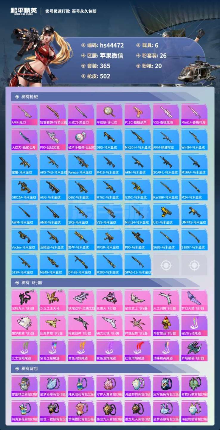 hs44472 苹果微-25王牌印记-有战神框-26粉装-20特效枪-6载具-180188热力值-