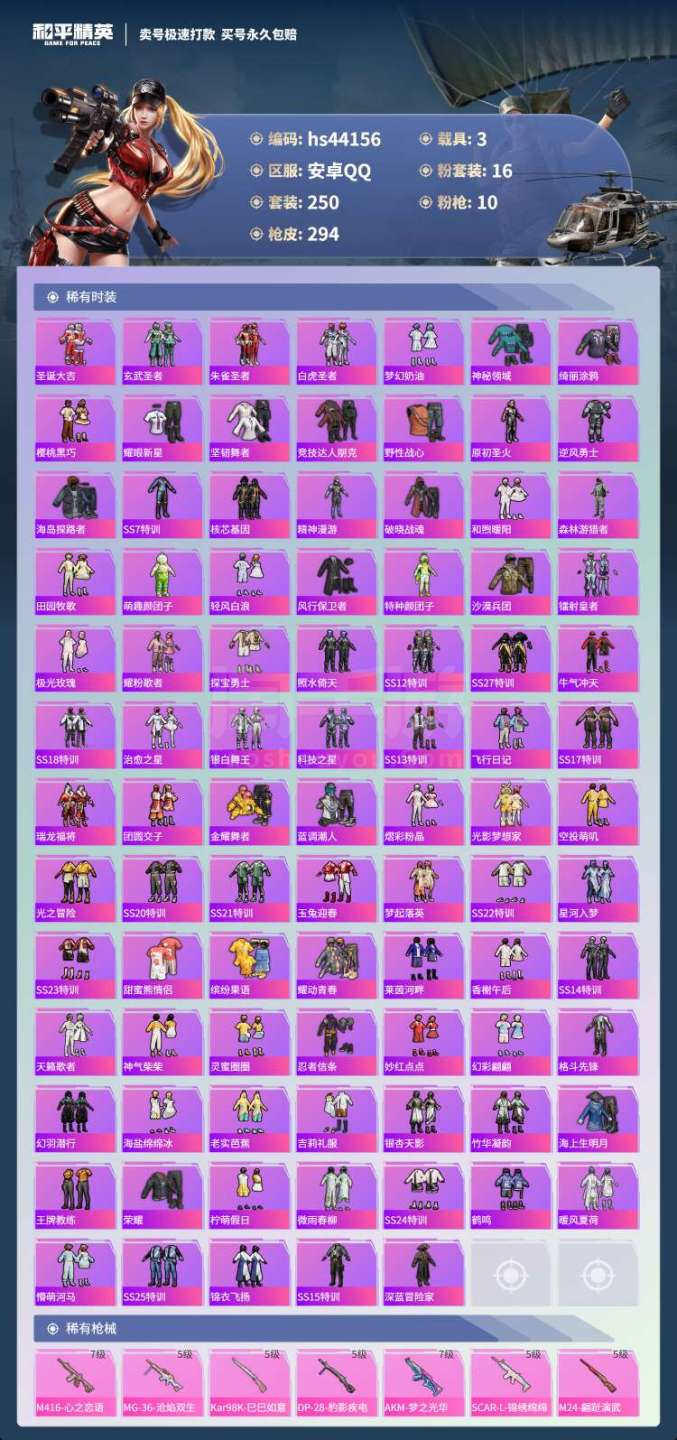 hs44156 安卓手Q-11王牌印记-16粉装-10特效枪-3载具-109310热力值-250套装