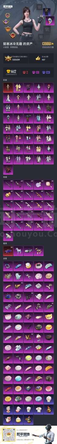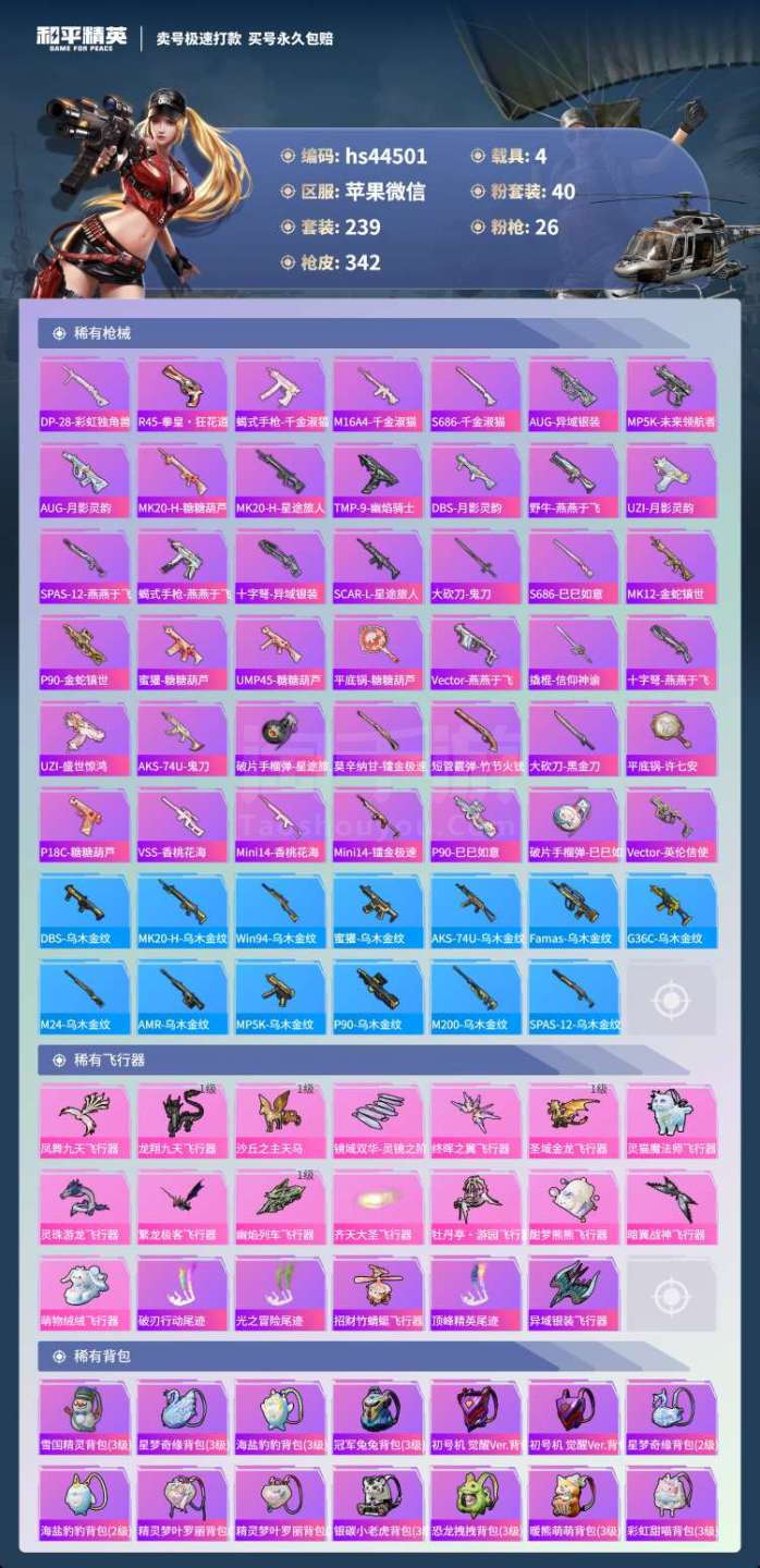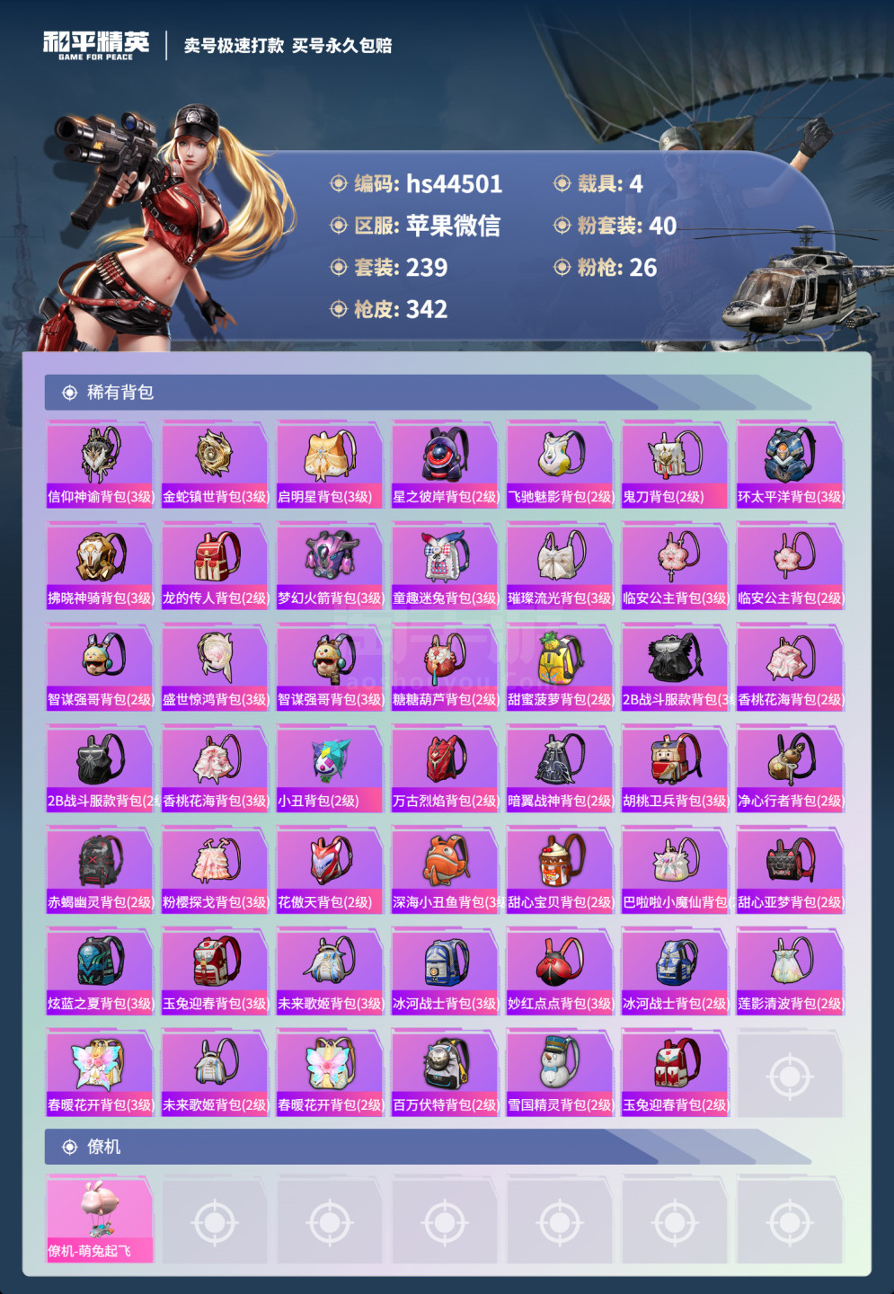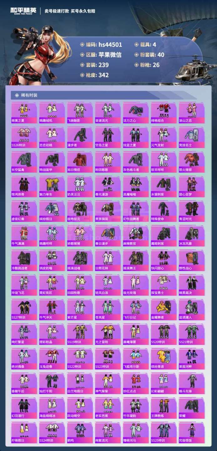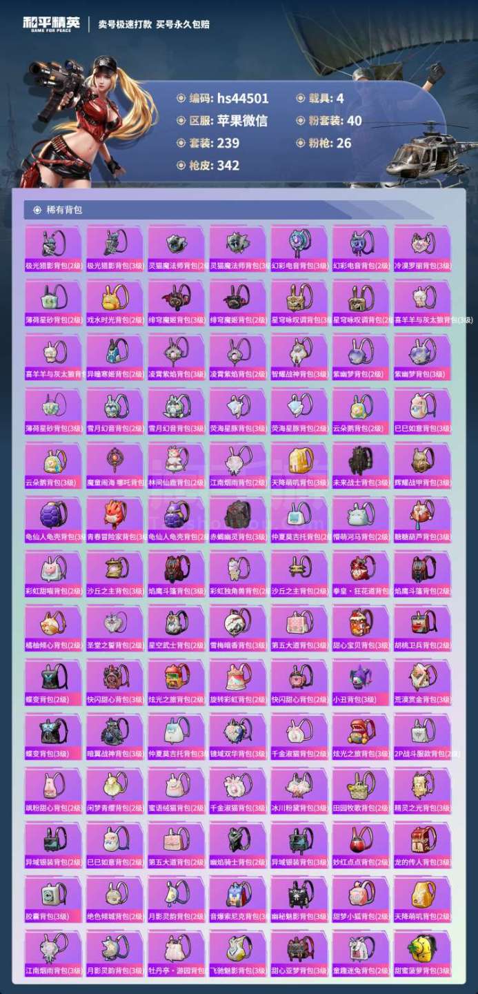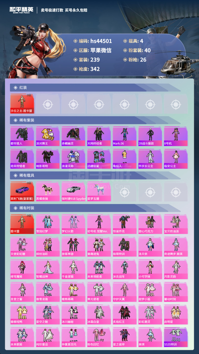 和平精英【苹果微信】hs44501 苹果微-12王牌印记-有战神框-40粉装-26特效枪-4载具-139861热力值-